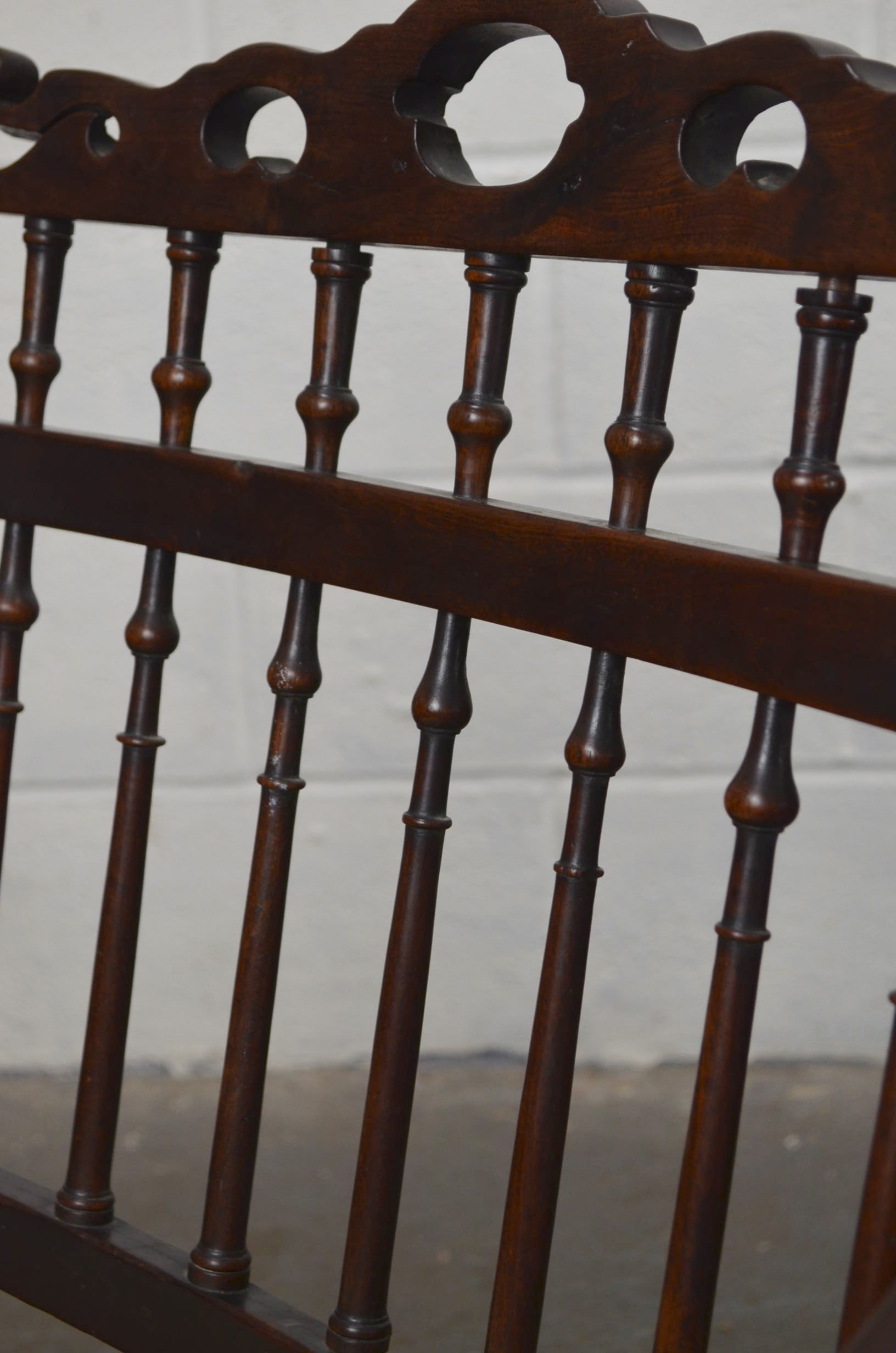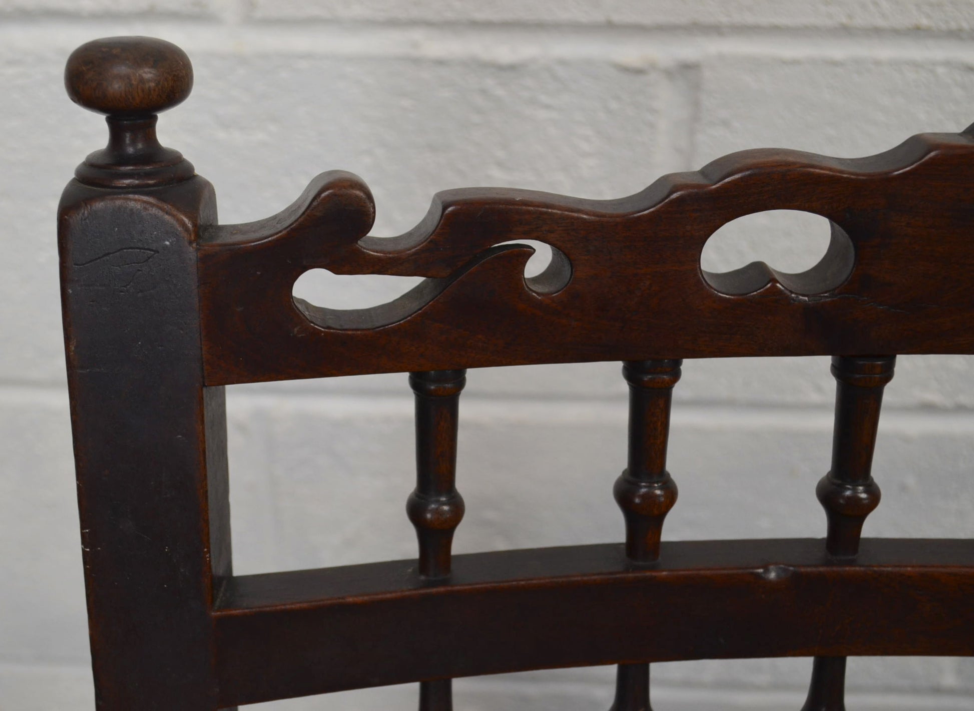 An 18th century armchair commonly referred to as a drunkards chair due to its sturdy design and wide seat. Spindle back with pierced top rail and turned finials above and upholstered seat and square legs. This one would have had a ski like bar linking the feet which is missing. Priced accordingly.