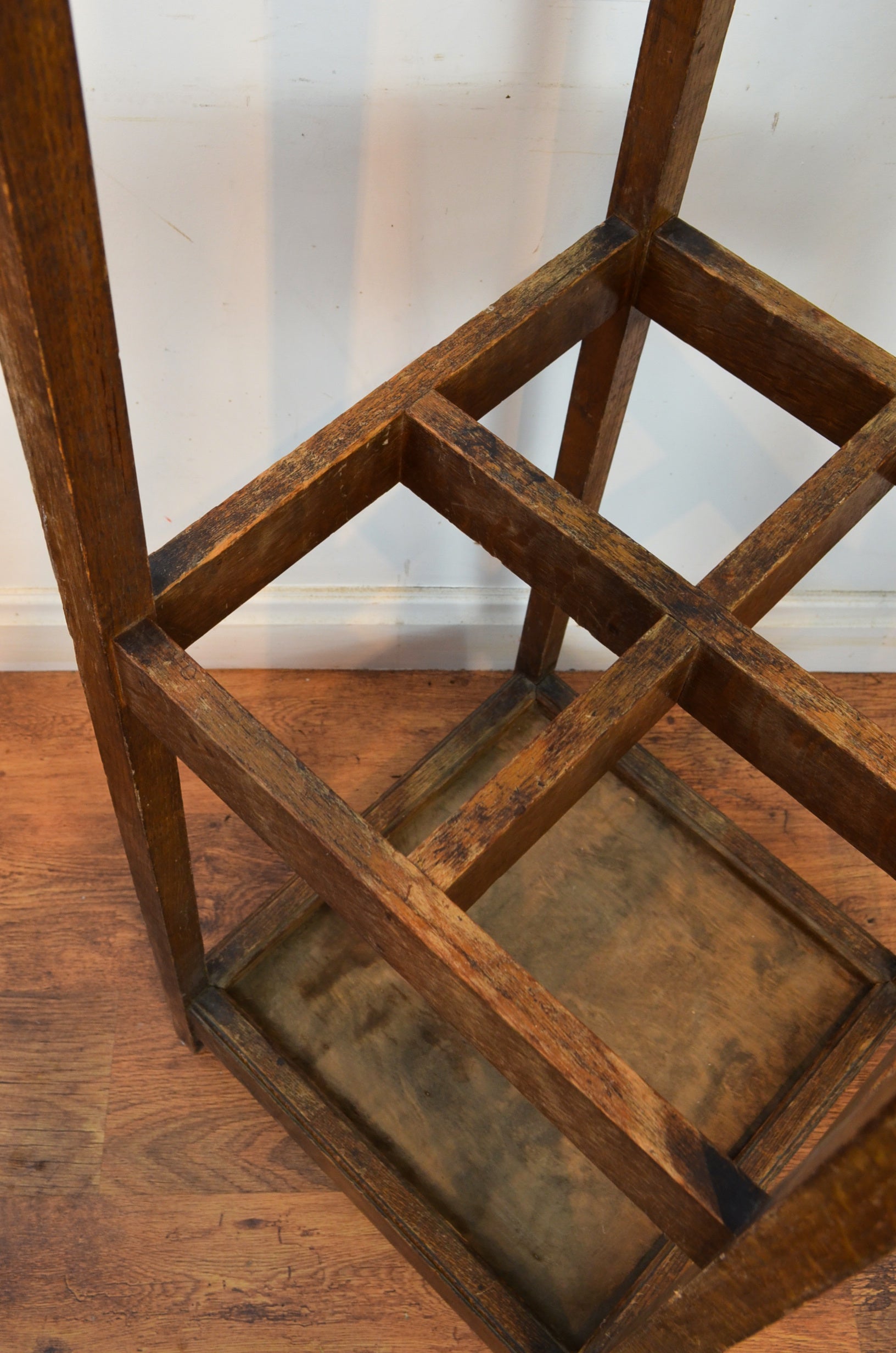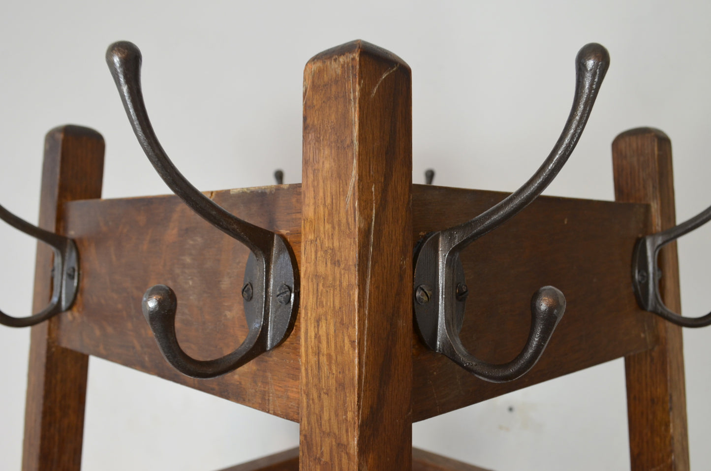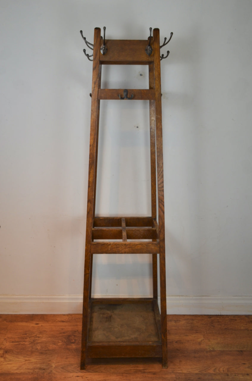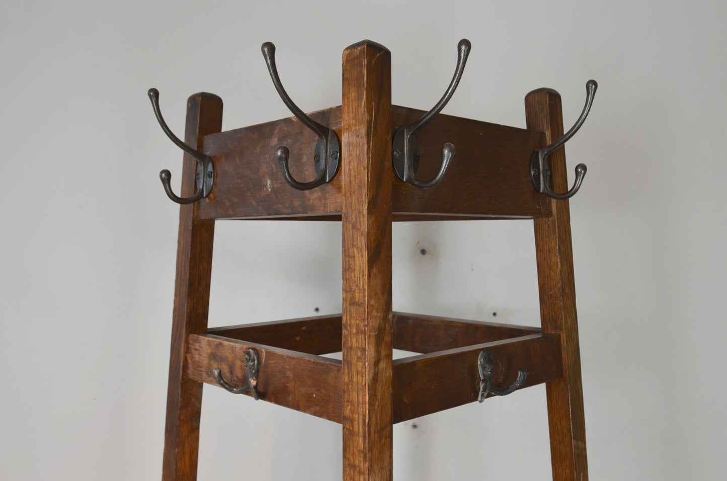 An early 20th century oak school industrial A-frame coat rack / pub coat stand. The coat rack of a tall sizes having a tapered body with coat hooks on all four sides and umbrella stand / stick stand to the lower part raised on four block legs.