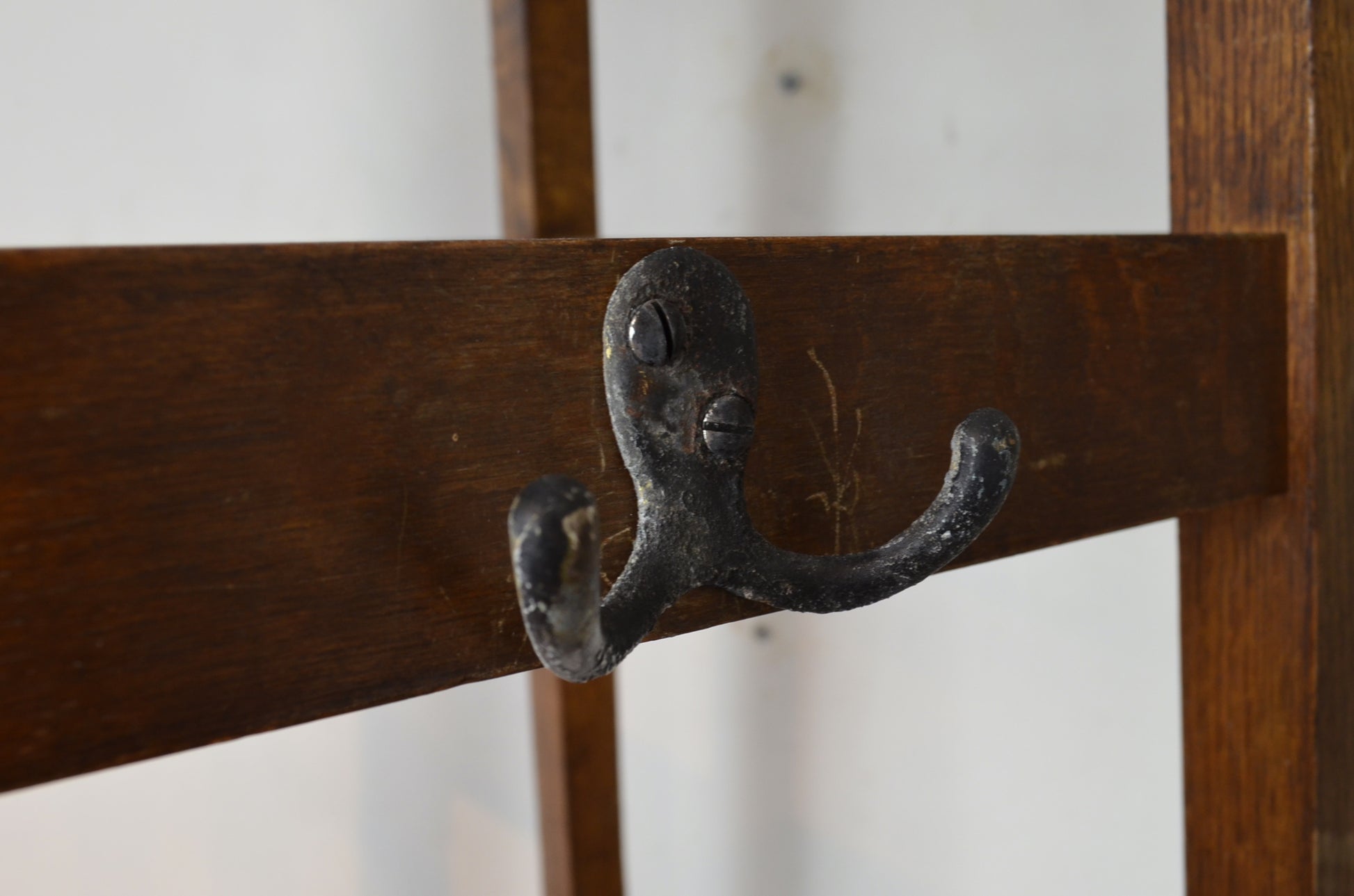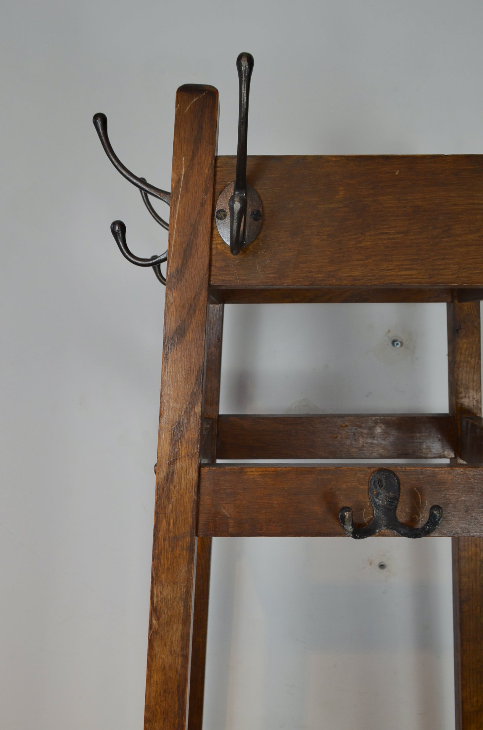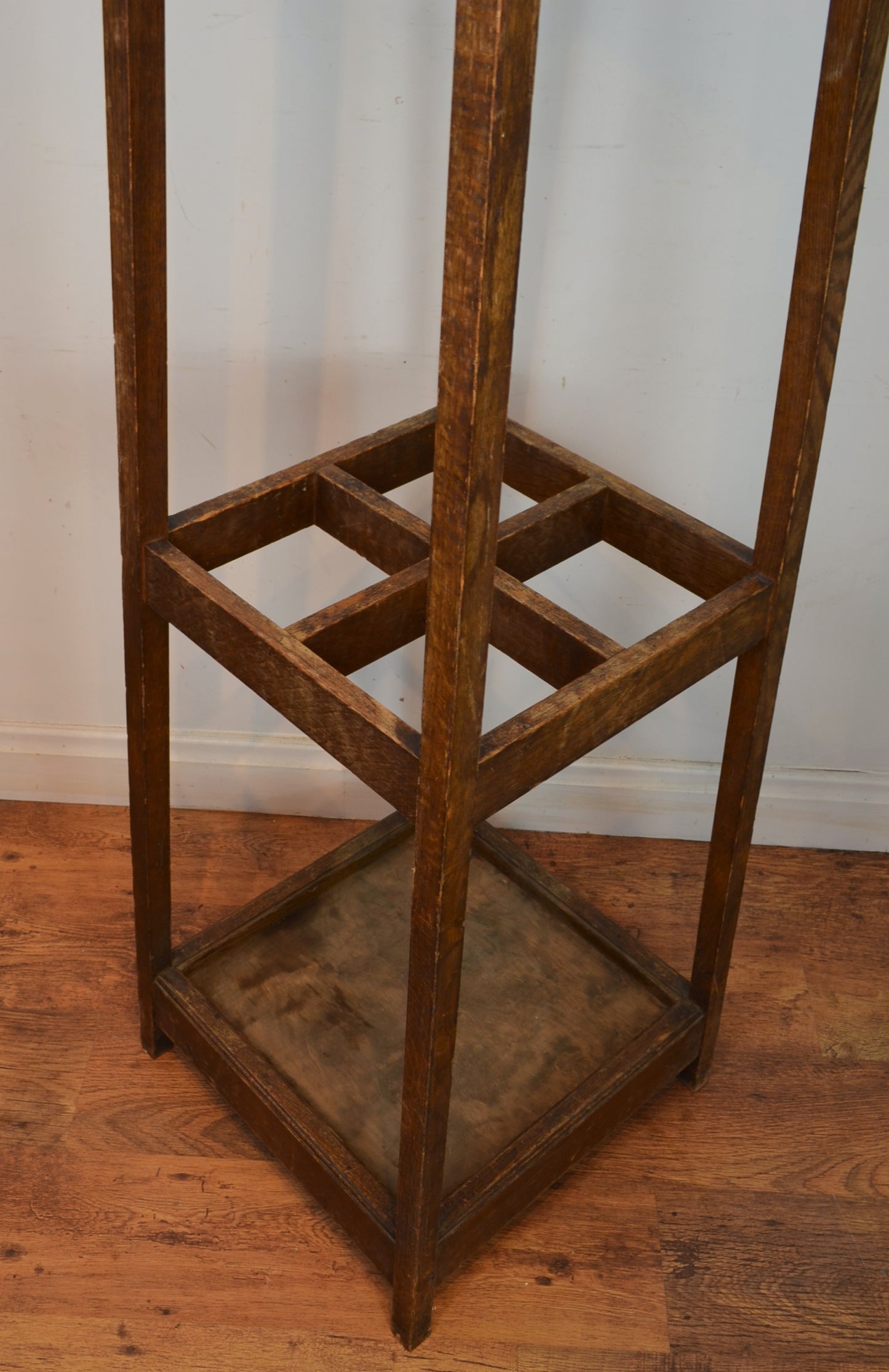 An early 20th century oak school industrial A-frame coat rack / pub coat stand. The coat rack of a tall sizes having a tapered body with coat hooks on all four sides and umbrella stand / stick stand to the lower part raised on four block legs.
