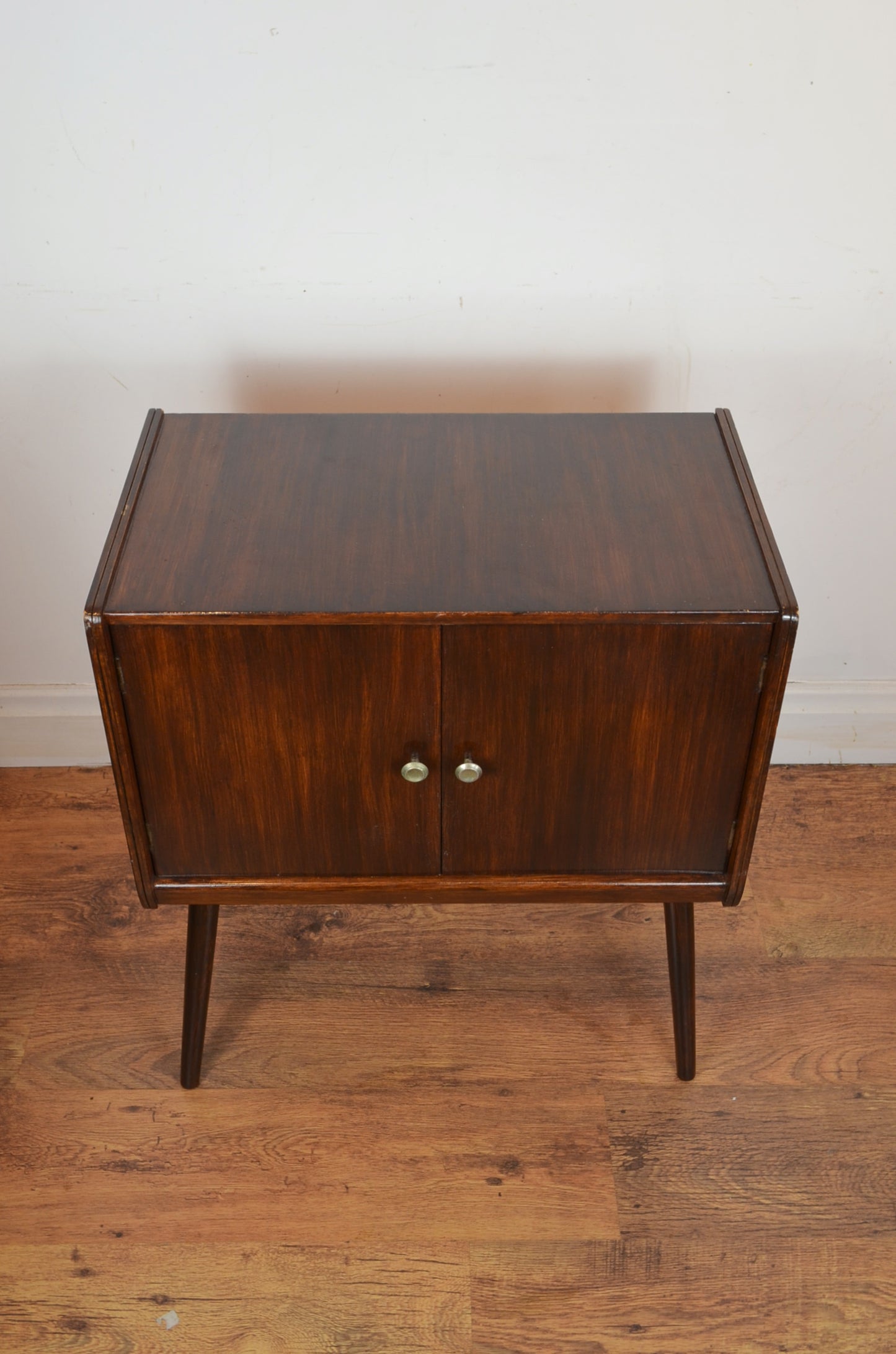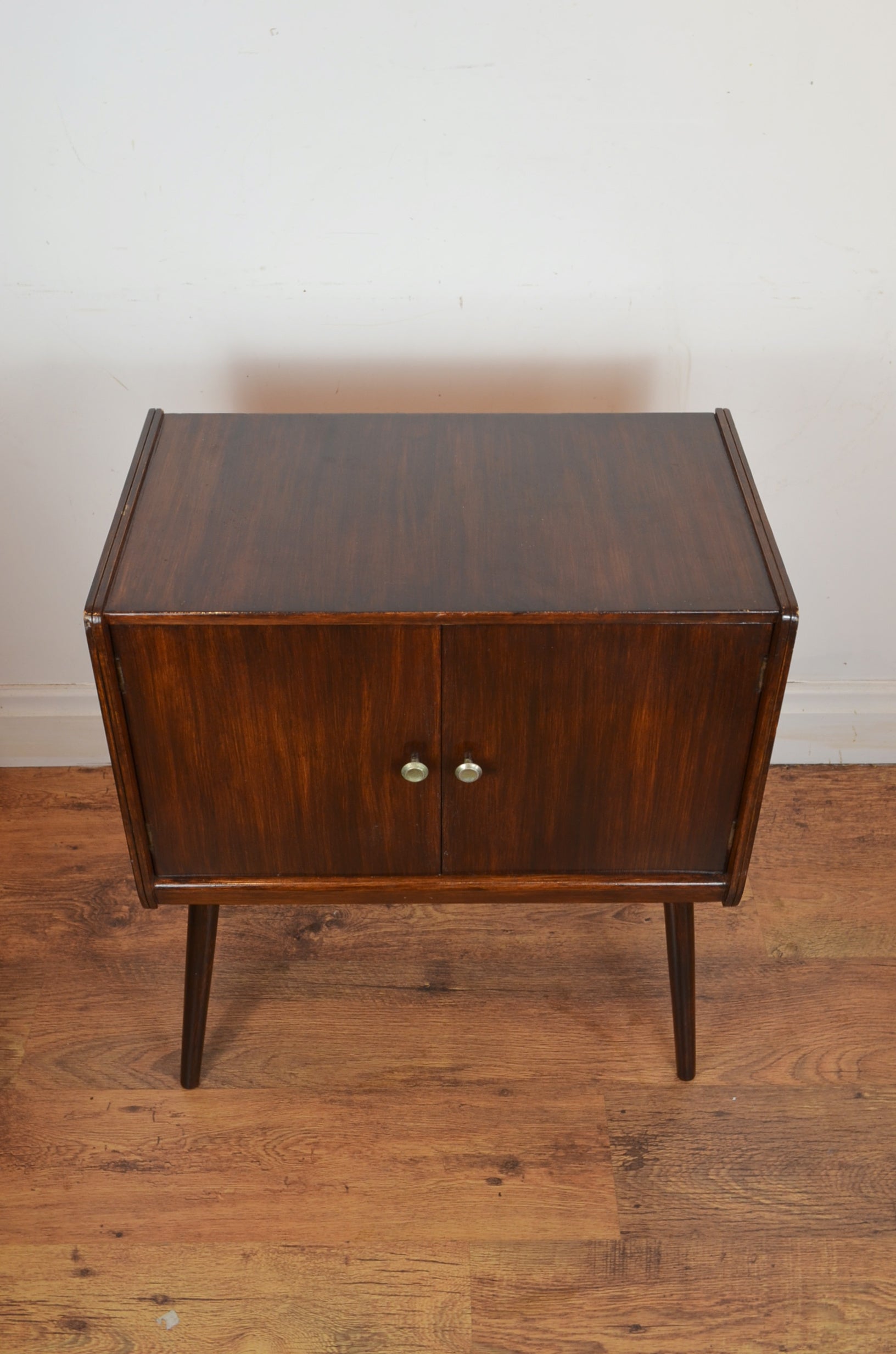 A likely British-made record cabinet with two front opening doors raised on splayed turned legs and with rare internal drawer. Designed for those with a high-quality vinyl collection in mind.