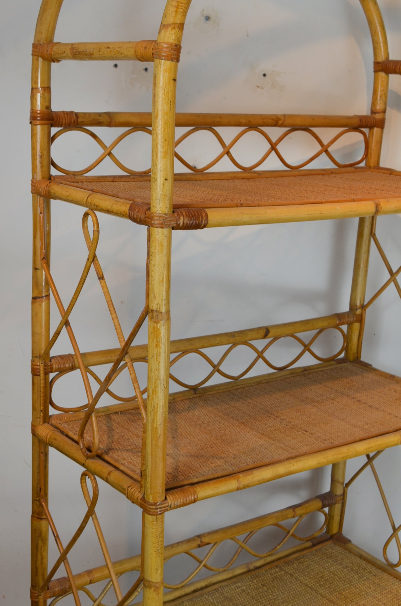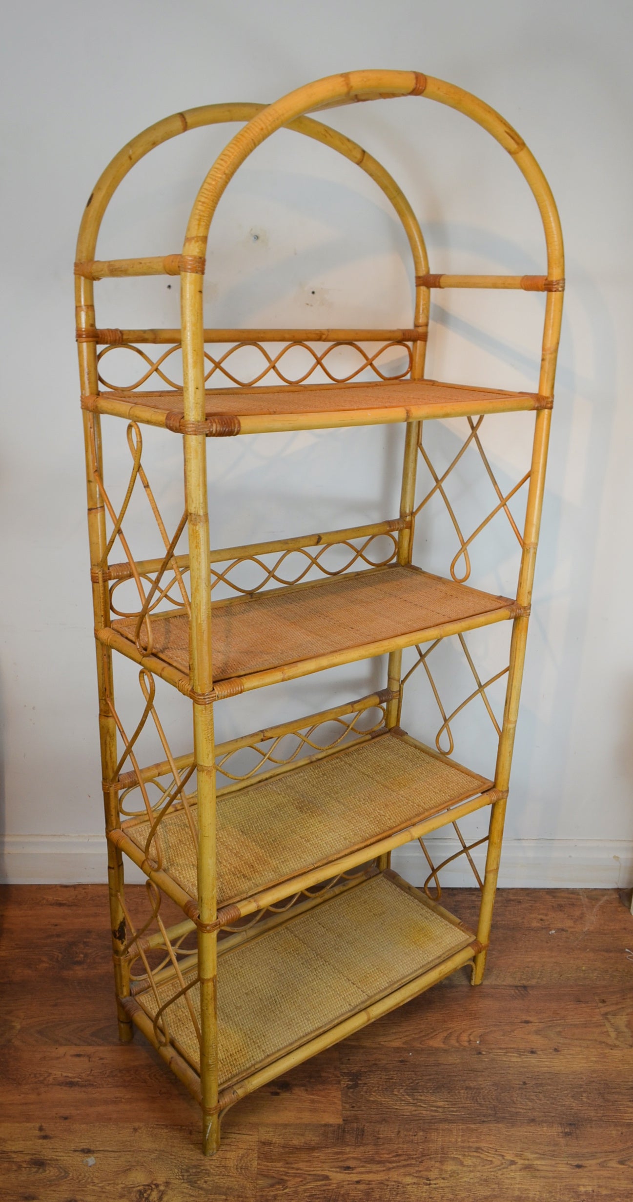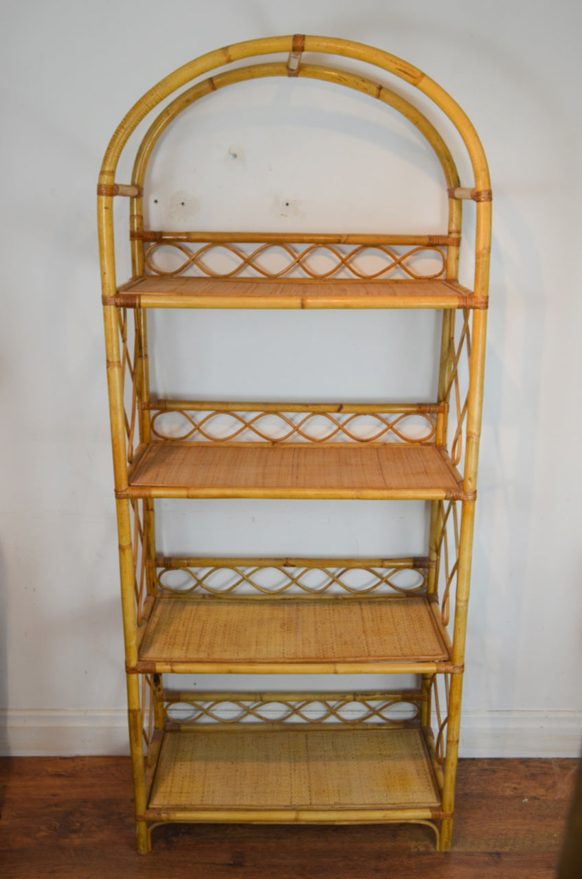 A vintage mid 20th century bamboo book shelf. The open window bookcase having a dome top with four fixed shelves.
