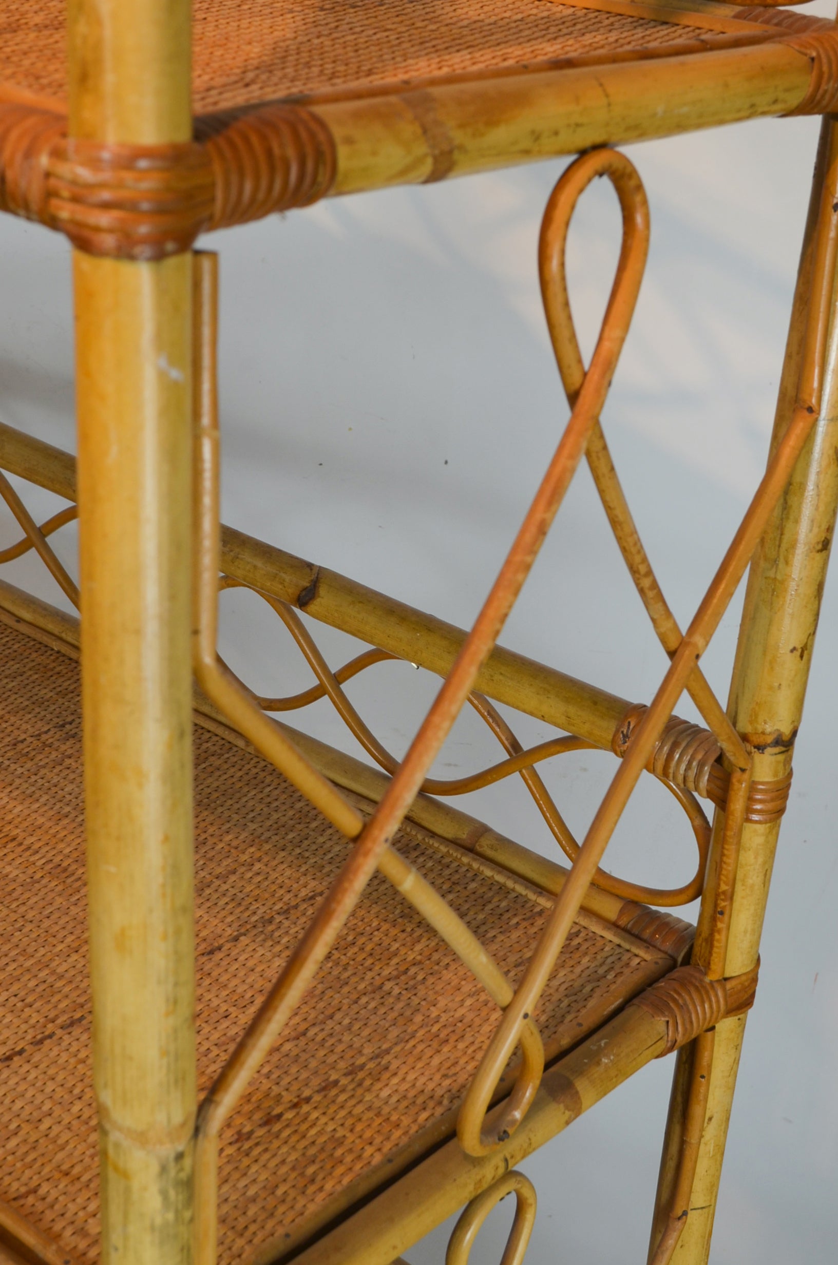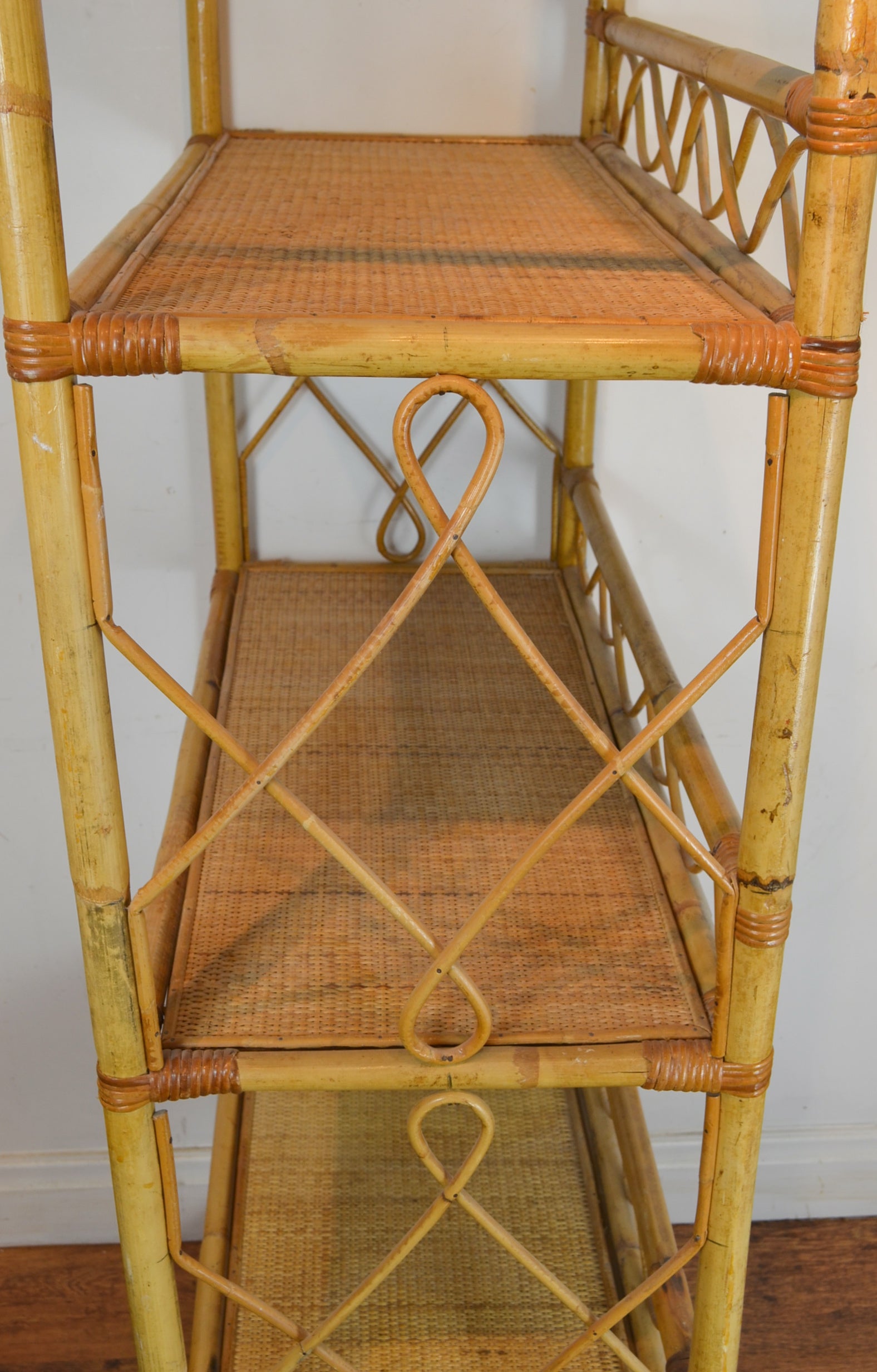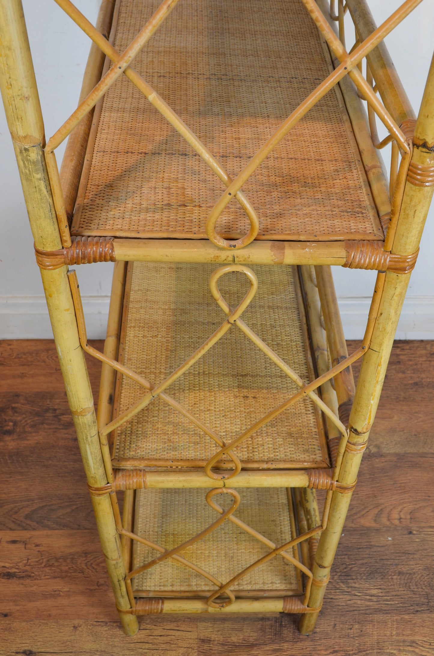 A vintage mid 20th century bamboo book shelf. The open window bookcase having a dome top with four fixed shelves.