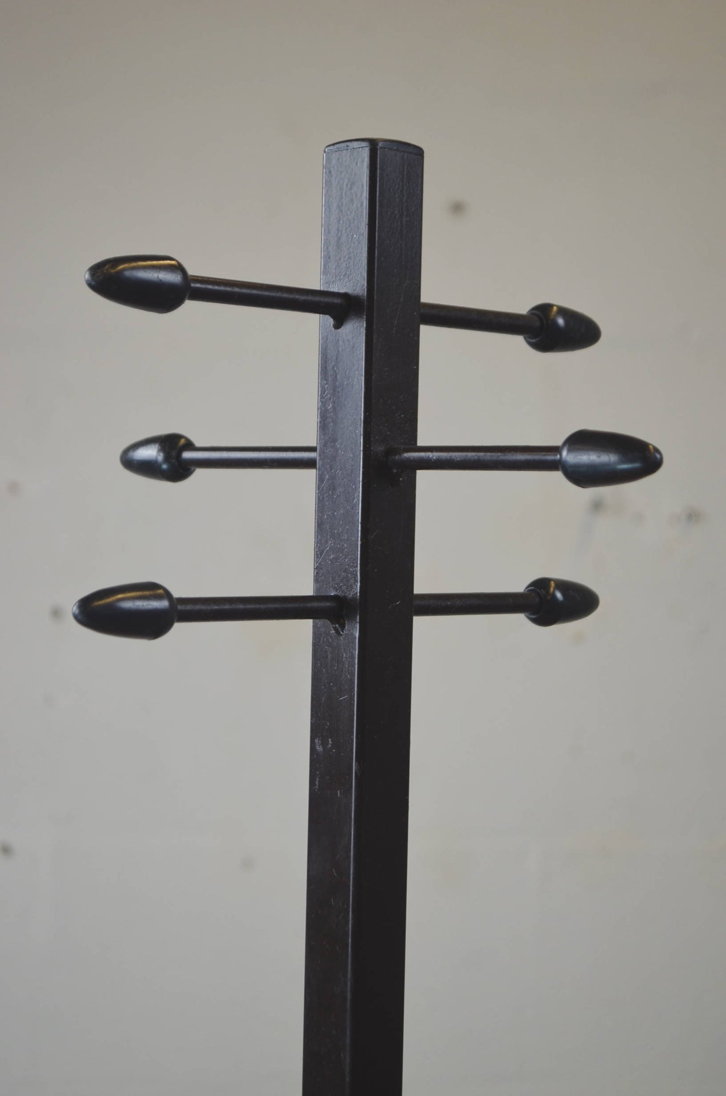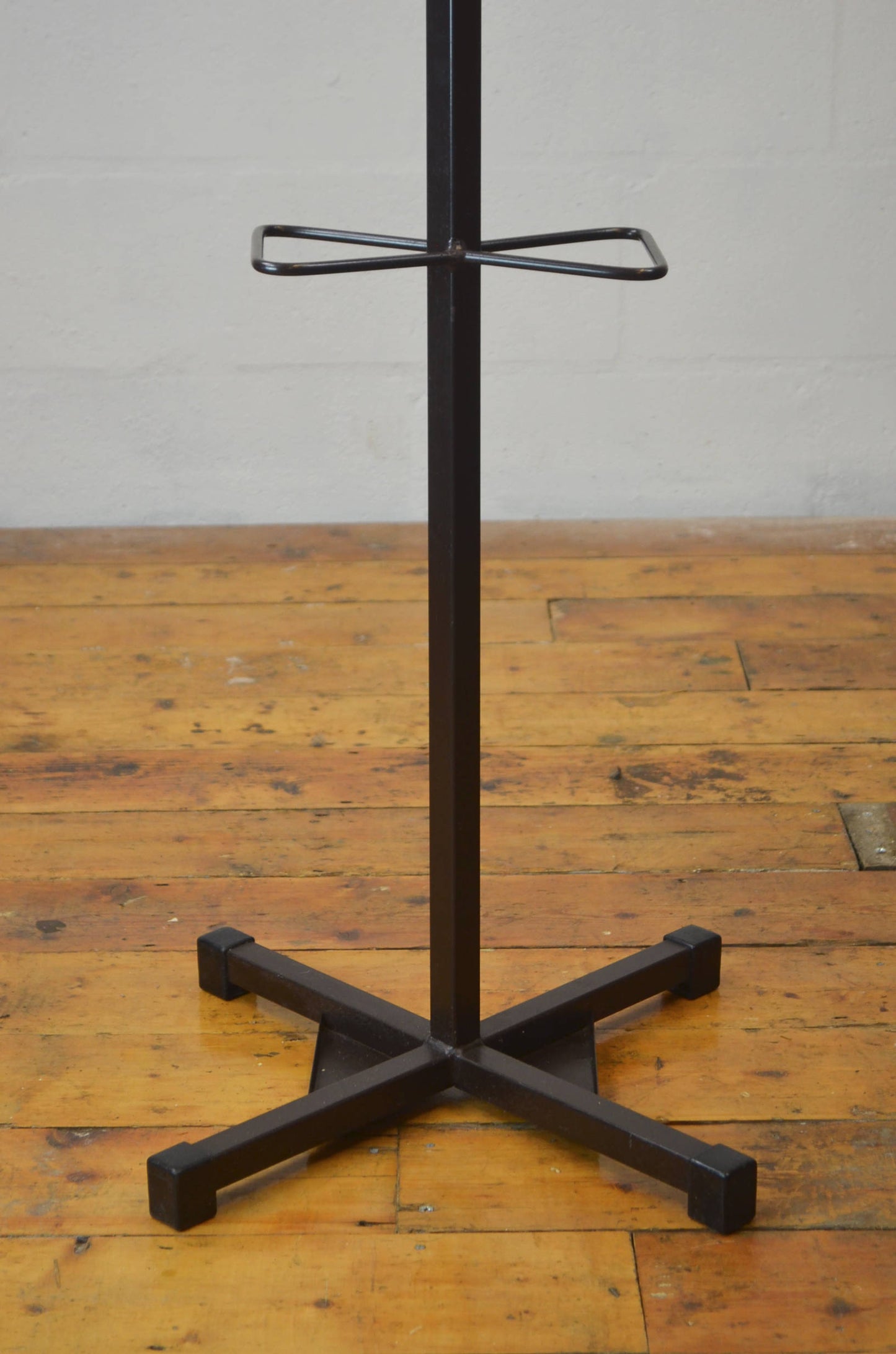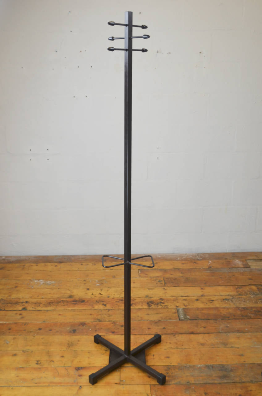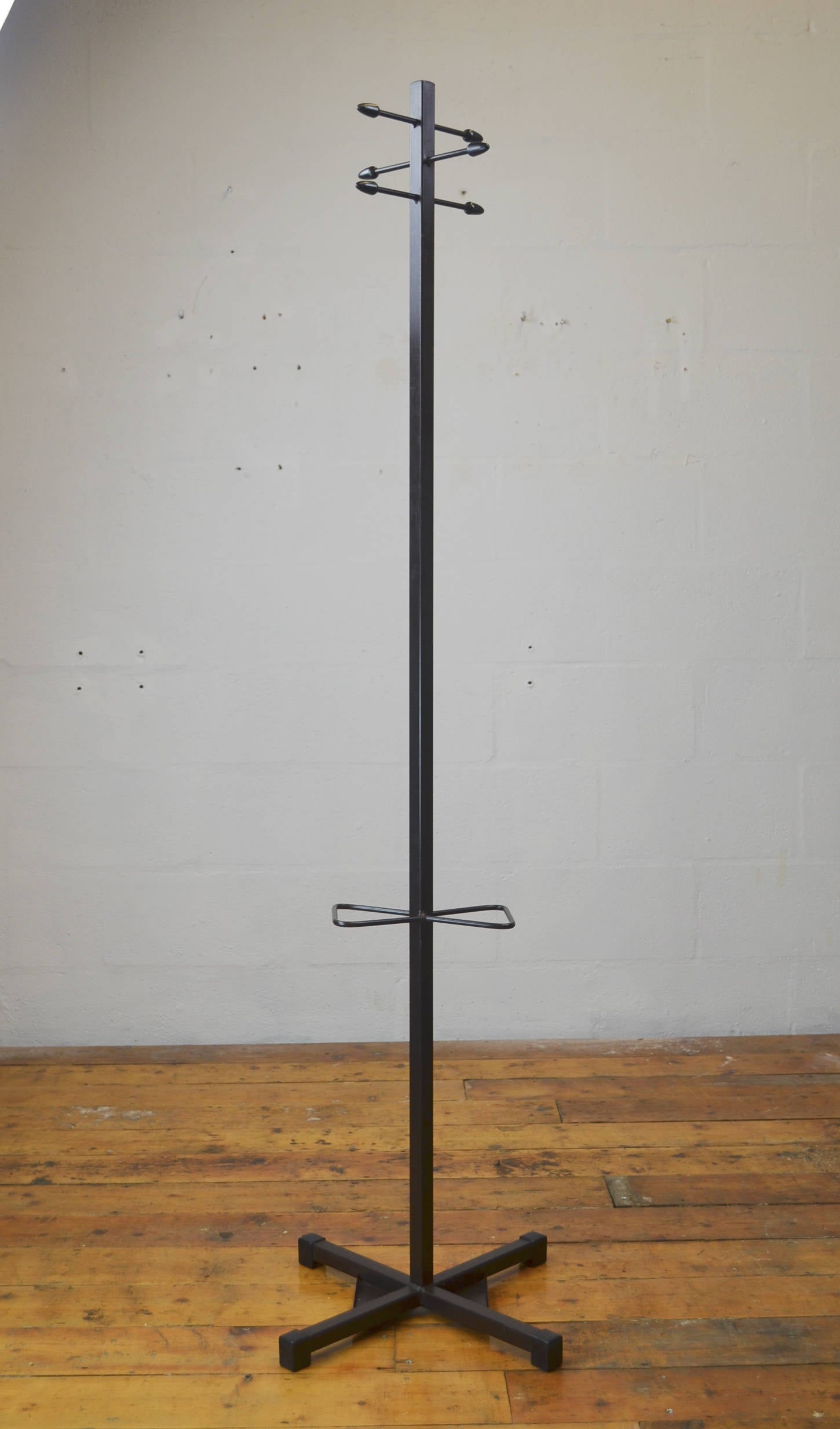A 1980's retro coat stand with an umbrella holder, triangular drip trays and rubber feet.