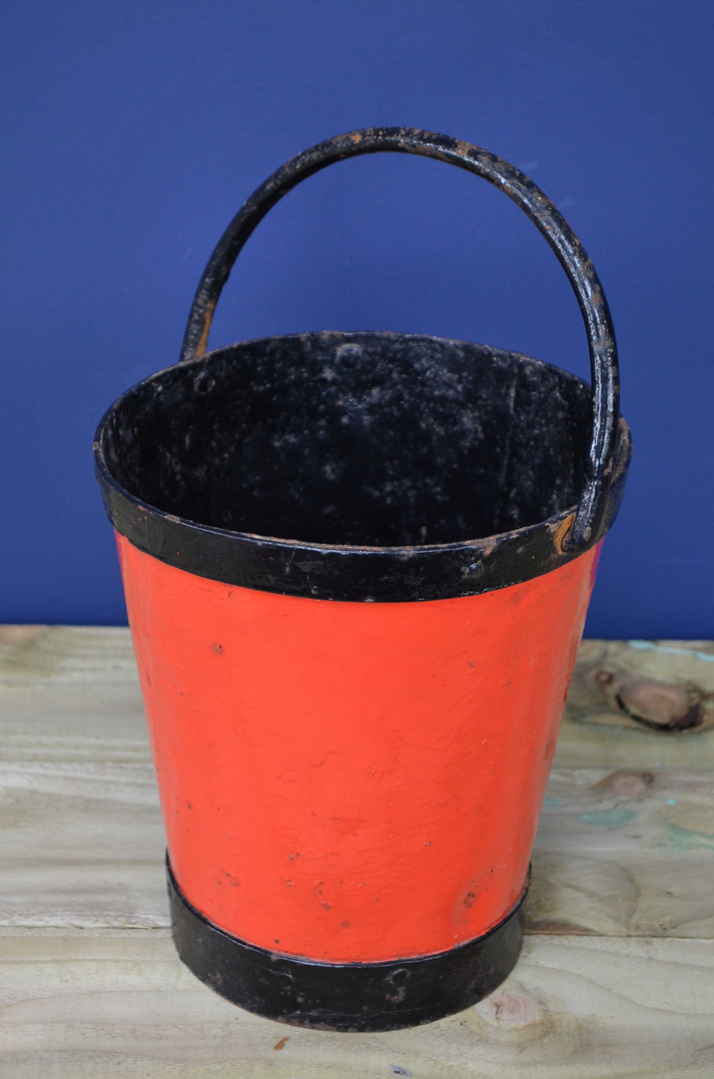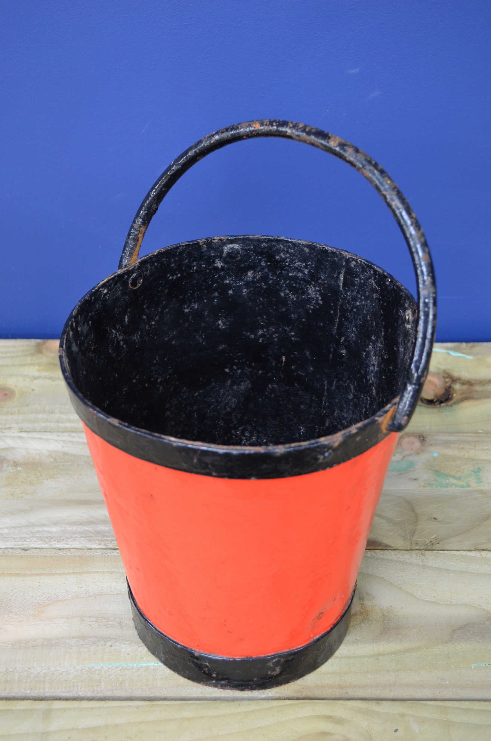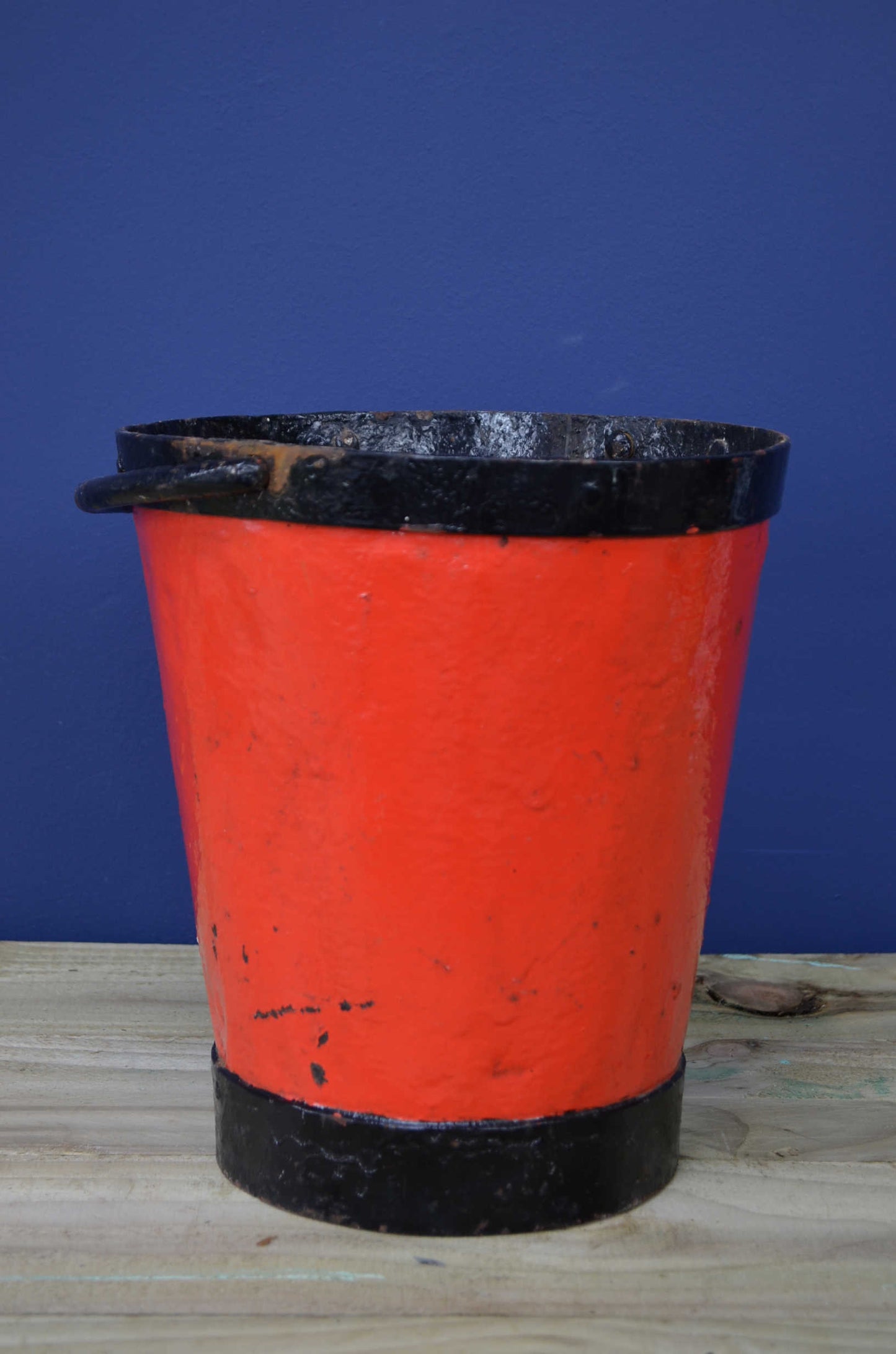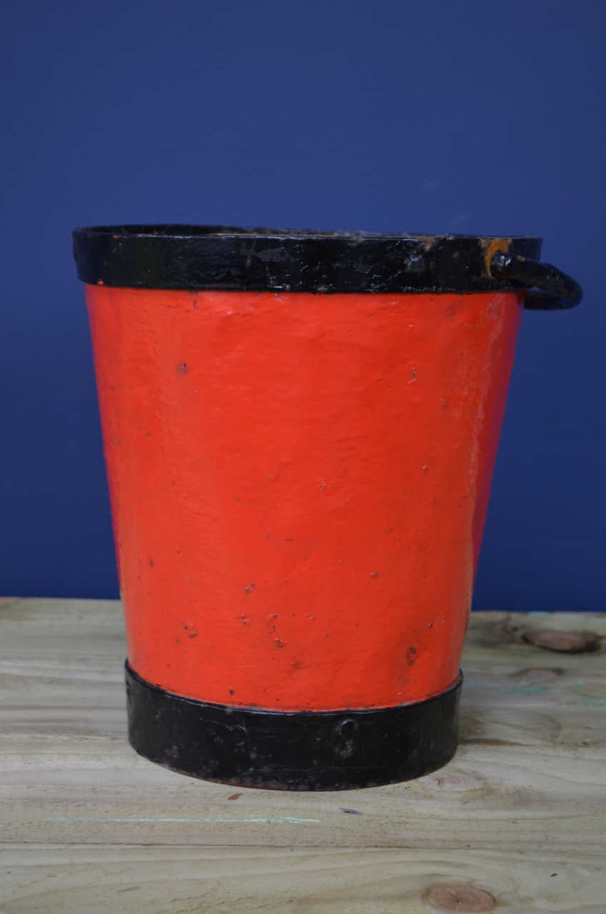 A French metal fire bucket, late 19th century with piercing red and black paint.