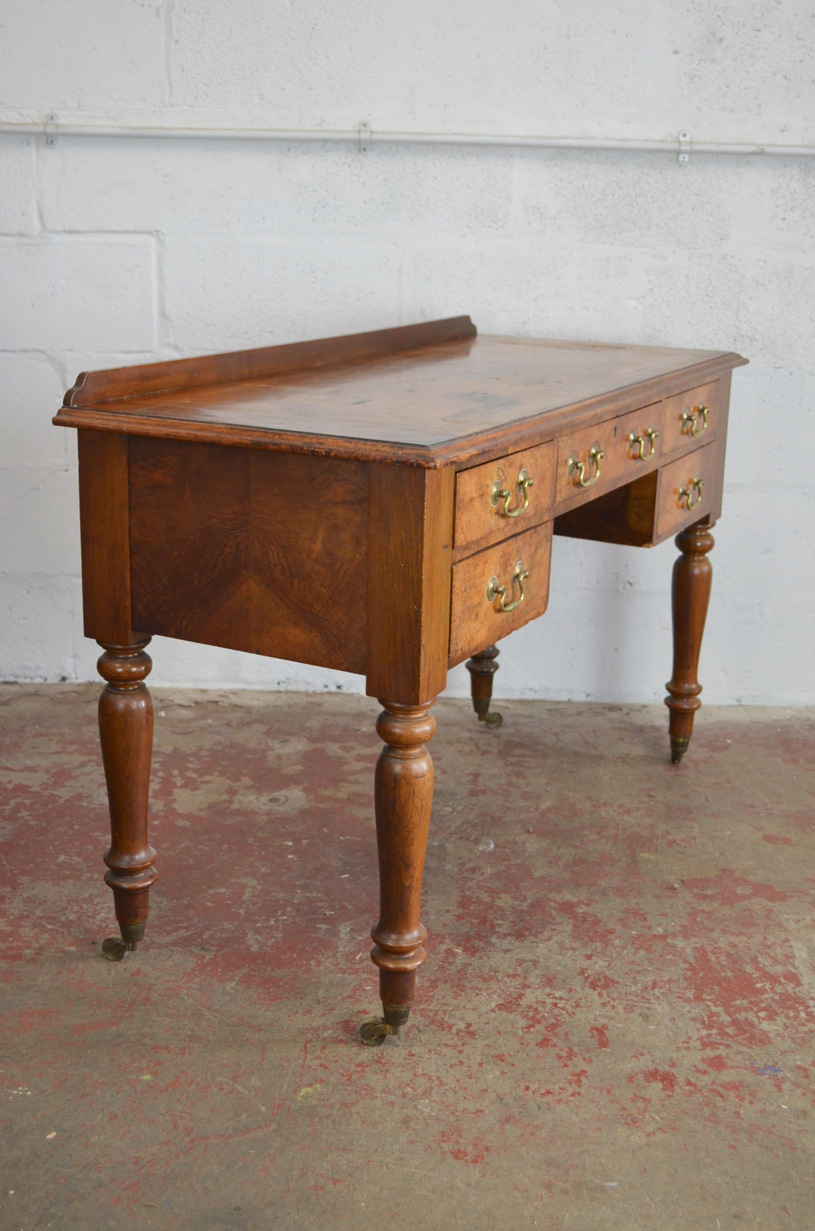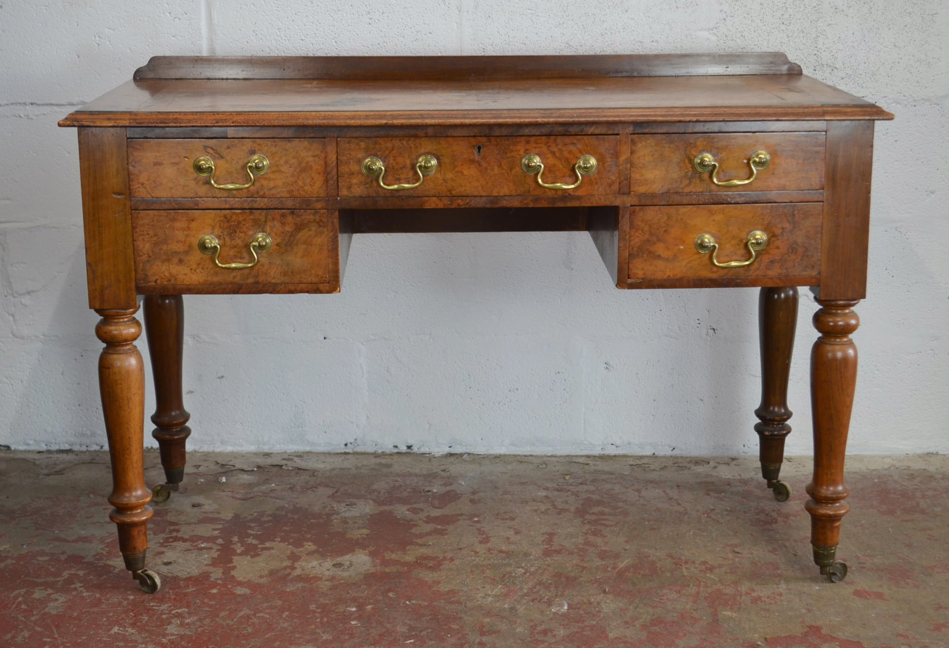 A 19th Century walnut kneehole writing table/desk with an arrangement of five short drawers around the kneehole, on turned tapering supports, brass caps and castors.