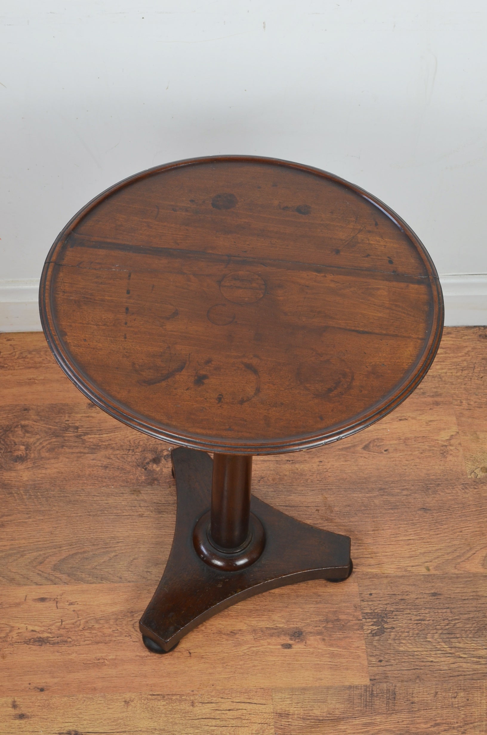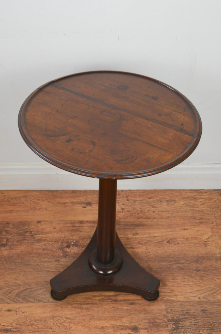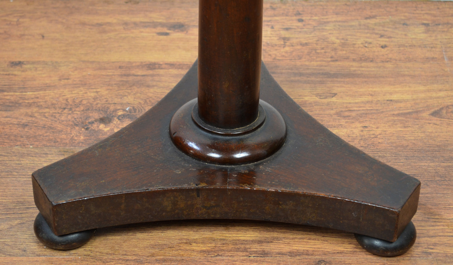 An antique 19th century mahogany wine/lamp table tripod raised with triangular base on bun feet.