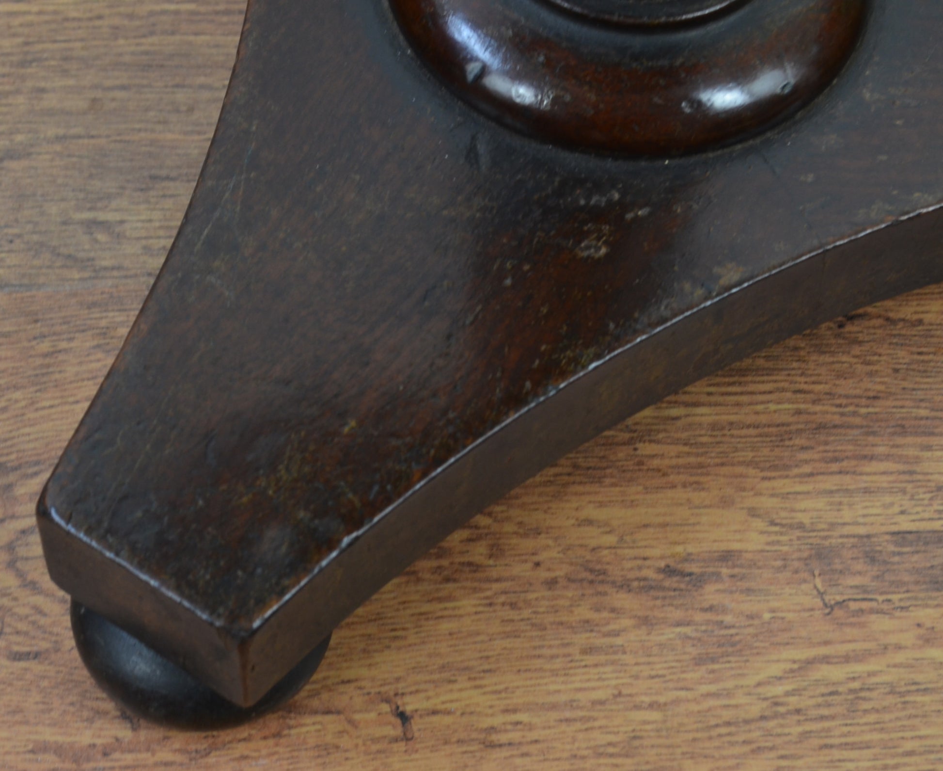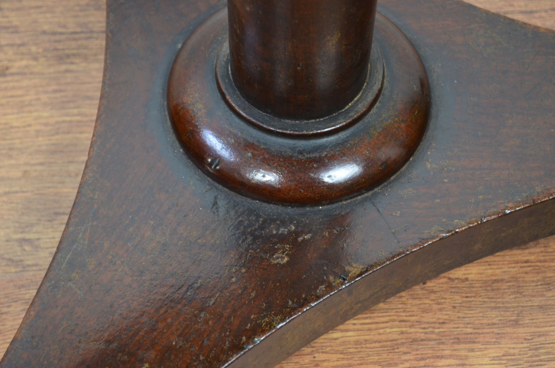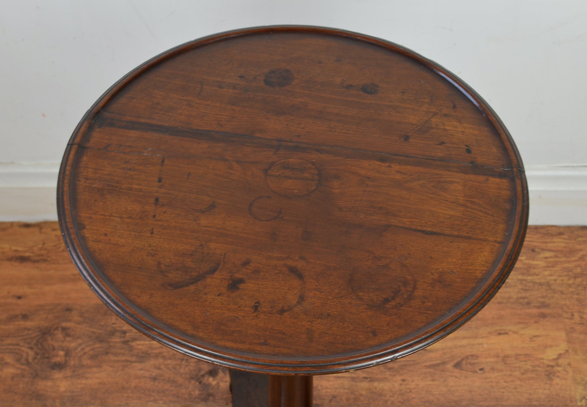 An antique 19th century mahogany wine/lamp table tripod raised with triangular base on bun feet.