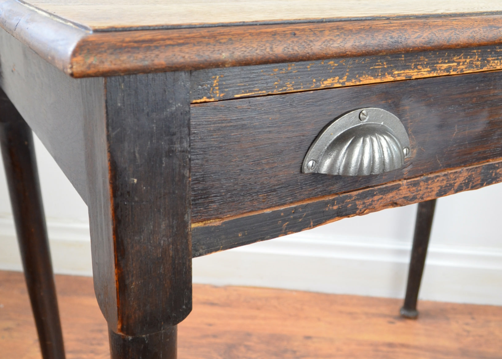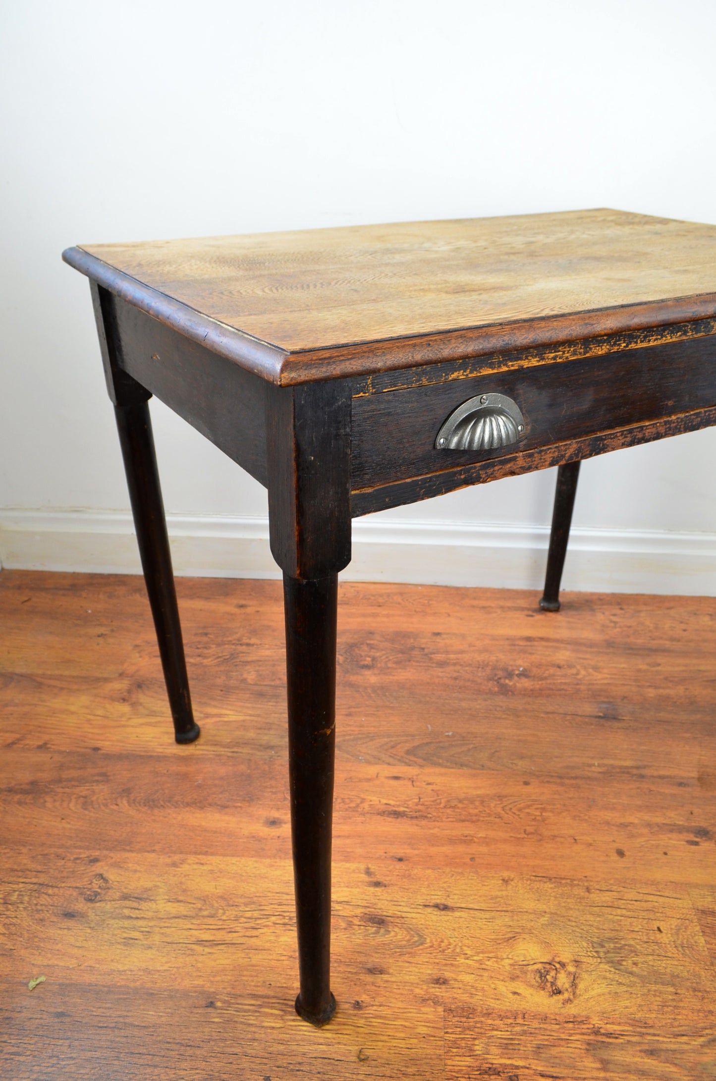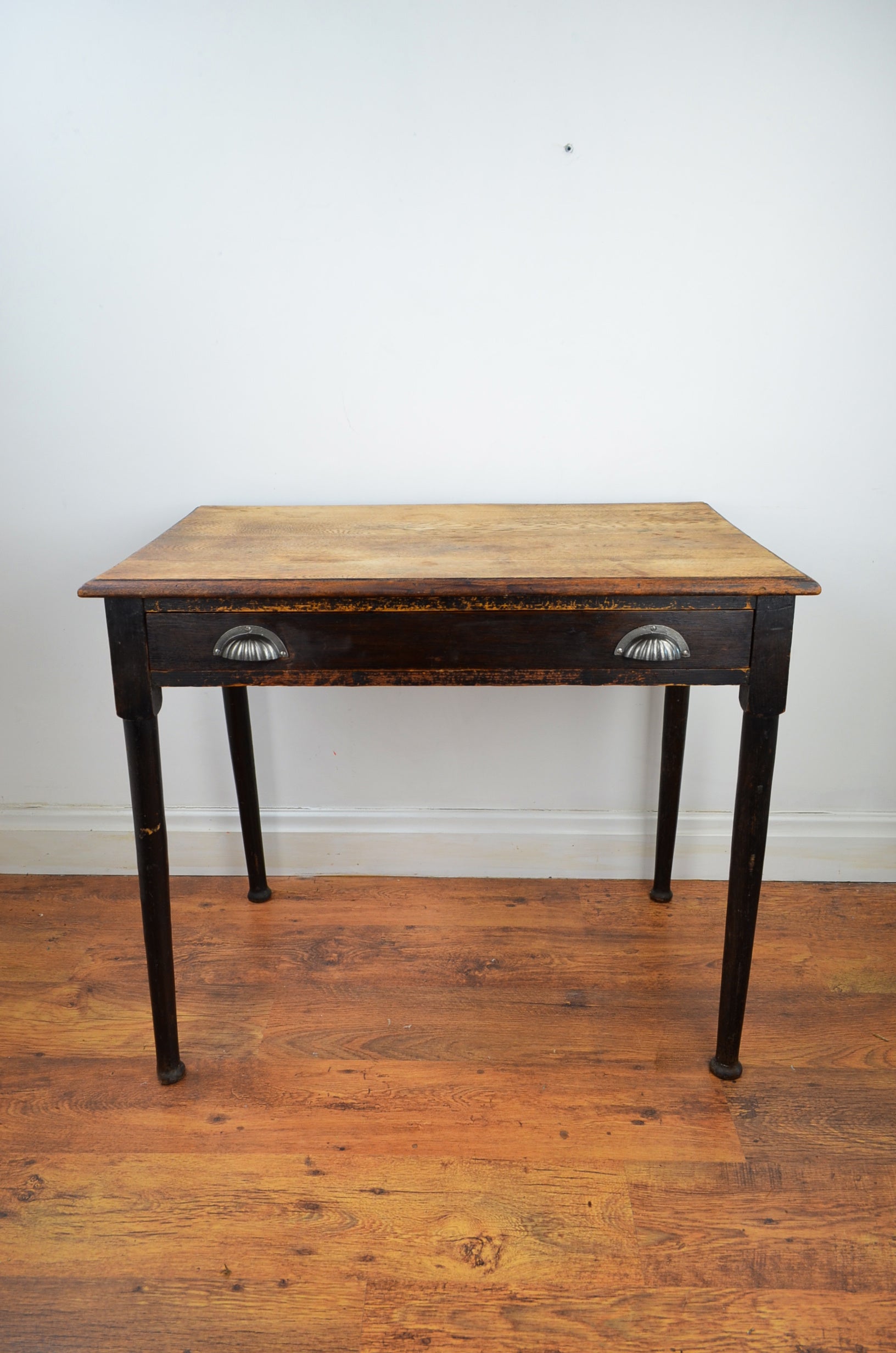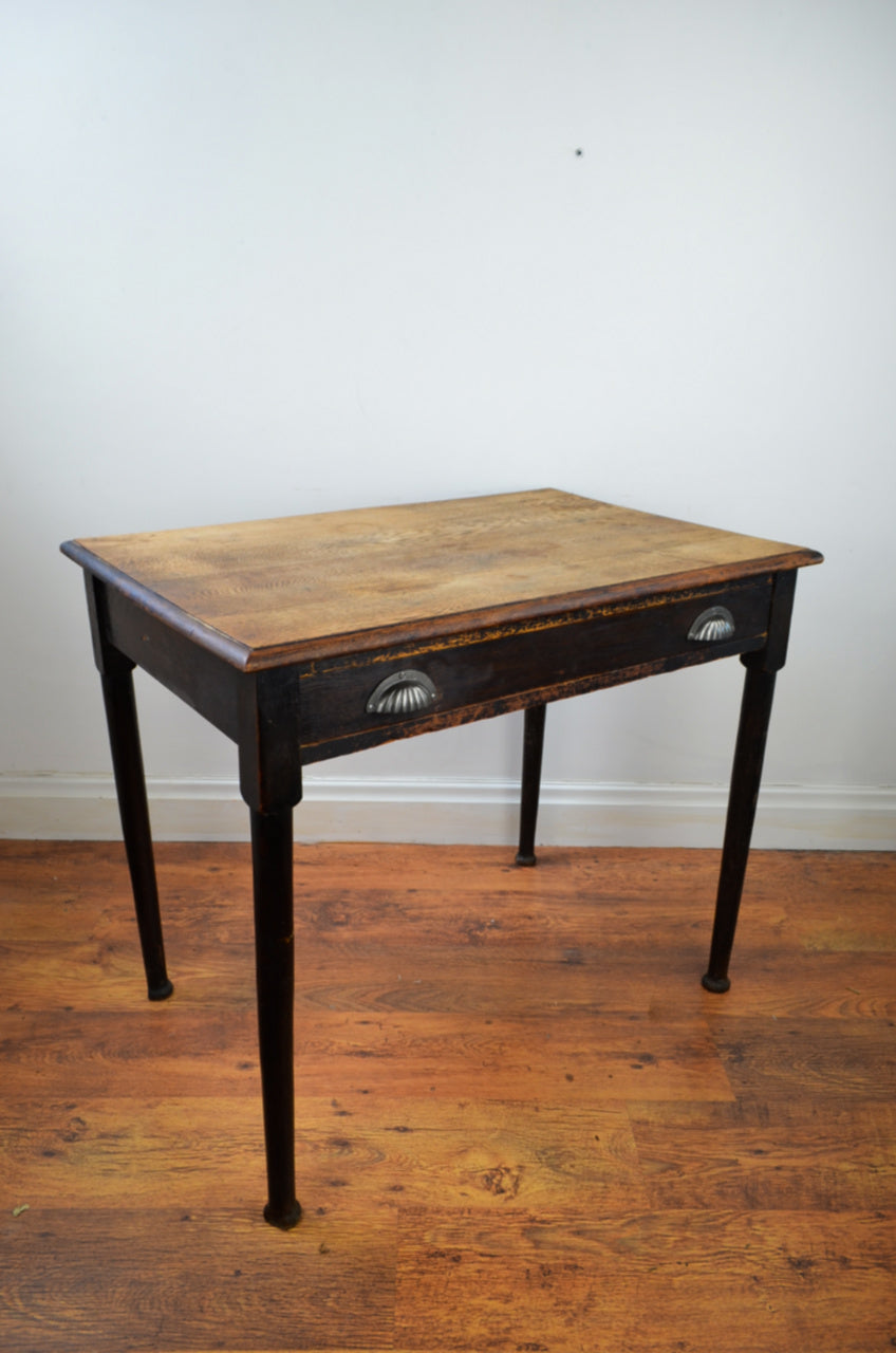 This 19th century writing/hall/side table with flared top over turned tampered supports with draw and iron handles.