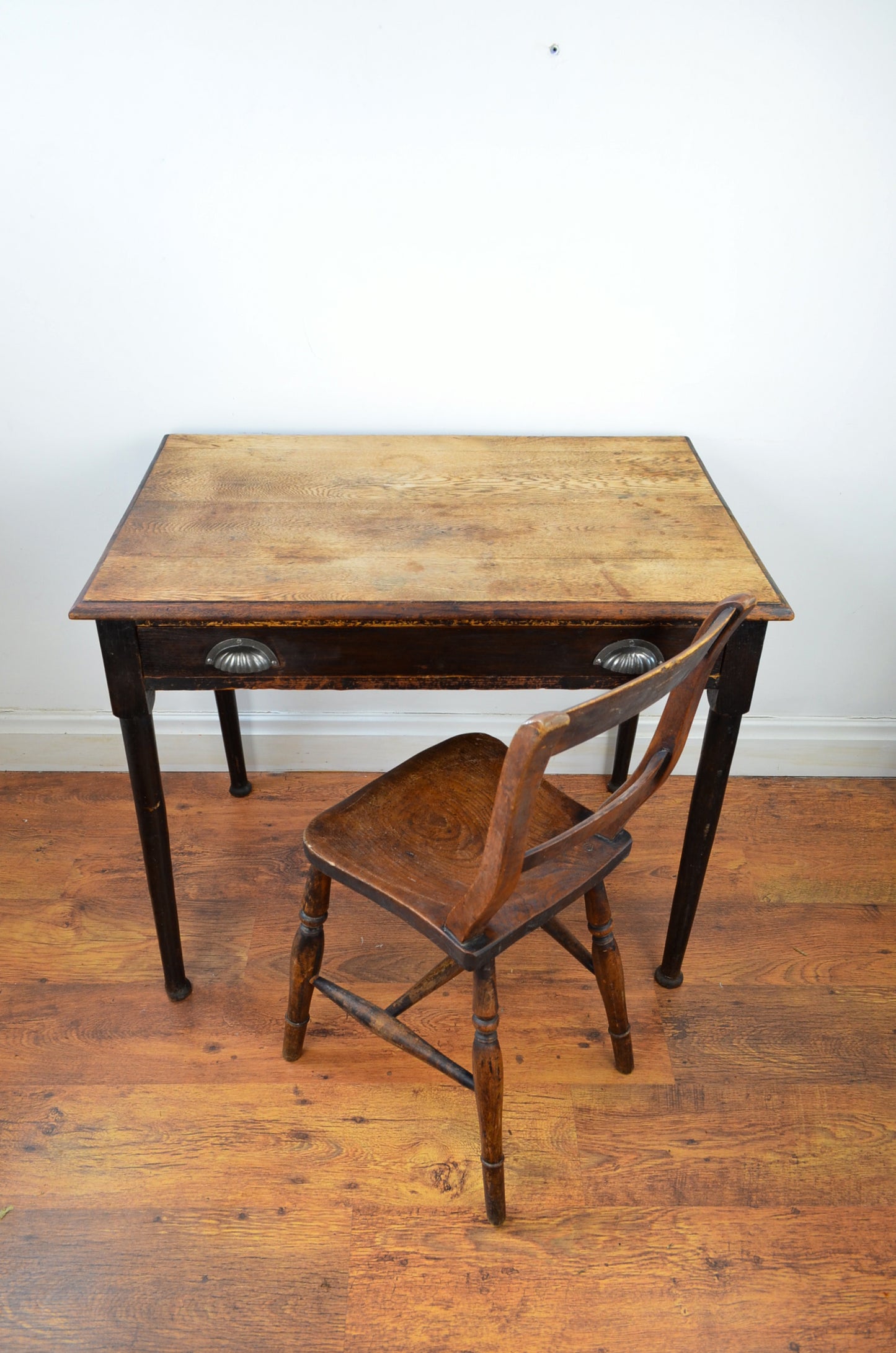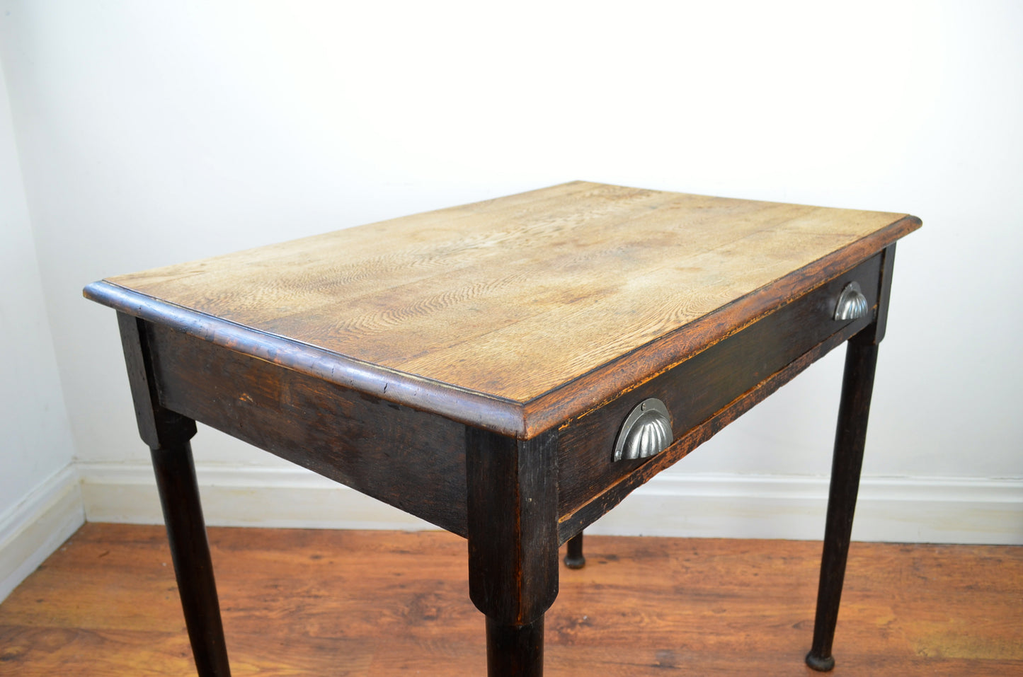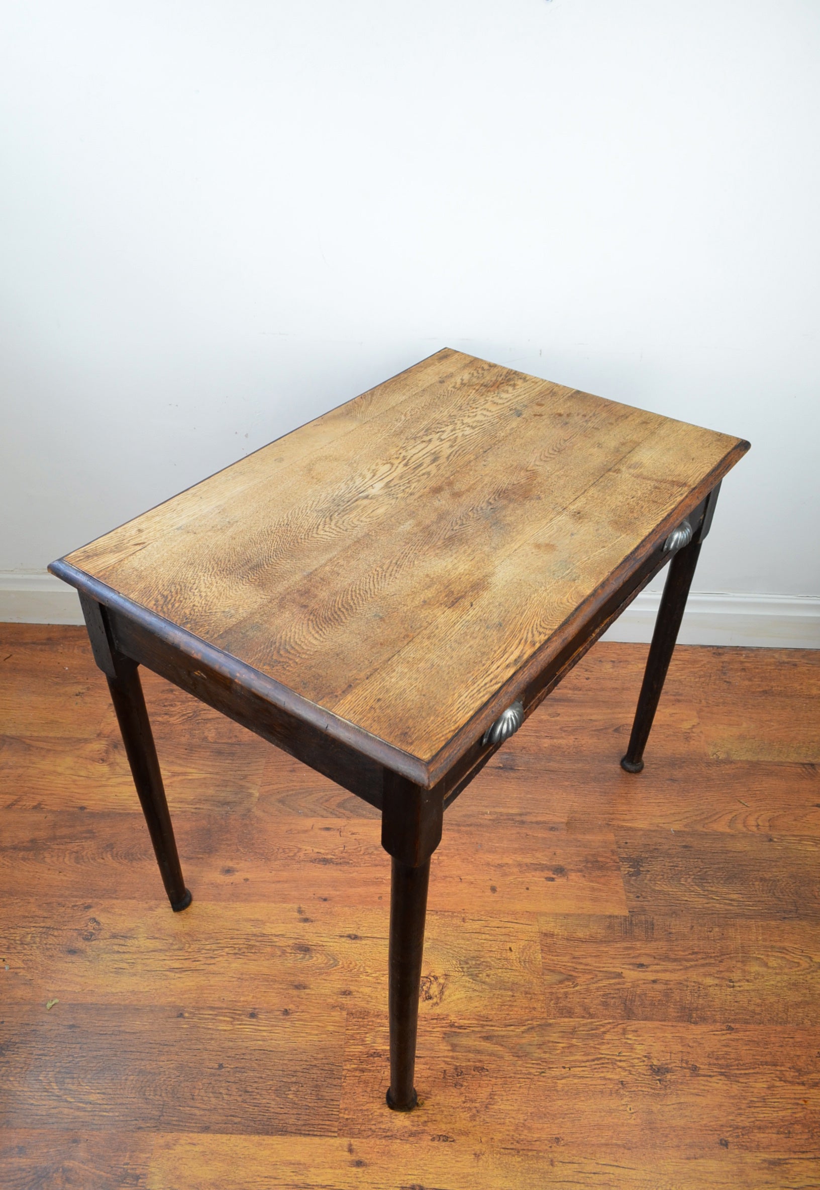This 19th century writing/hall/side table with flared top over turned tampered supports with draw and iron handles.