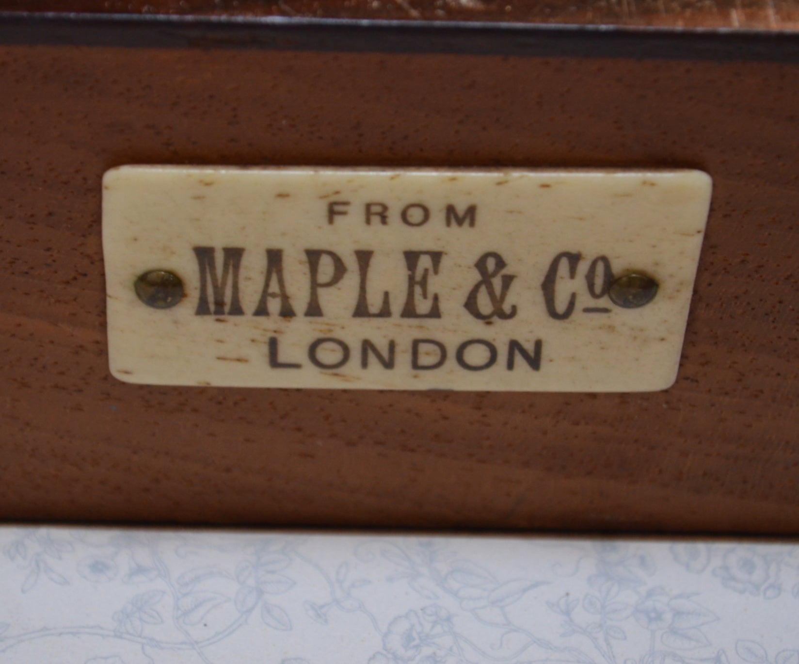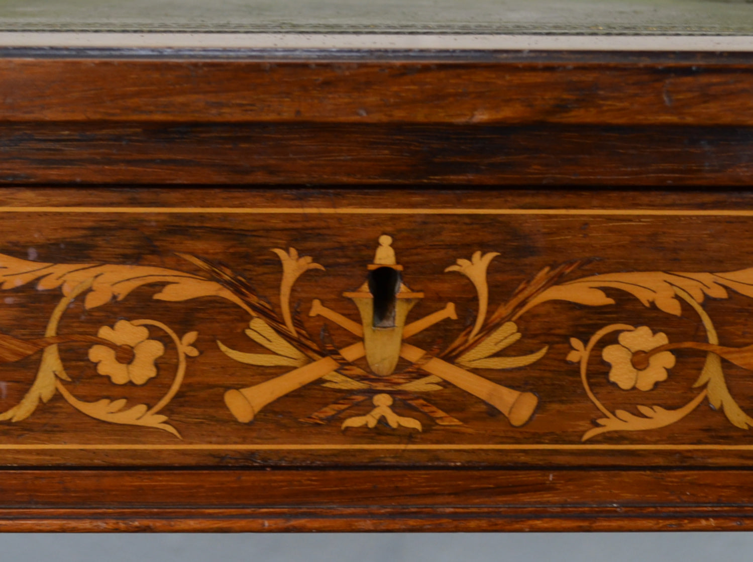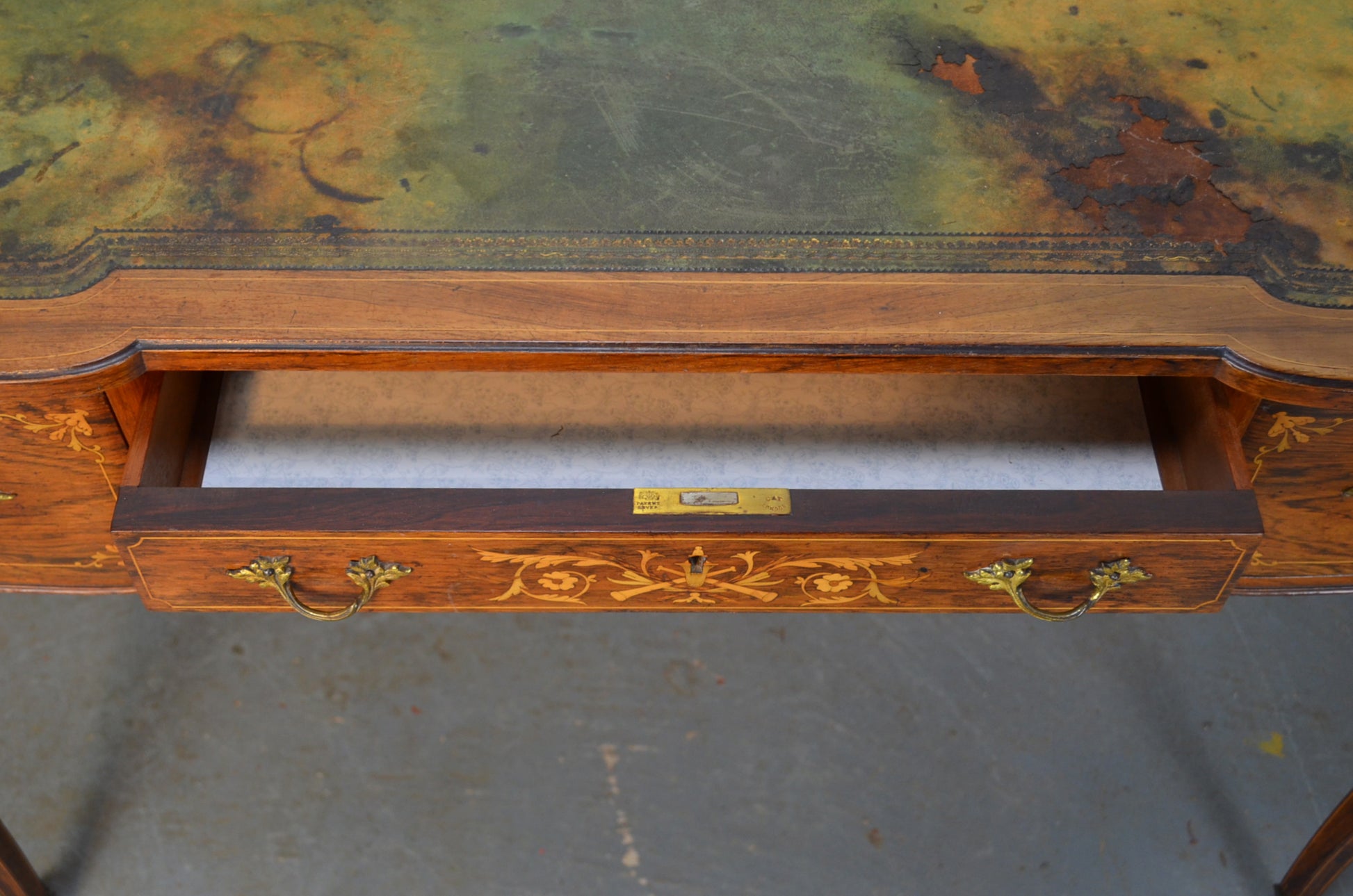 A late 19th century inlaid rosewood ladies desk/writing table. With worn leather insert top over three drawers. Shaped supports and stamped Maple & Company. A fantastic desk with beautiful rosewood and elegant inlay.