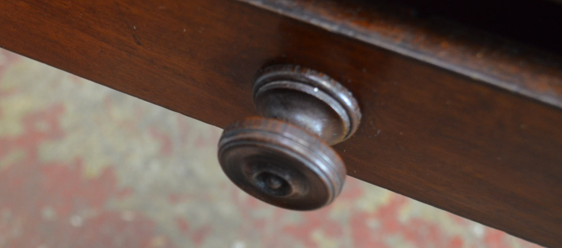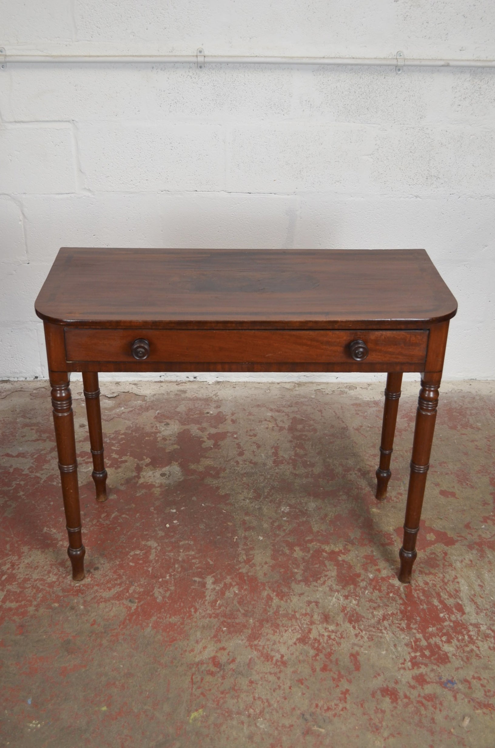 A 19th century Victorian mahogany writing desk. The desk having turned supports with twin drawers, each with turned knob handles. A great size for use at home where space is a premium as its perfect for a laptop and storing files and stationary.