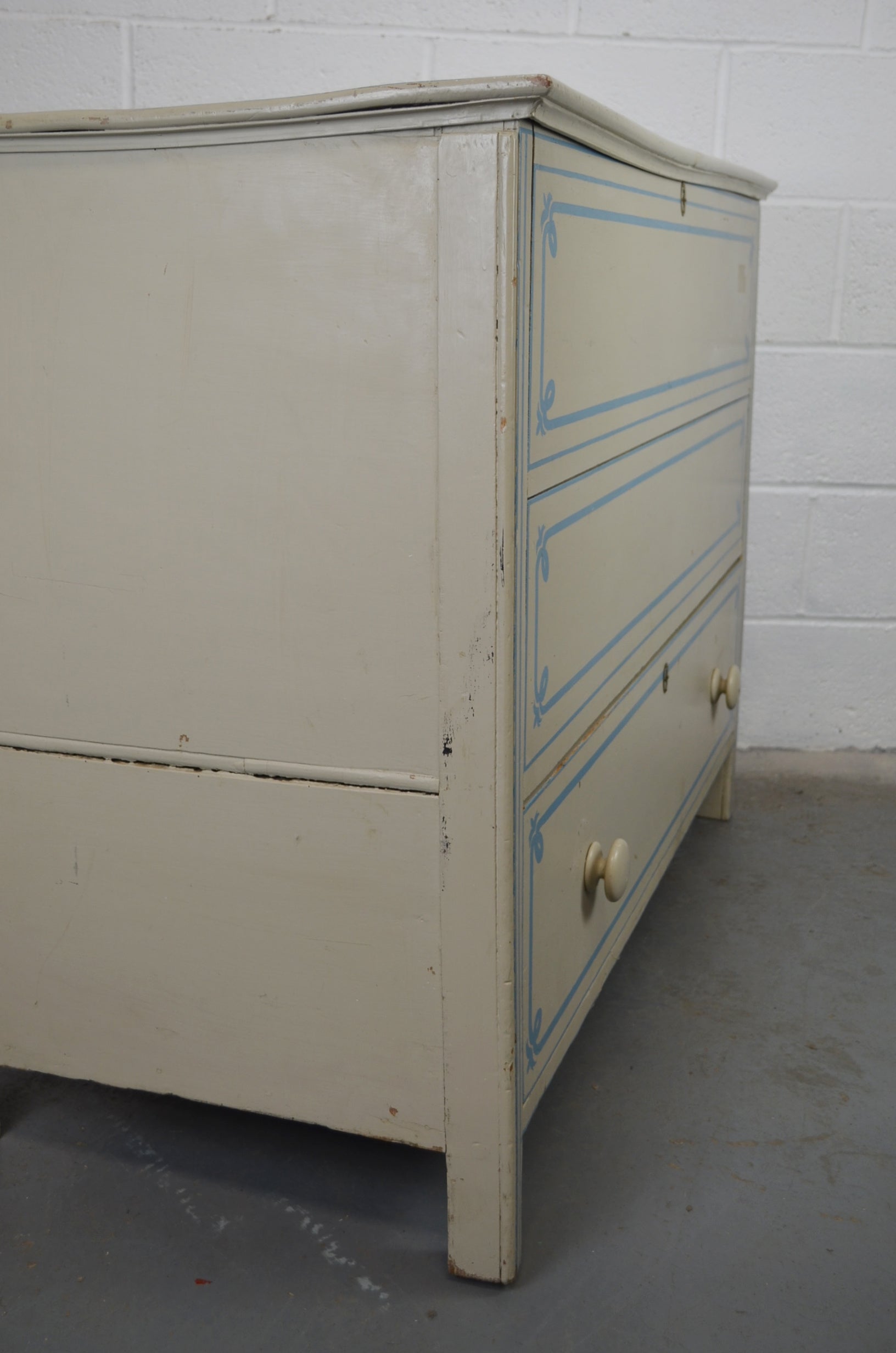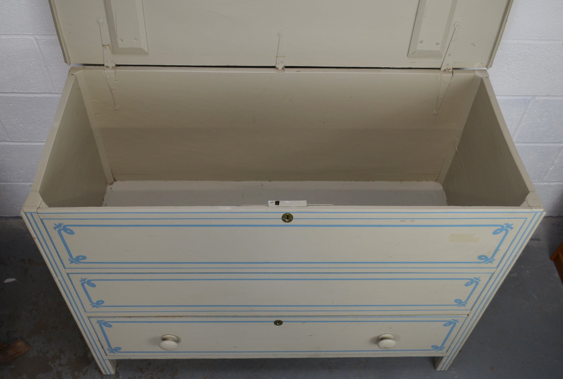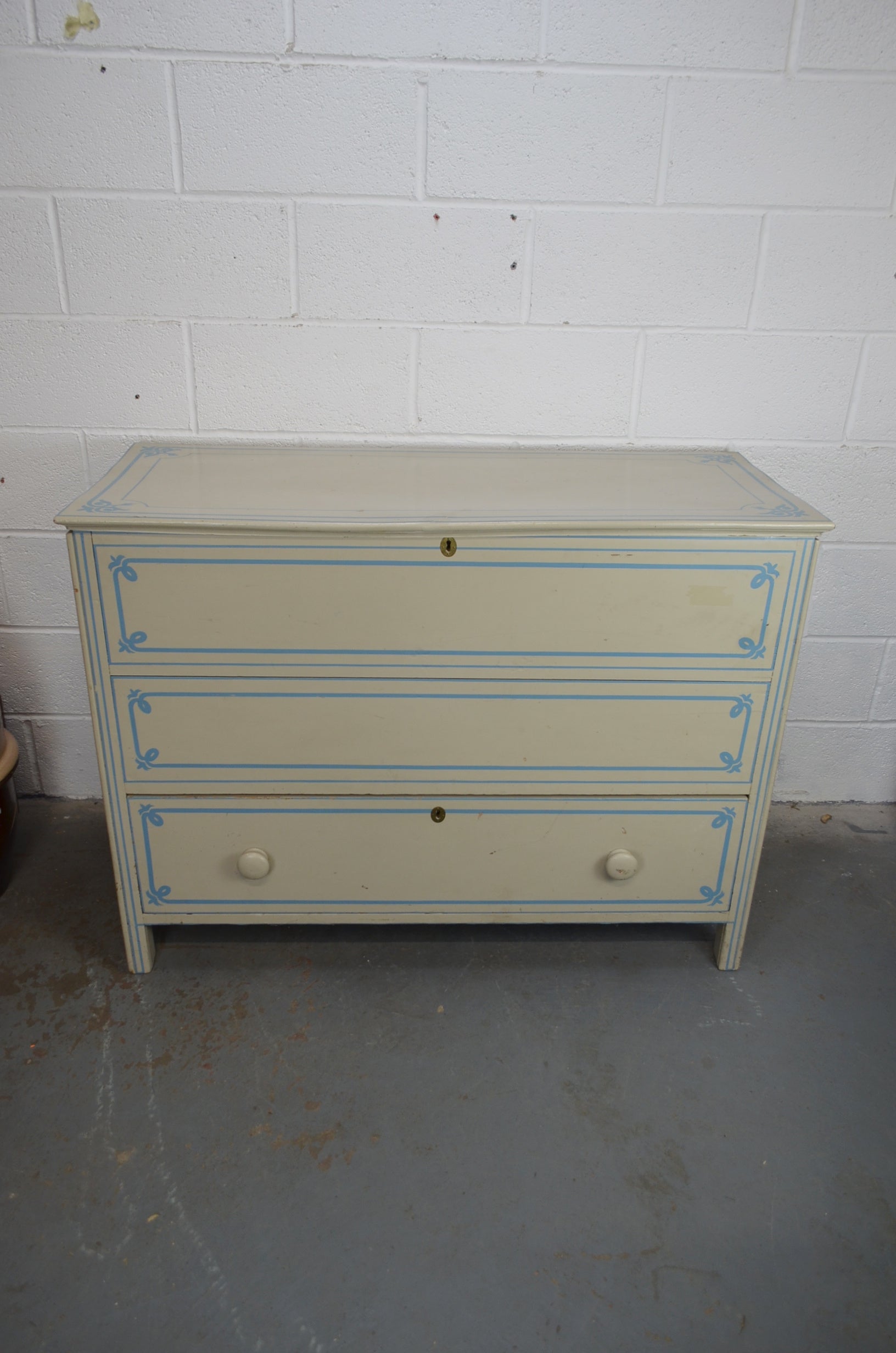A large 19th century painted coffer chest. The chest raised on block feet, having a single drawer to base with turned knob handles. Featuring a hinged top, opening to reveal space to interior. Painted in a cream colourway with blue linework details.
