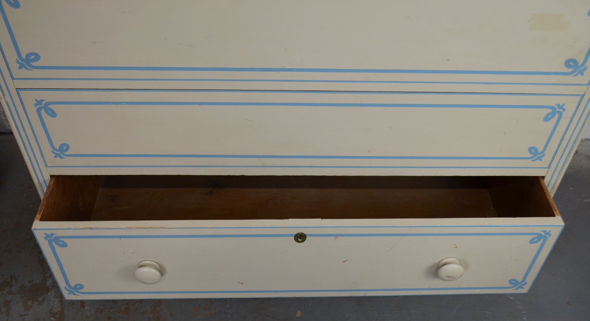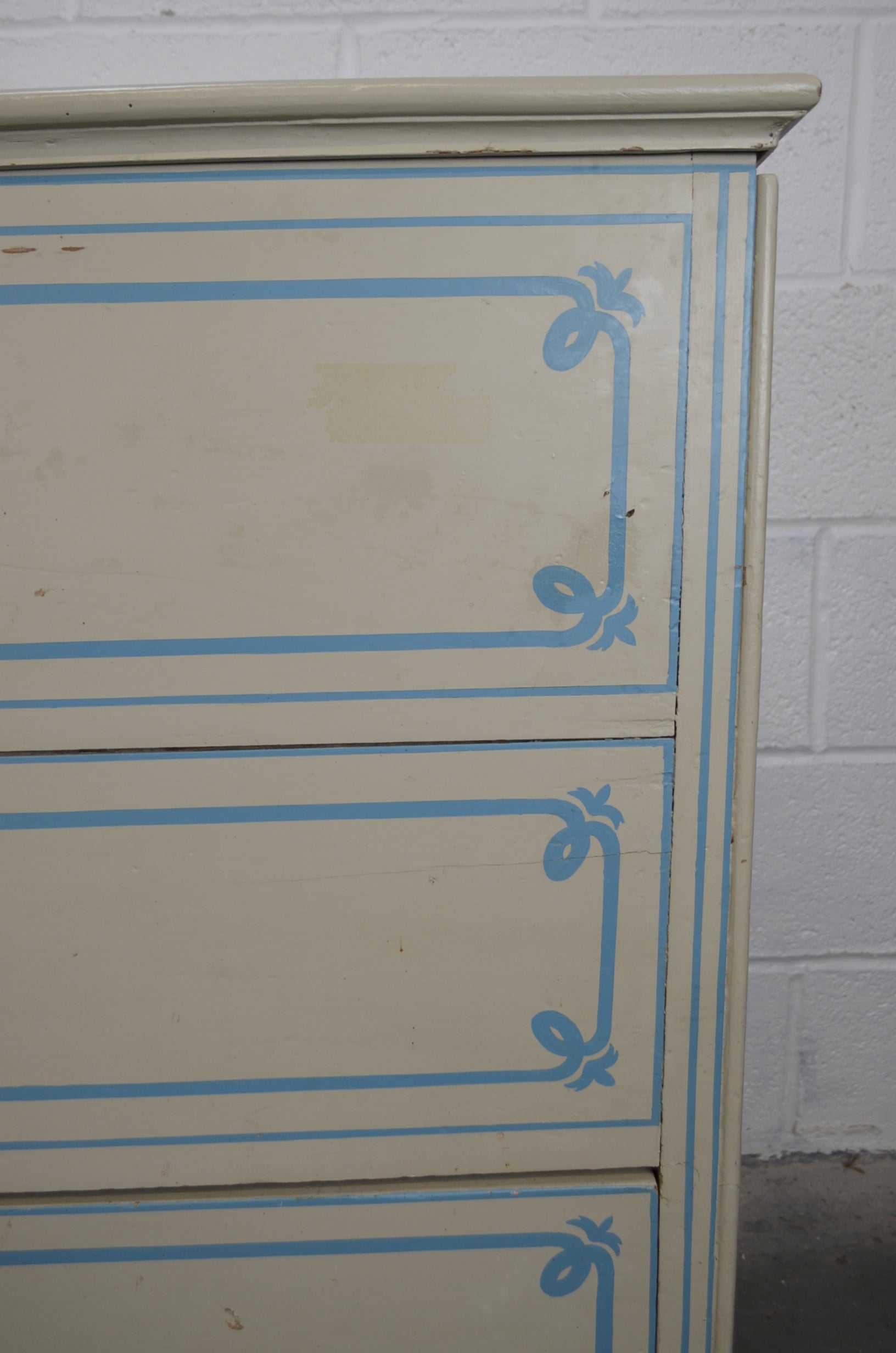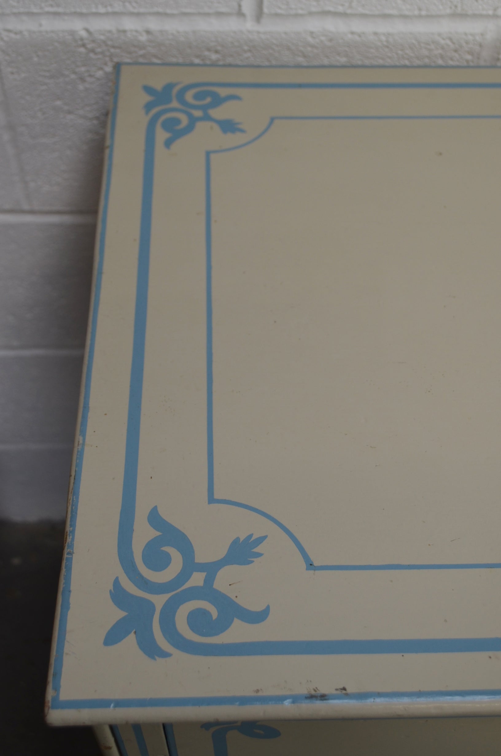 A large 19th century painted coffer chest. The chest raised on block feet, having a single drawer to base with turned knob handles. Featuring a hinged top, opening to reveal space to interior. Painted in a cream colourway with blue linework details.