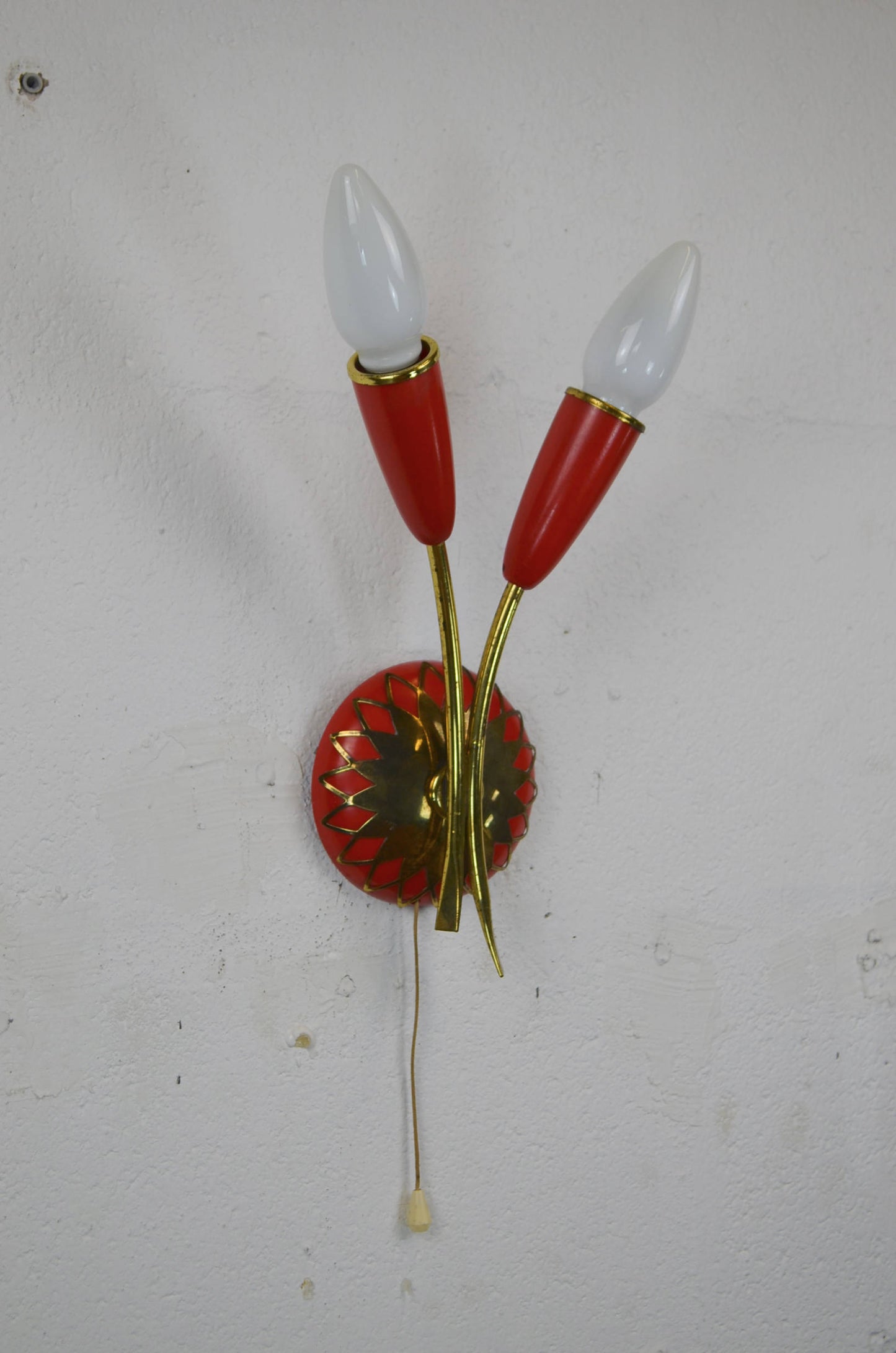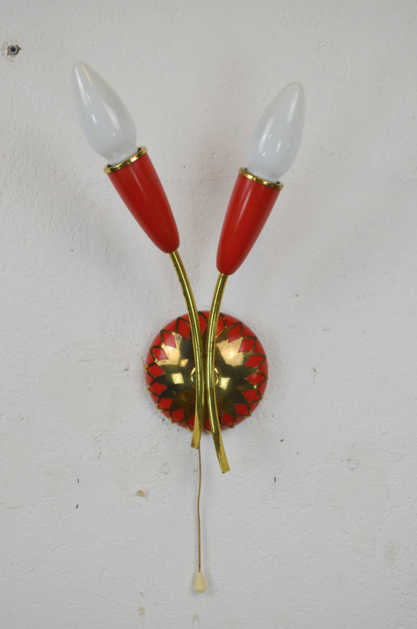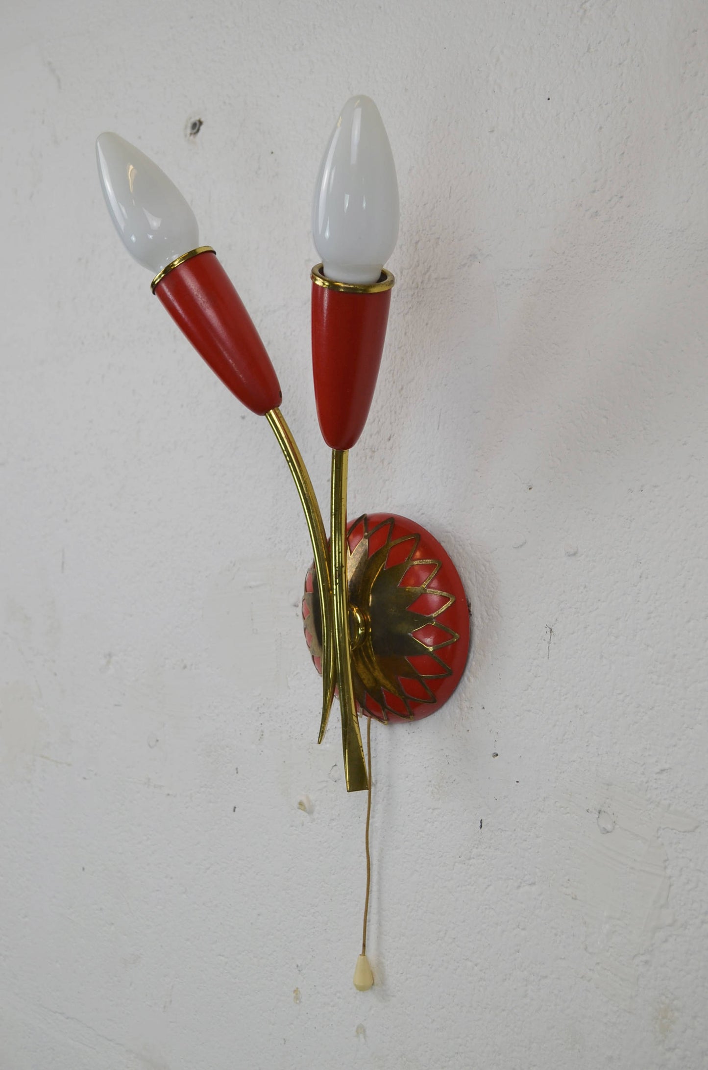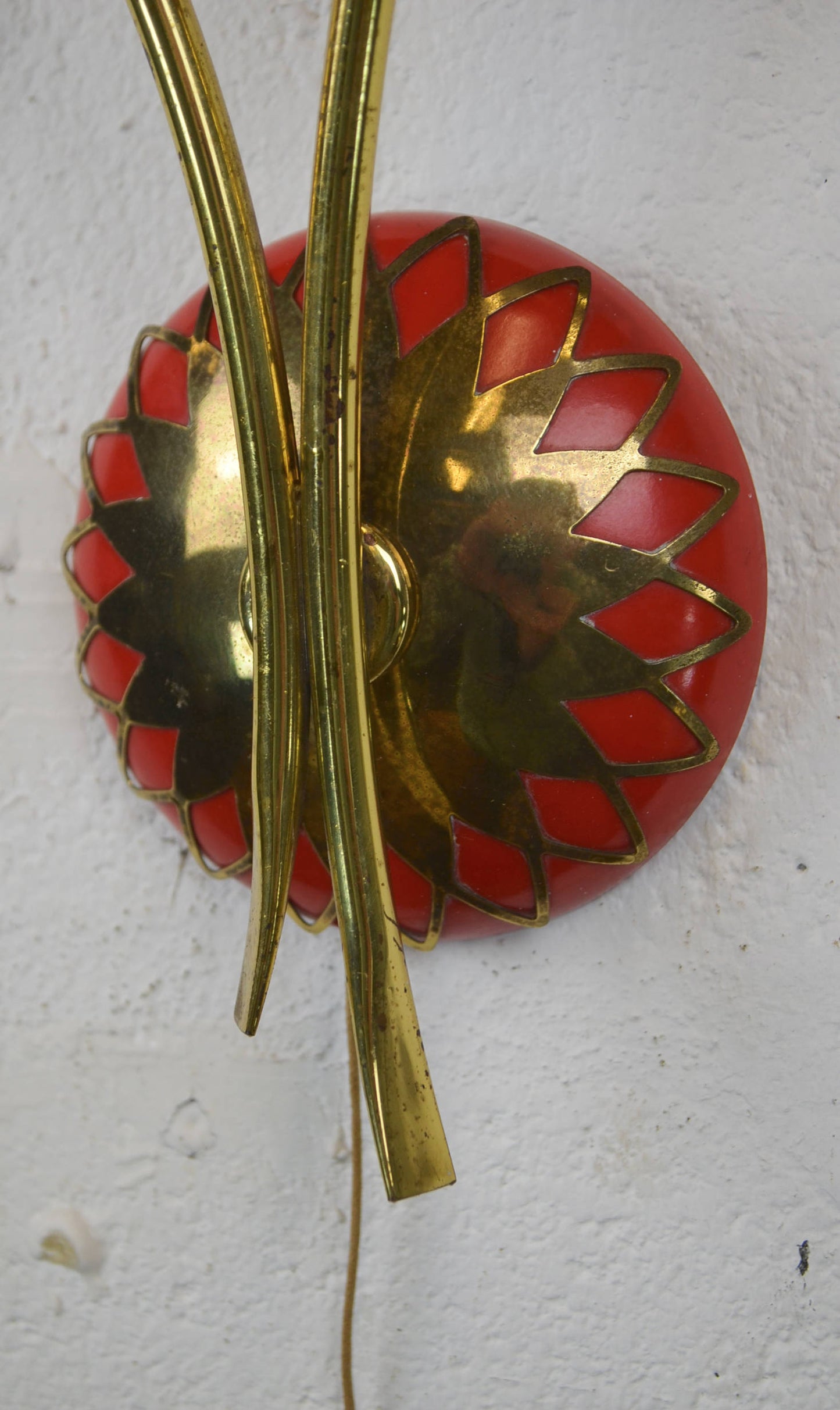 A matching set of four mid vintage retro 20th century 1960's wall lamps with twin red tulip glass sconces on a circular red and yellow metal bracket with chord pull switches.