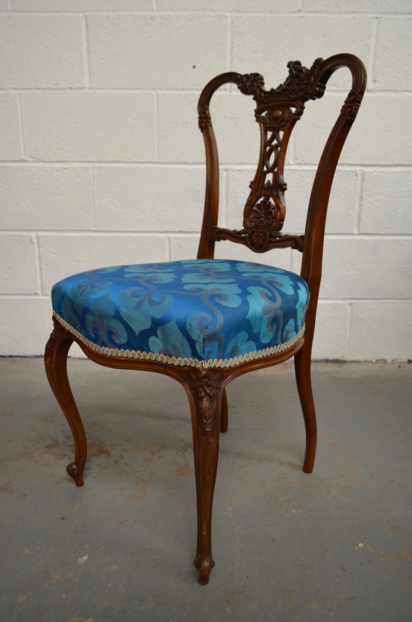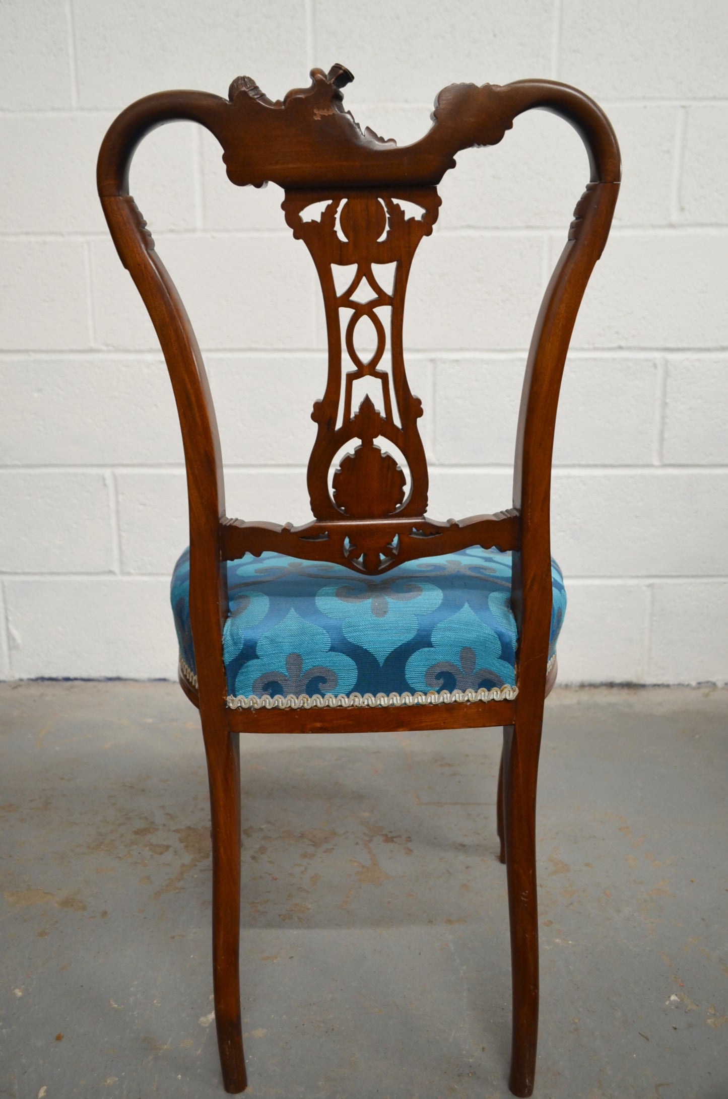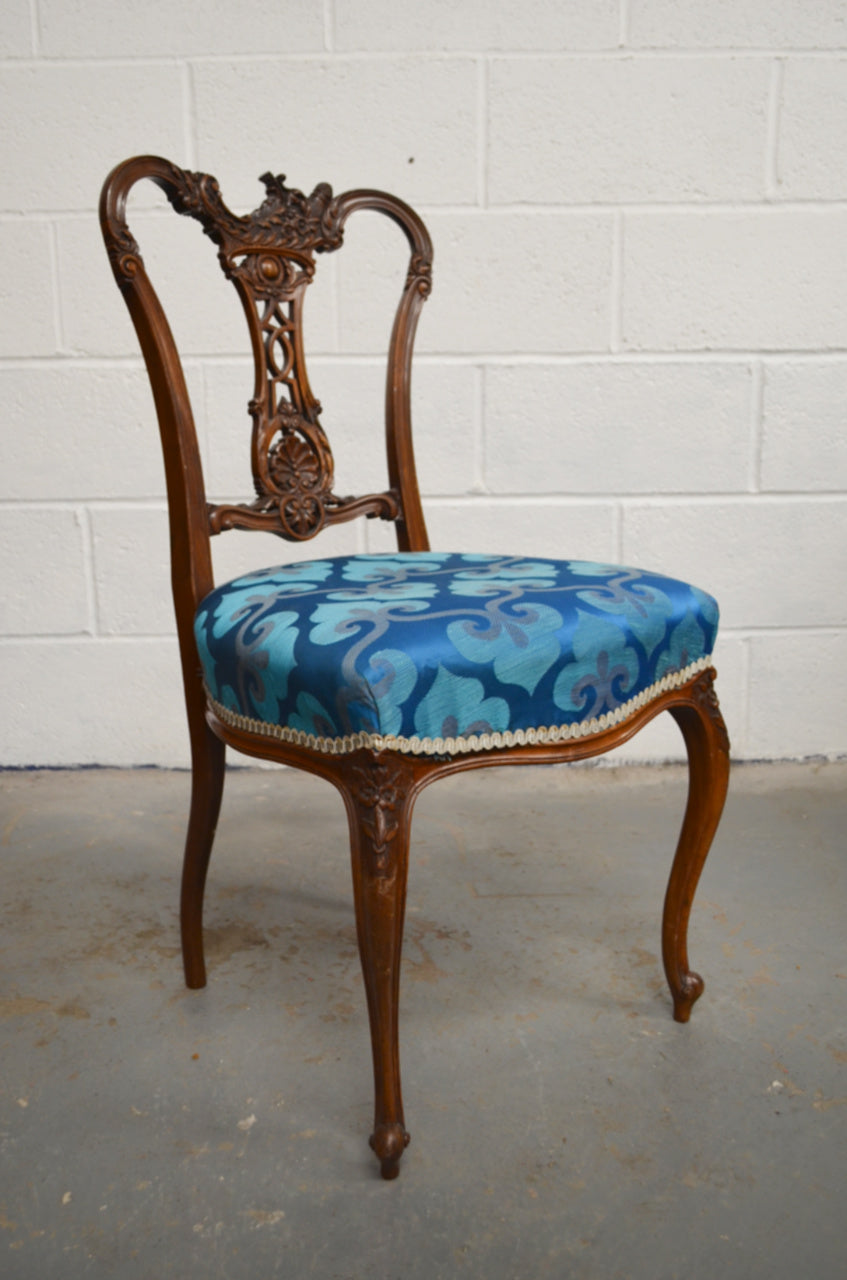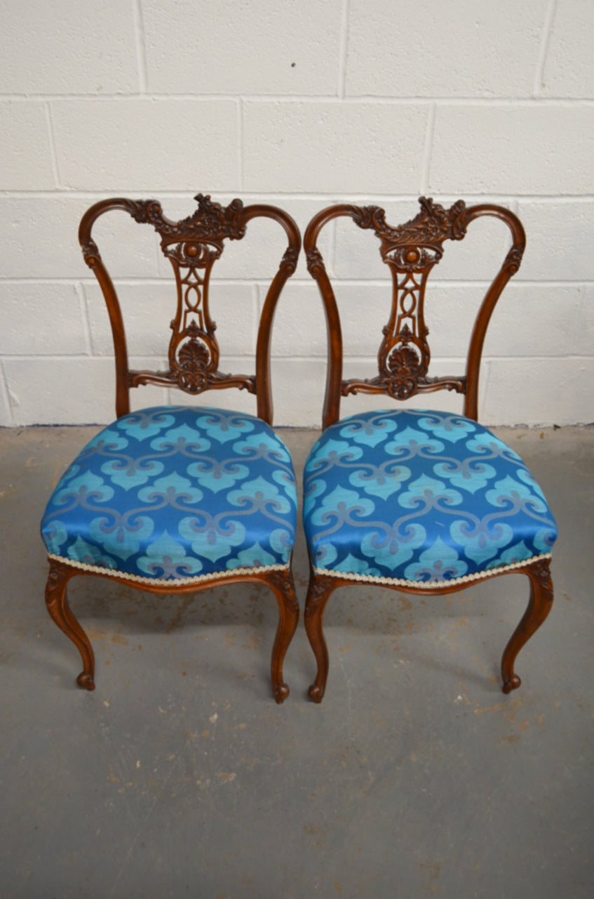 A pair of Edwardian mahogany/walnut dining/hall chairs with carved backs, over later upholstered seats, raised on bentwood tapered supports. The beautiful carving comprises of floral motifs and details.