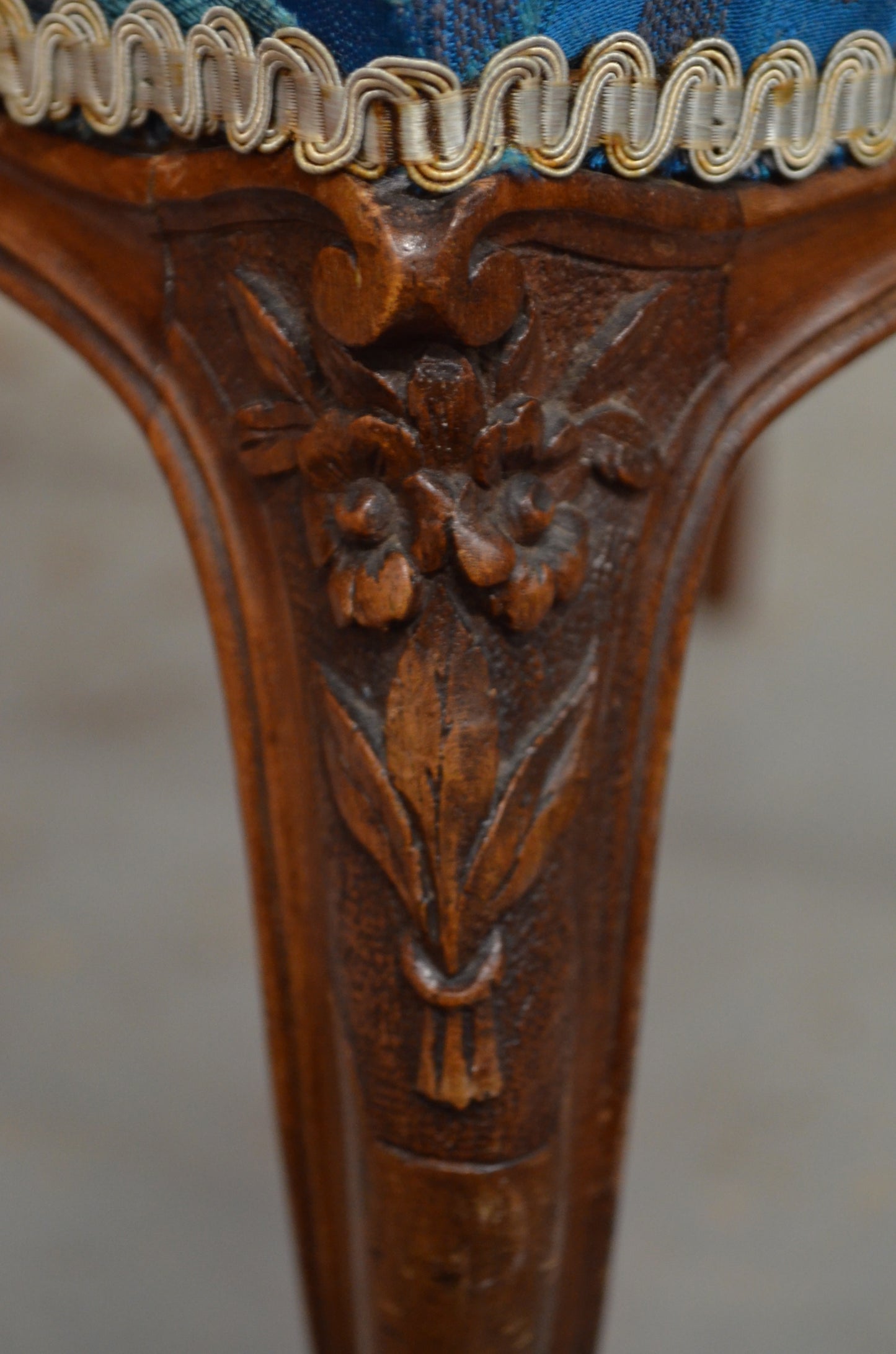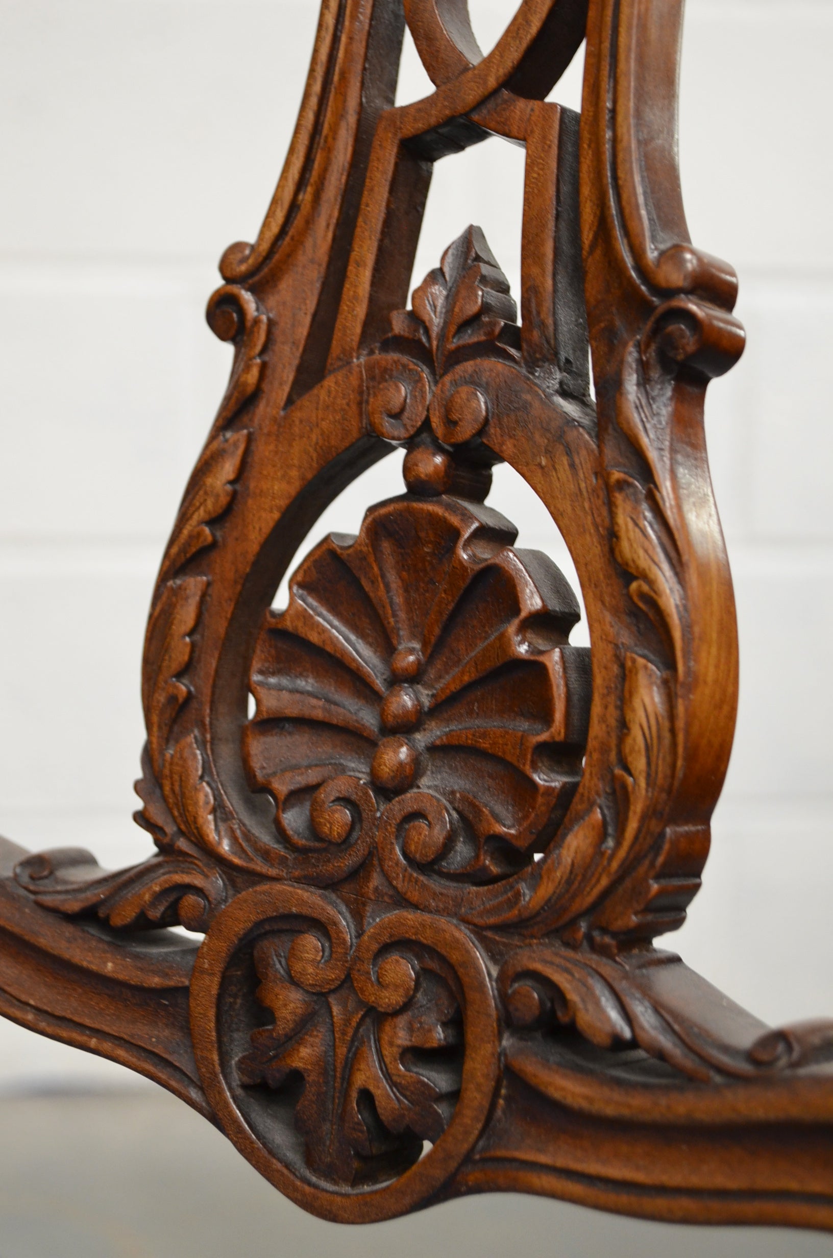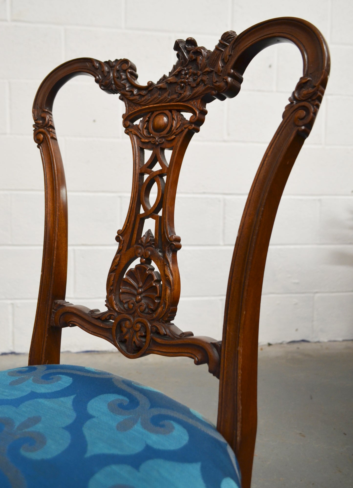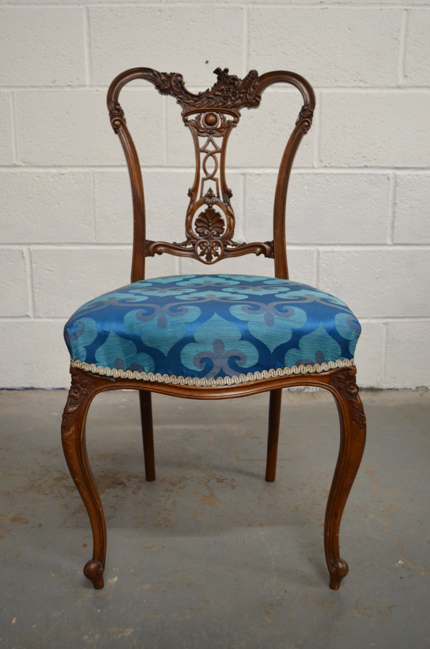 A pair of Edwardian mahogany/walnut dining/hall chairs with carved backs, over later upholstered seats, raised on bentwood tapered supports. The beautiful carving comprises of floral motifs and details.