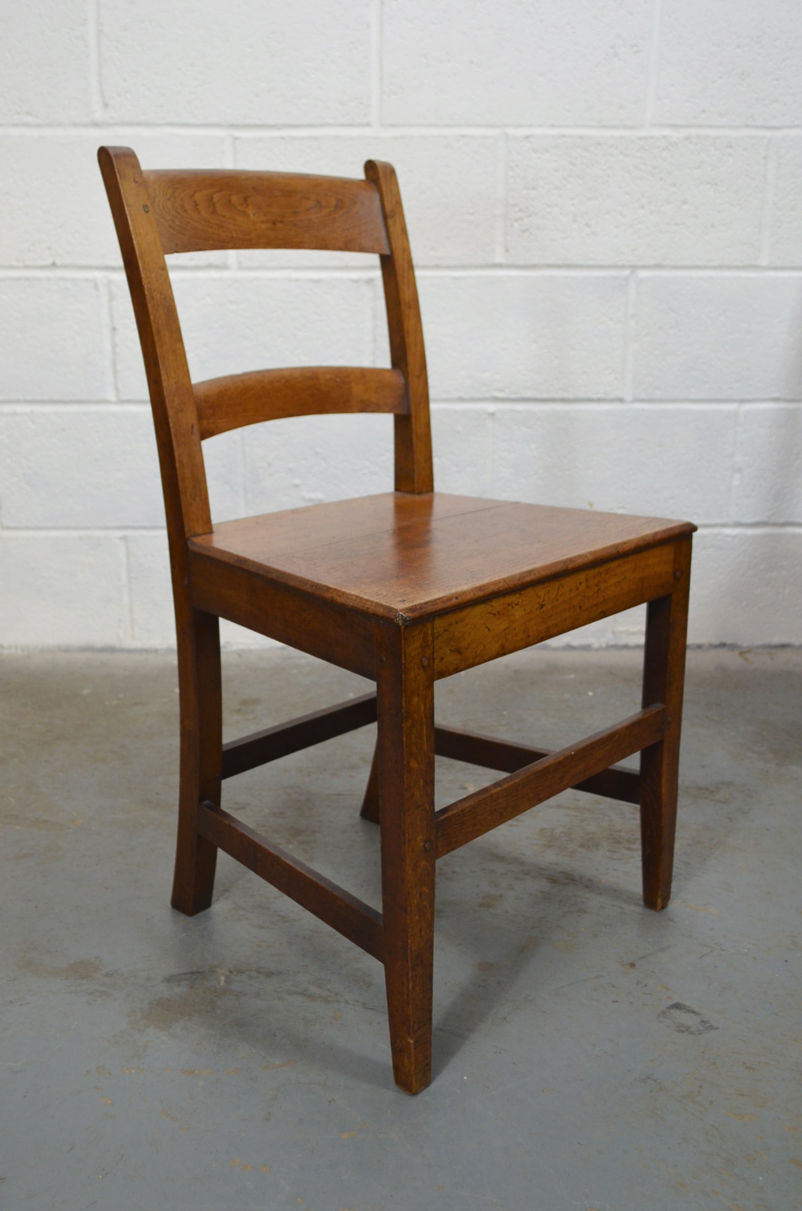A pair of antique oak country cottage/house Georgian dining chairs with stick backs over solid seats and square cut and moulded supports united by stretchers. Wonderful colour and patina with peg jointed construction