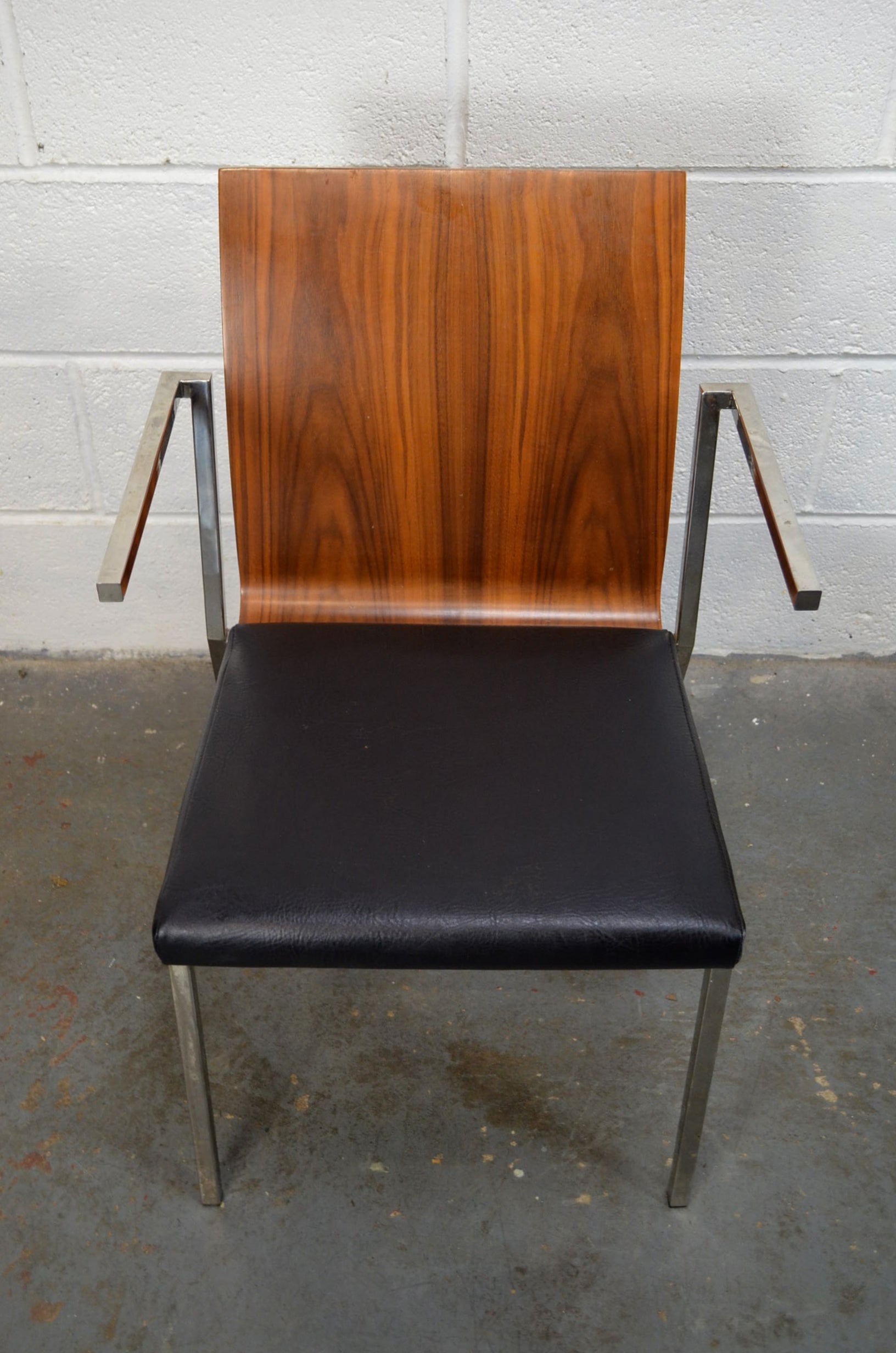 A retro desk/carver chair made with a chromed metal square frame, walnut veneered back and a black faux leather seat. Really good design and comfortable to sit in.