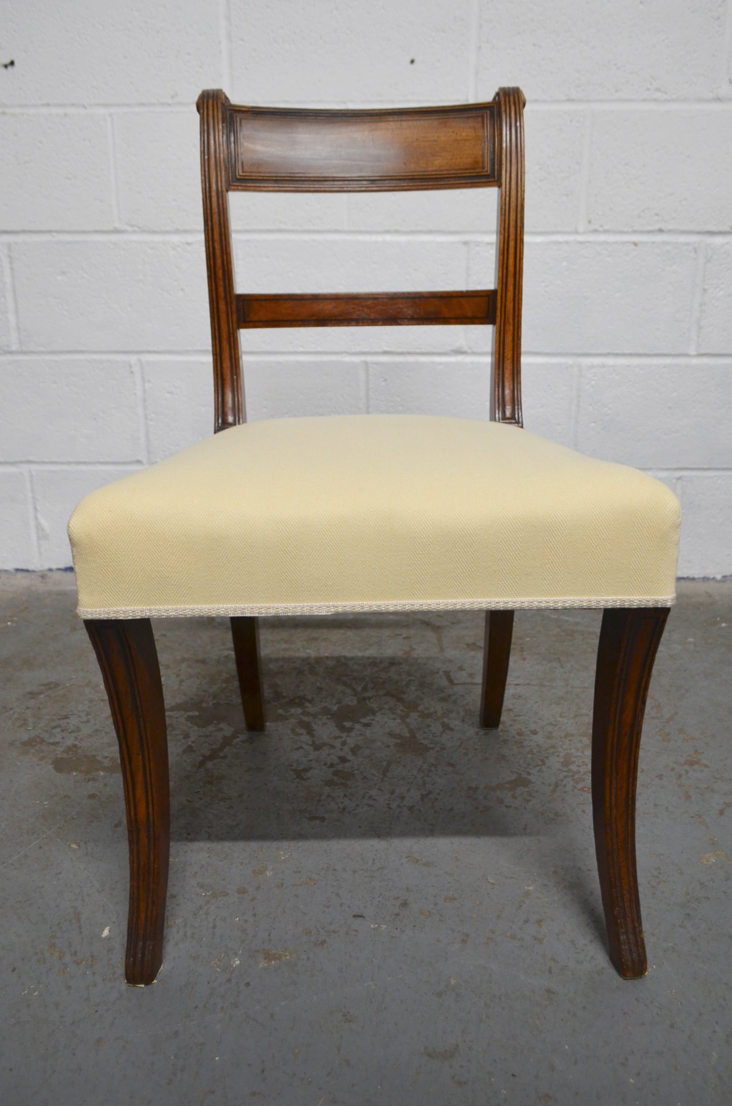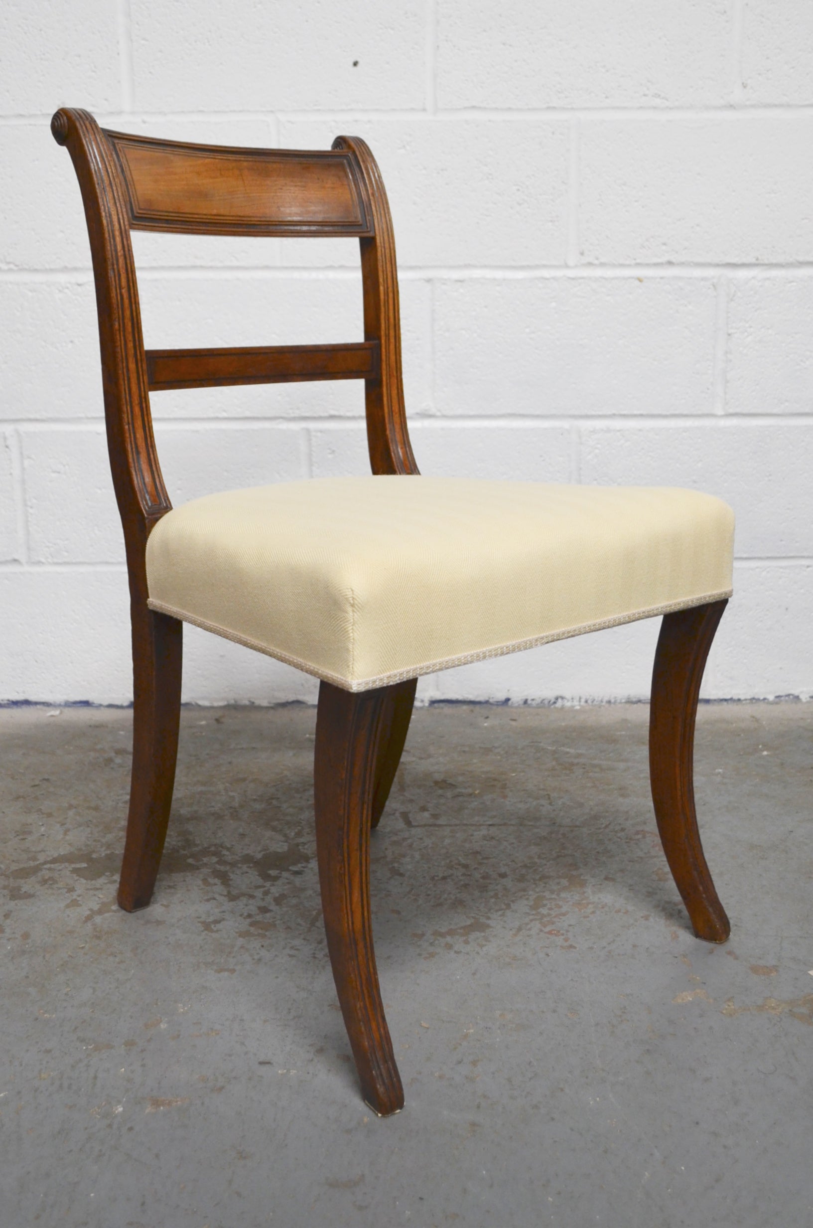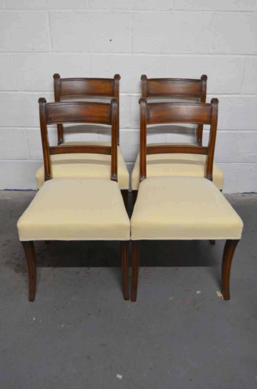 A set of four Georgian mahogany dining chairs with reeded bow-backs on scroll supports, padded seats & on reeded sabre legs.