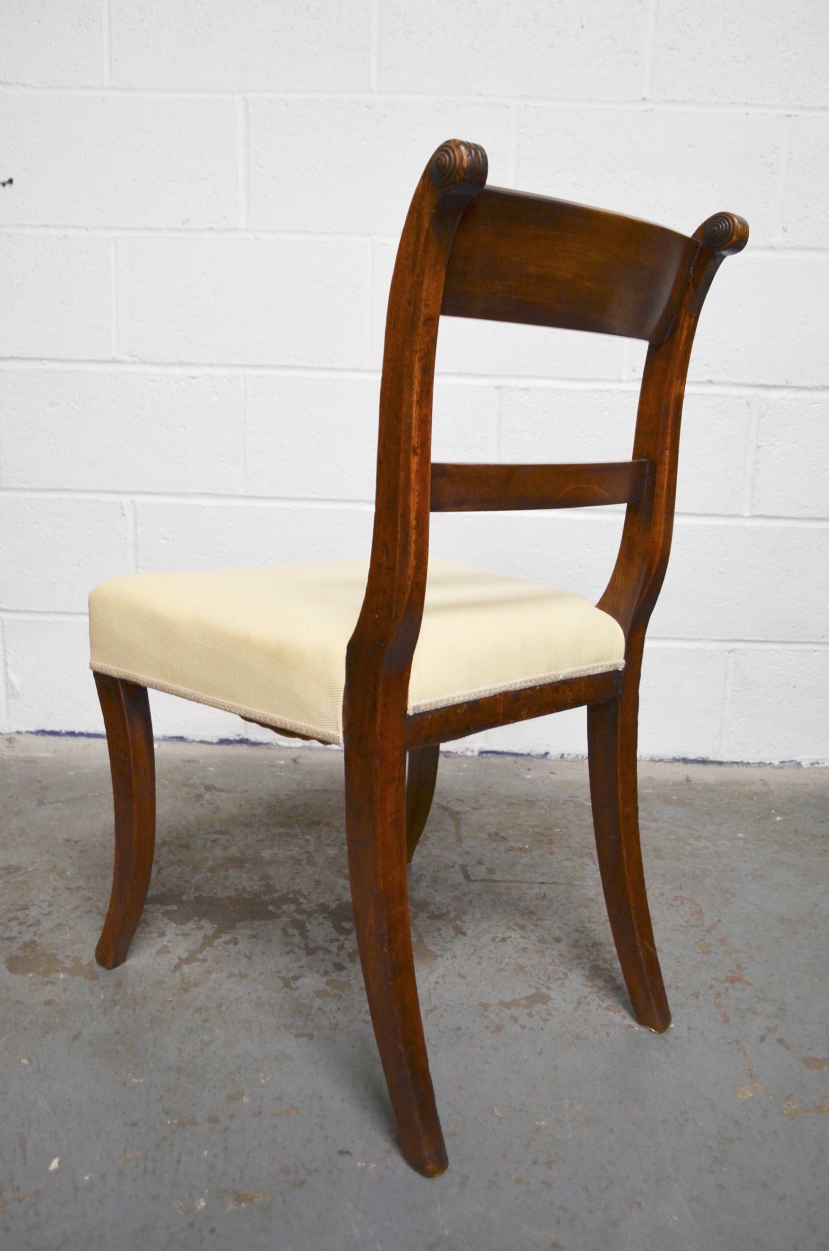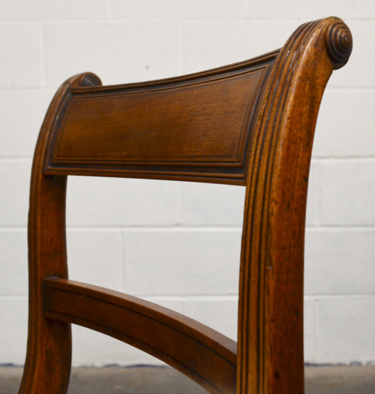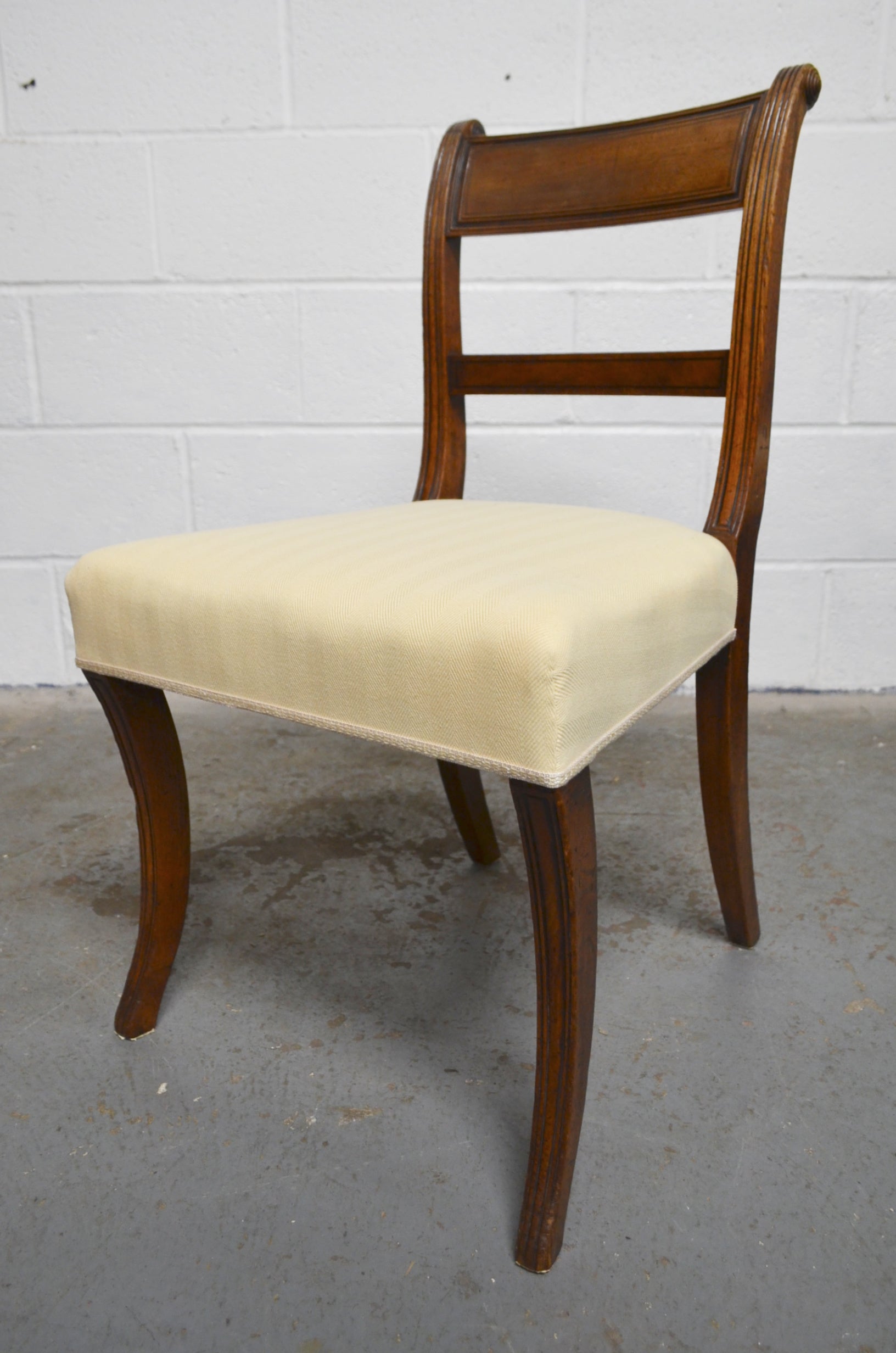 A set of four Georgian mahogany dining chairs with reeded bow-backs on scroll supports, padded seats & on reeded sabre legs.