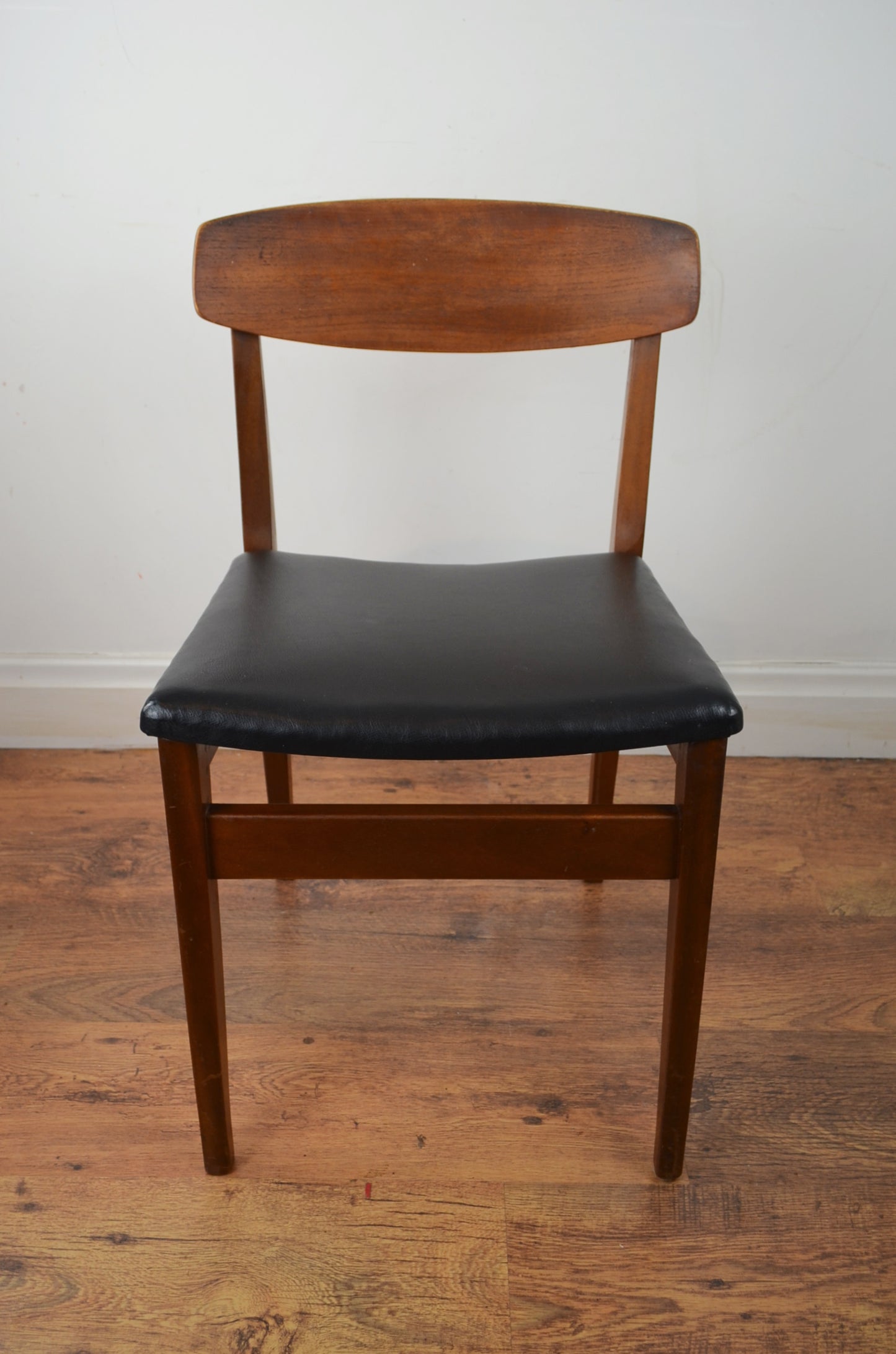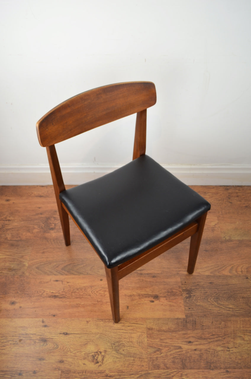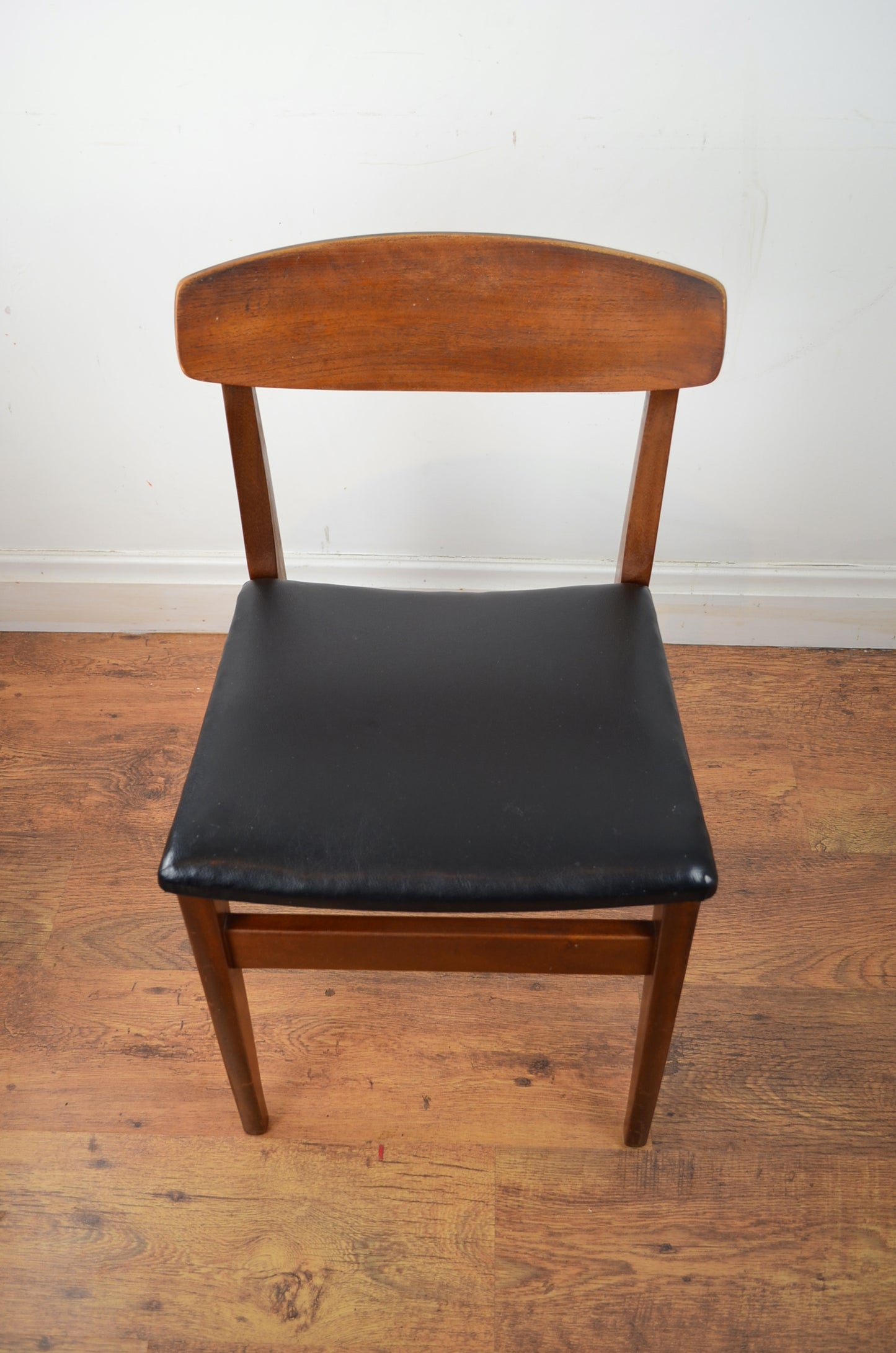 A group of four 1970's teak wood framed ladder back dining chairs being raised on tapering turned legs with black faux leather upholstered seats pads.