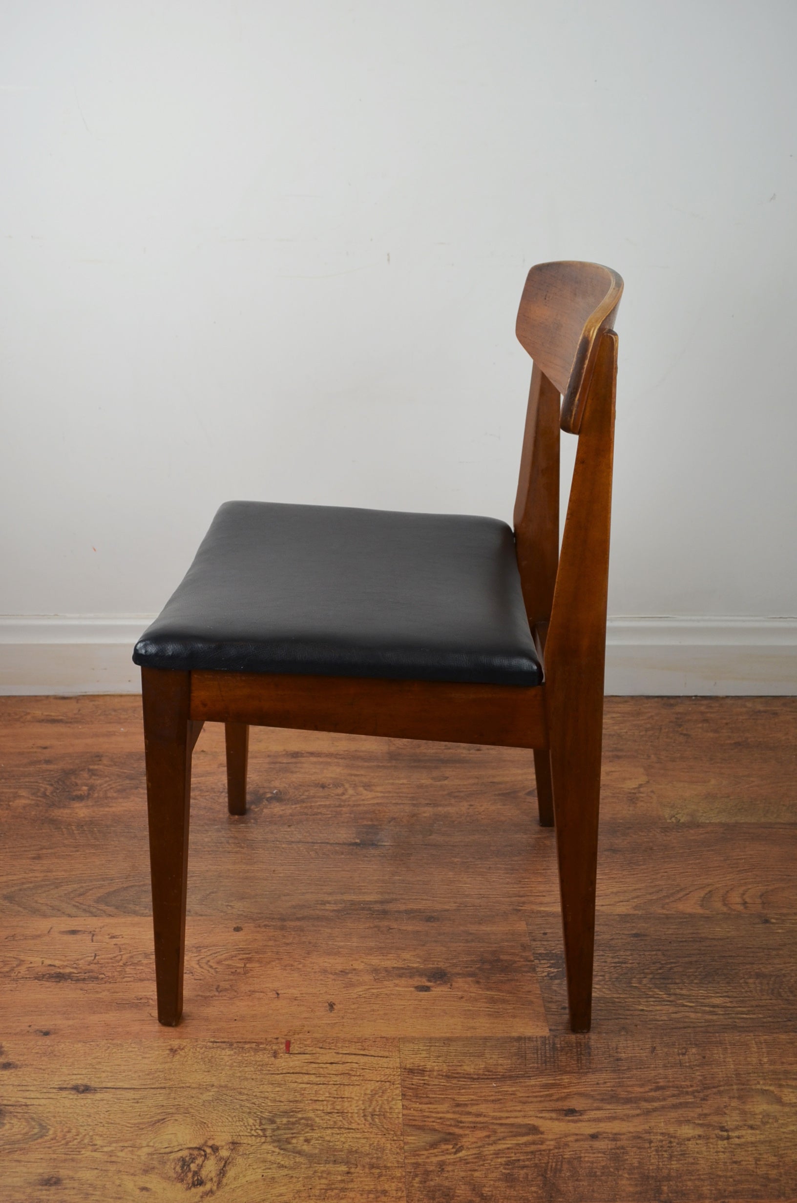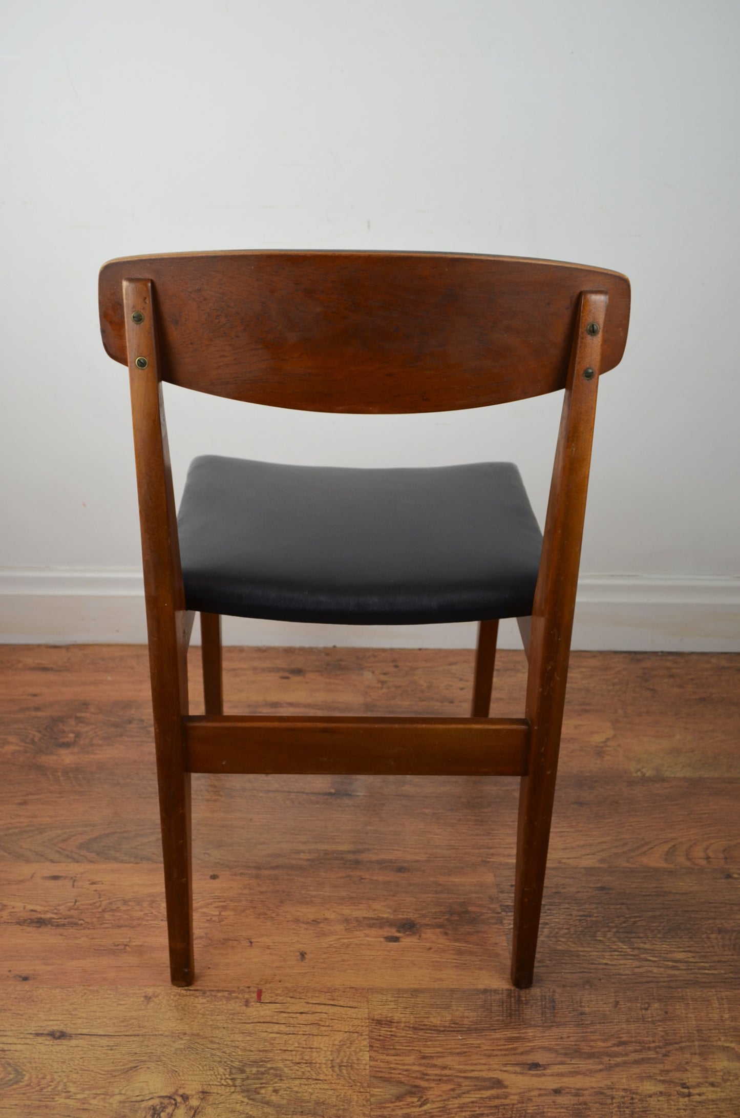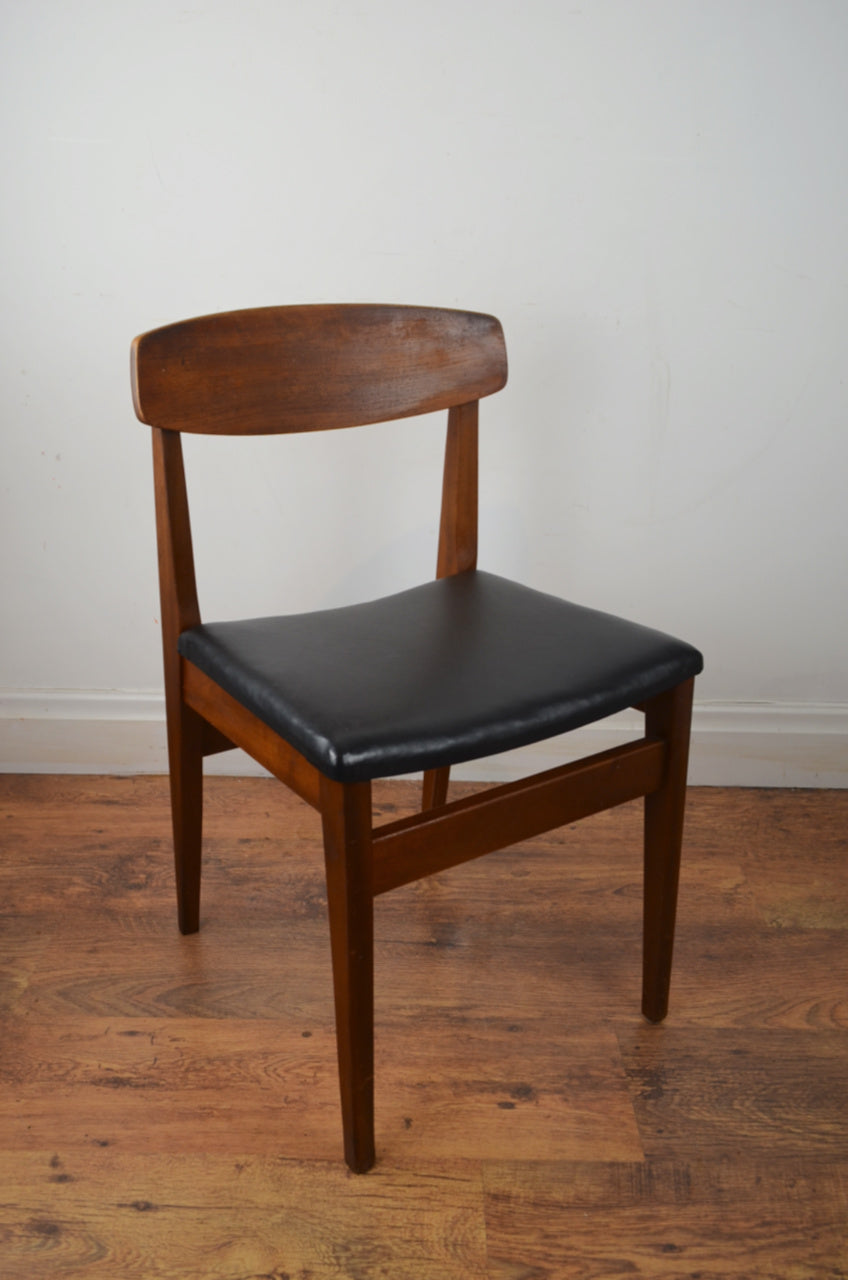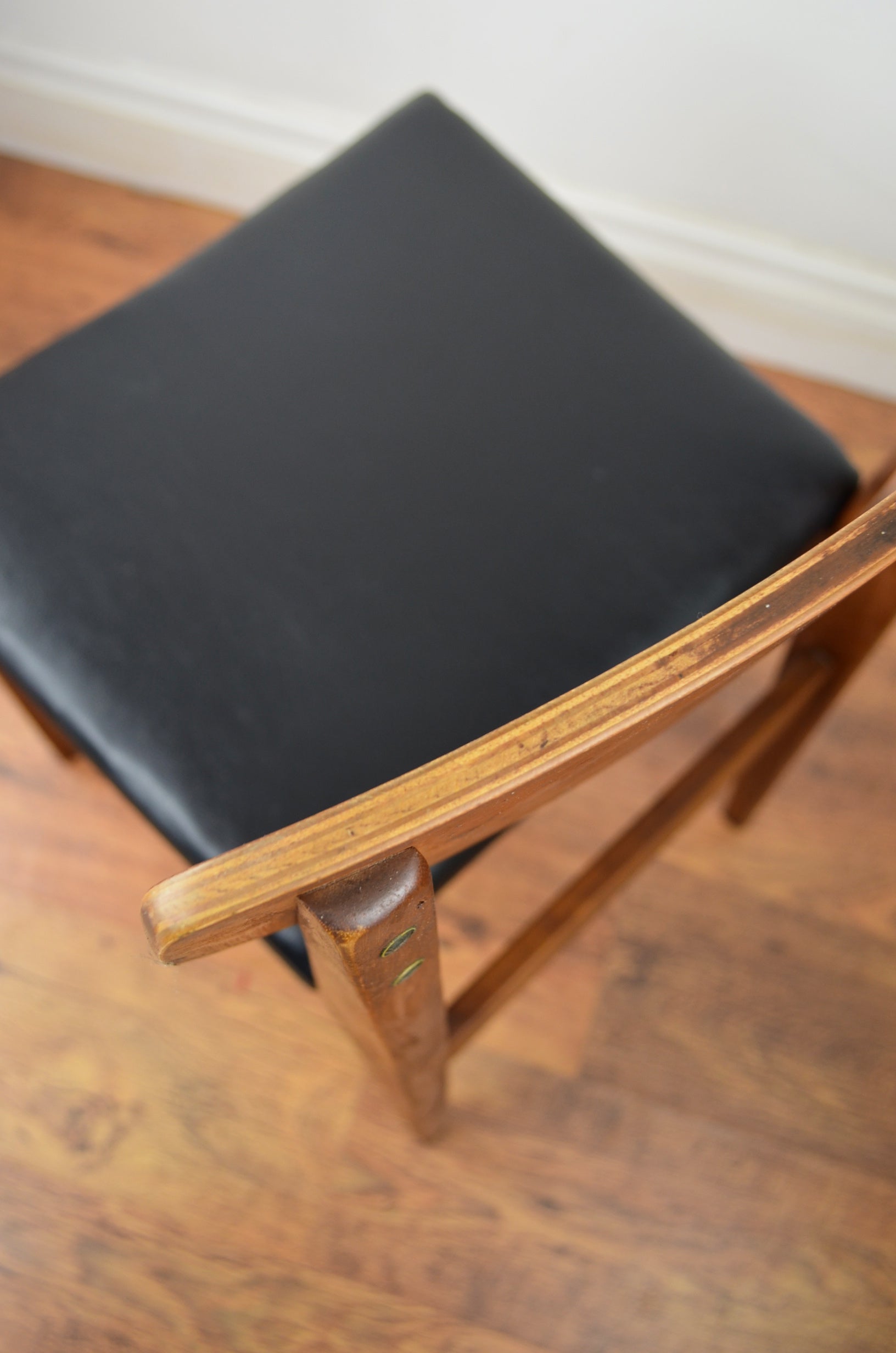 A group of four 1970's teak wood framed ladder back dining chairs being raised on tapering turned legs with black faux leather upholstered seats pads.