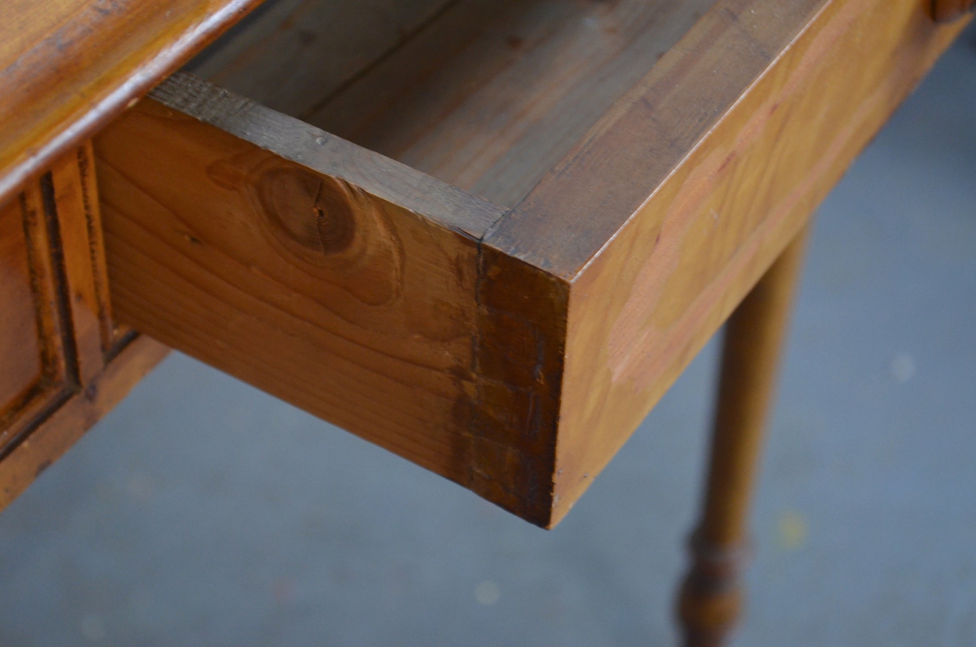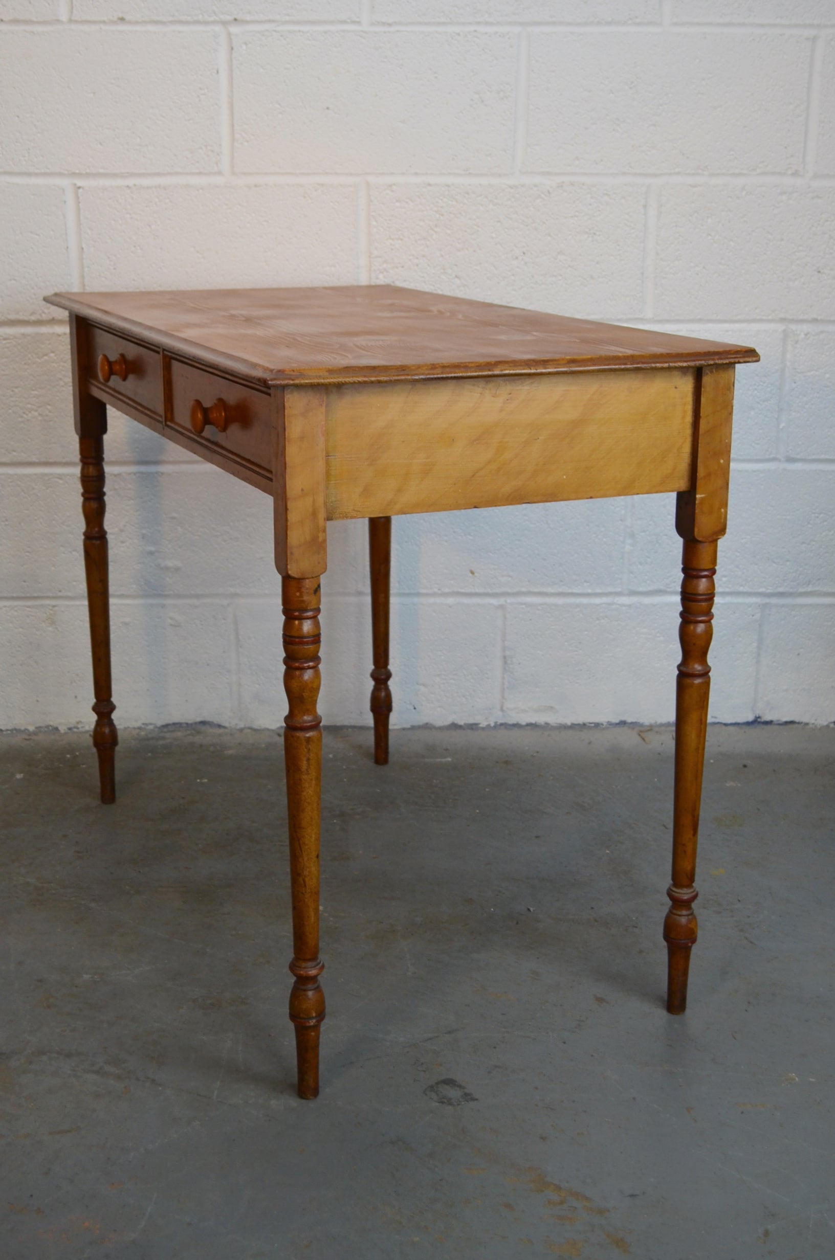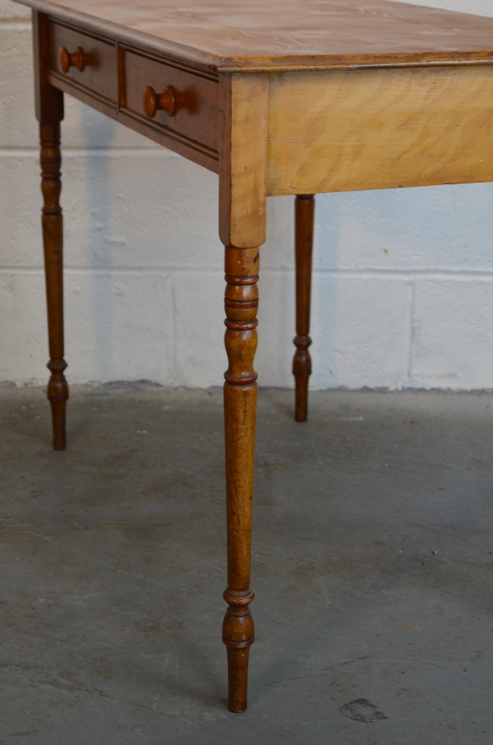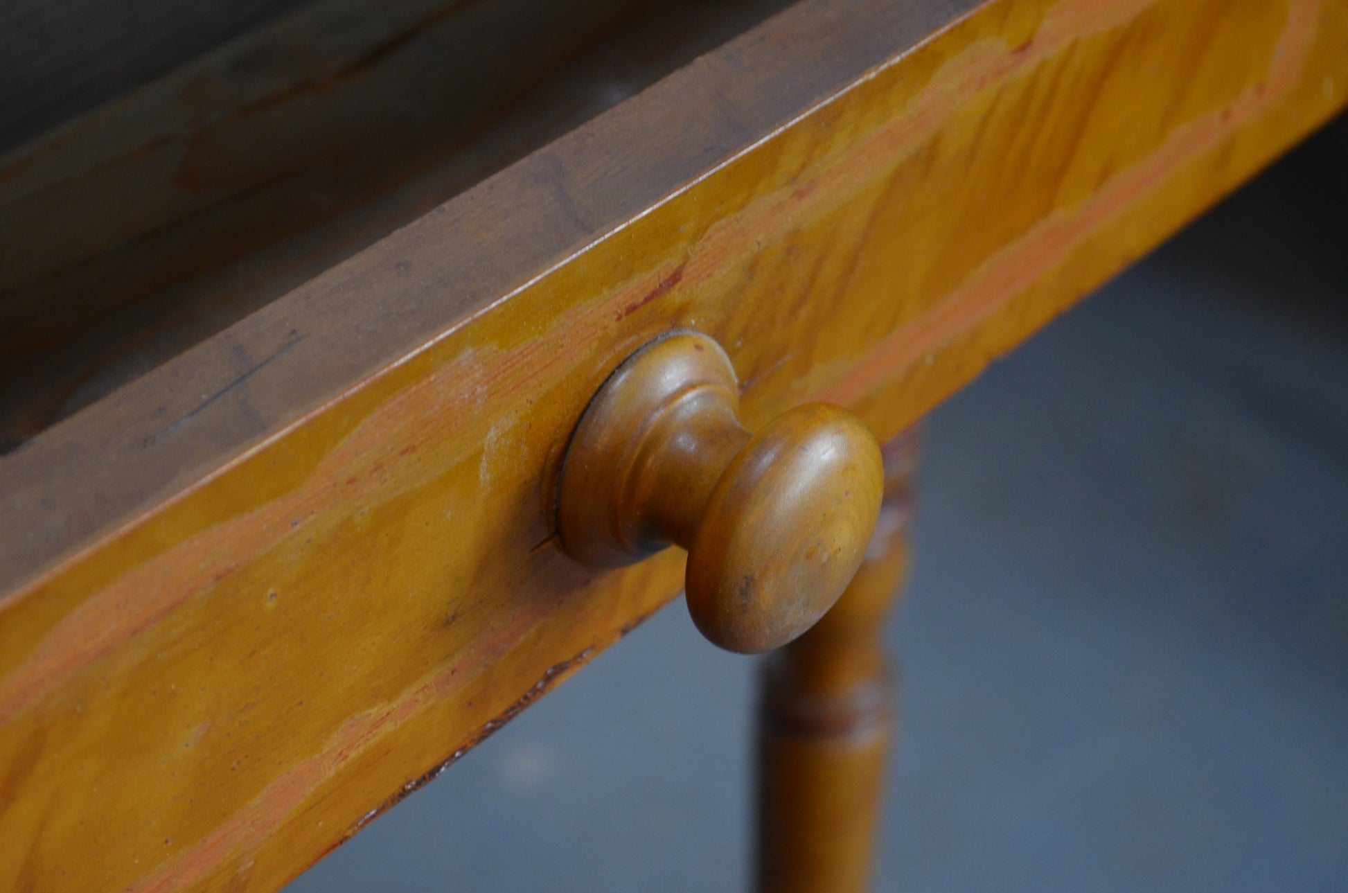 A Victorian painted pine desk/table with stained and waxed top above original scumble glaze pair of frieze drawers, on turned legs.
