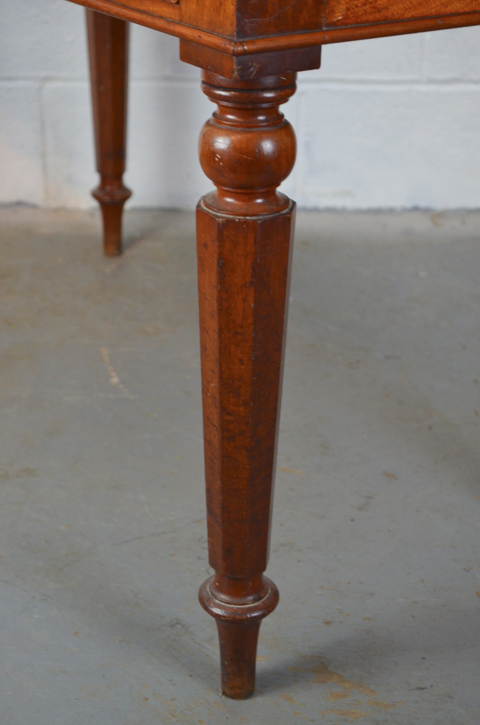 An early Victorian mahogany writing desk with a shaped gallery back over two drawers on turned and carved faceted tapering supports.
