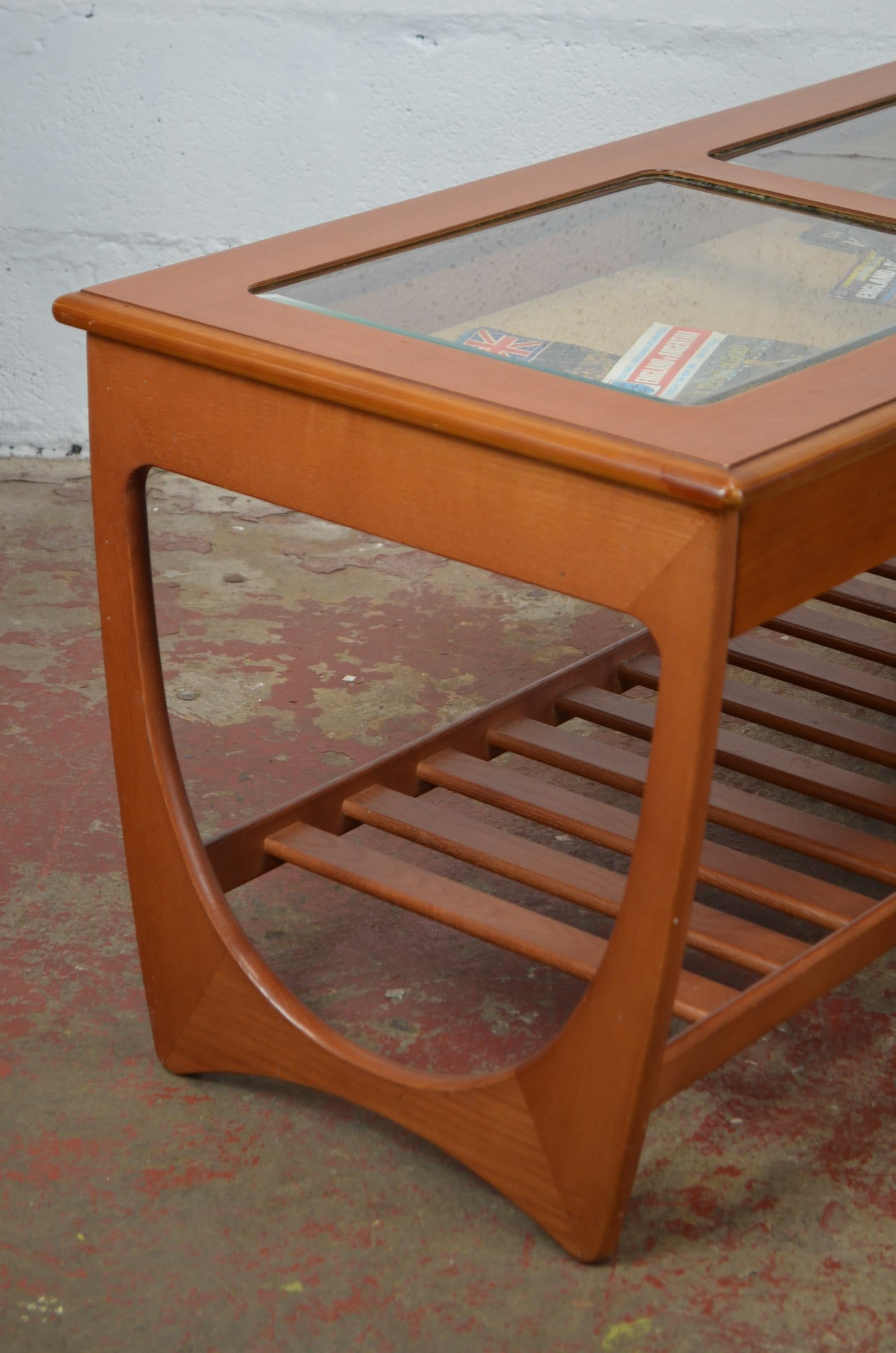 G-Plan Furniture - A late 20th century teak coffee occasional table. Twin glazed drop in glass inserts with drawers to frieze. On shaped supports united by magazine rack undertier.