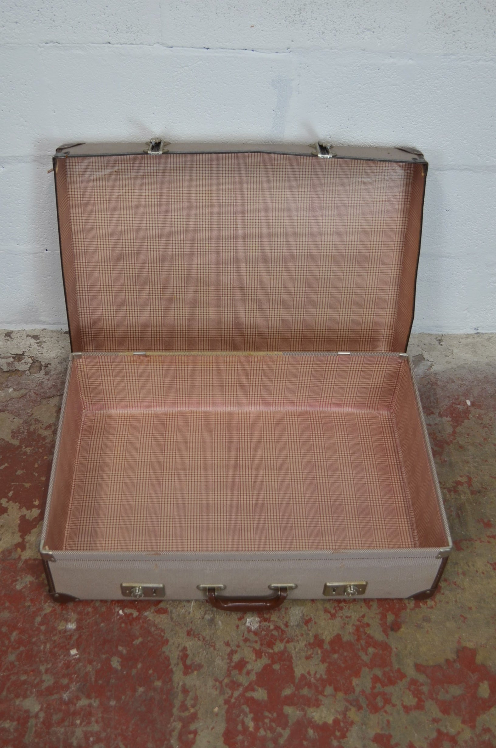 A large vintage grey travel suitcase with lined interior, long catches and what looks like a bakelite handle. A great piece of vintage that will work well as storage.