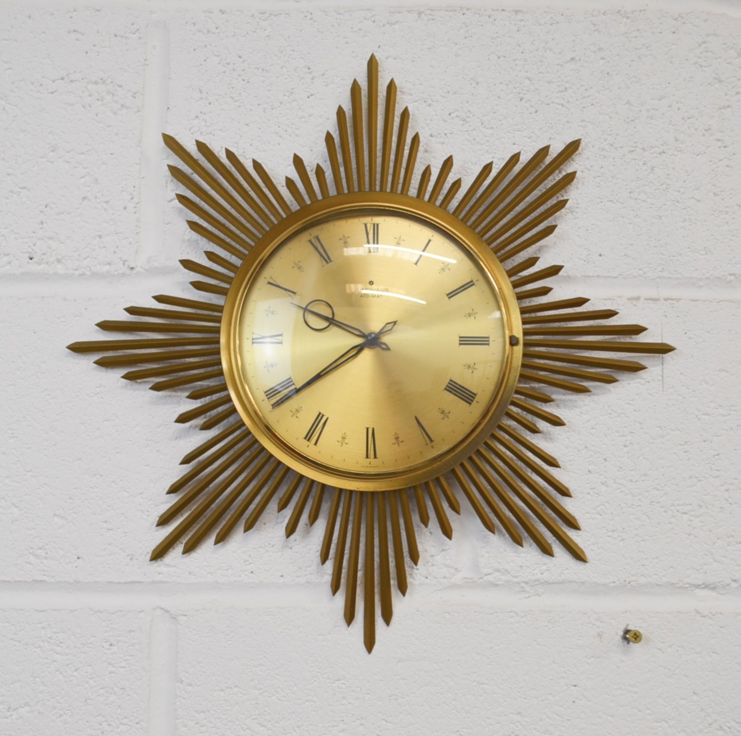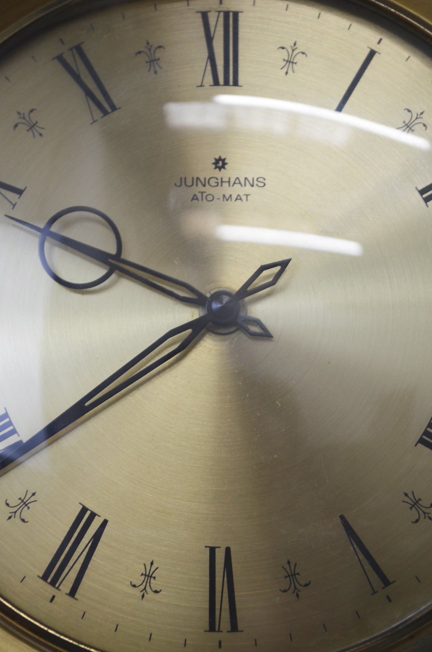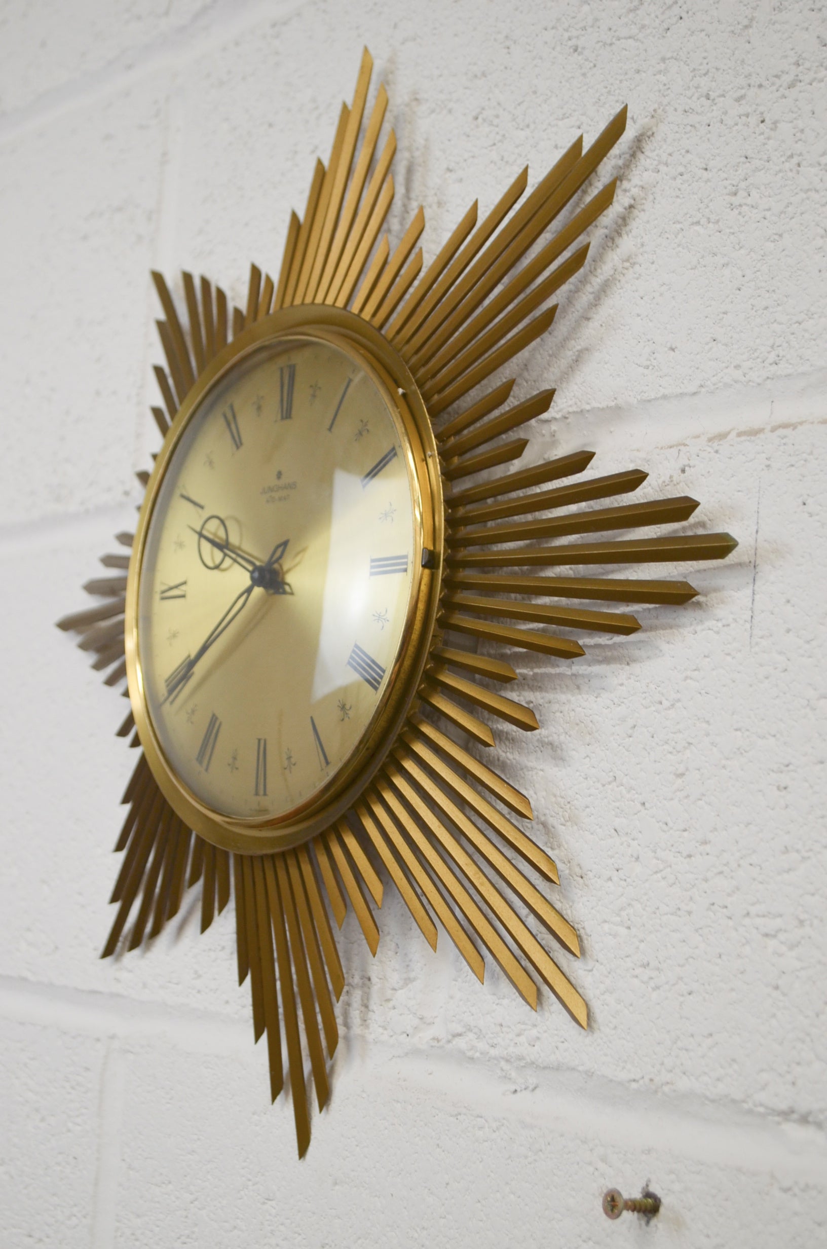 A vintage German made Junghans ATO mat wall timepiece in sunburst case. A vibrant gold colour which has been made to a high standard.