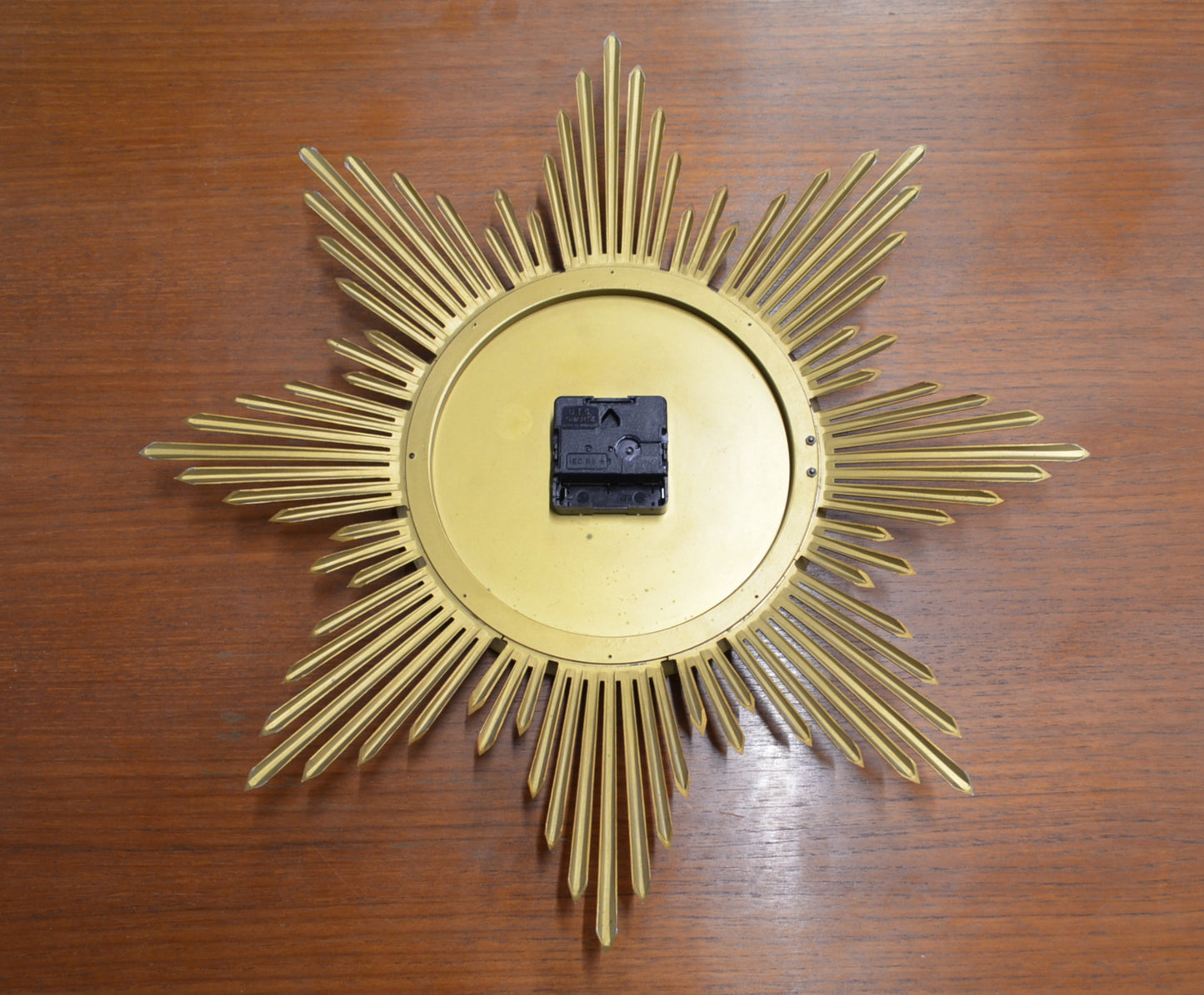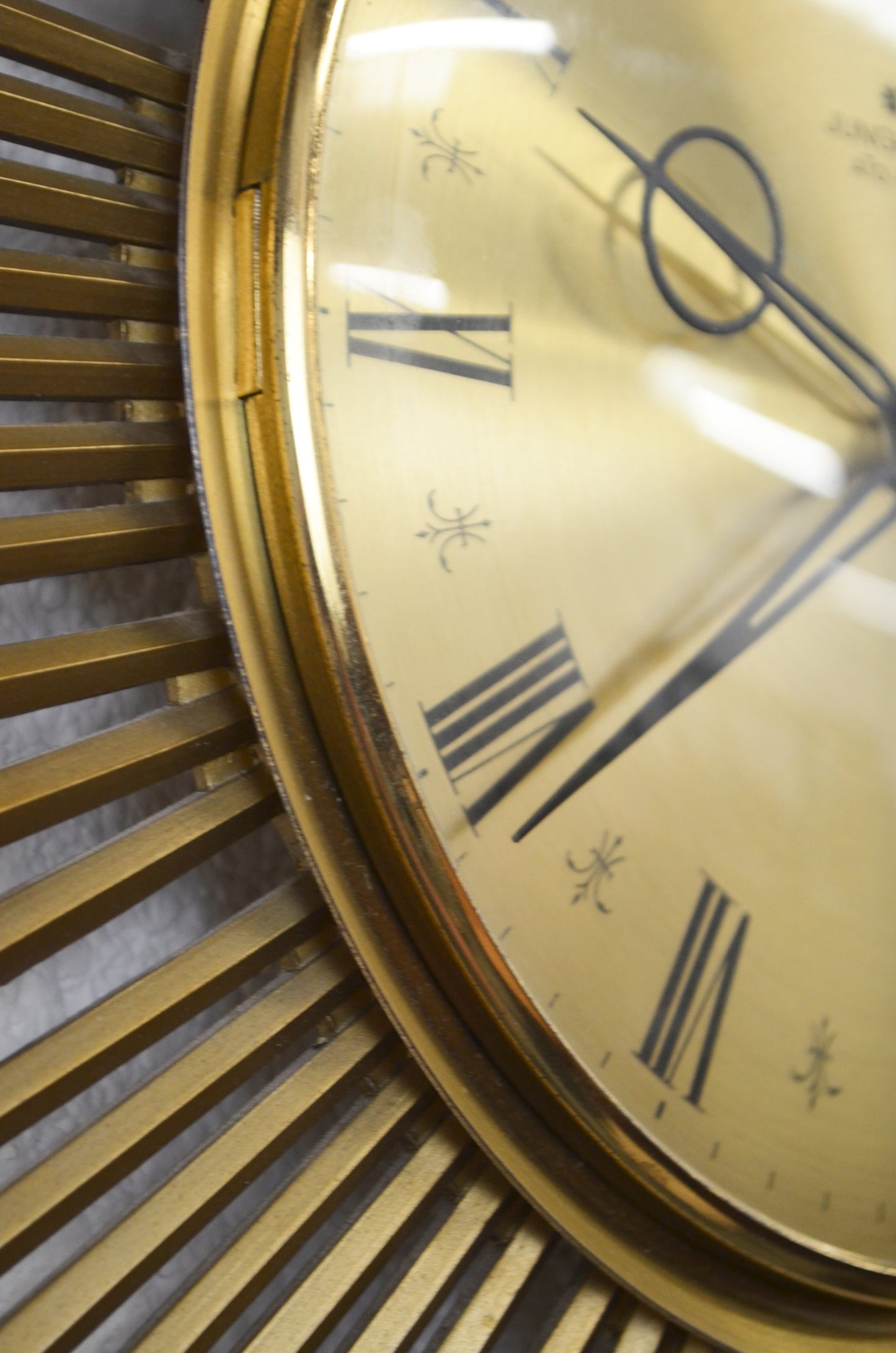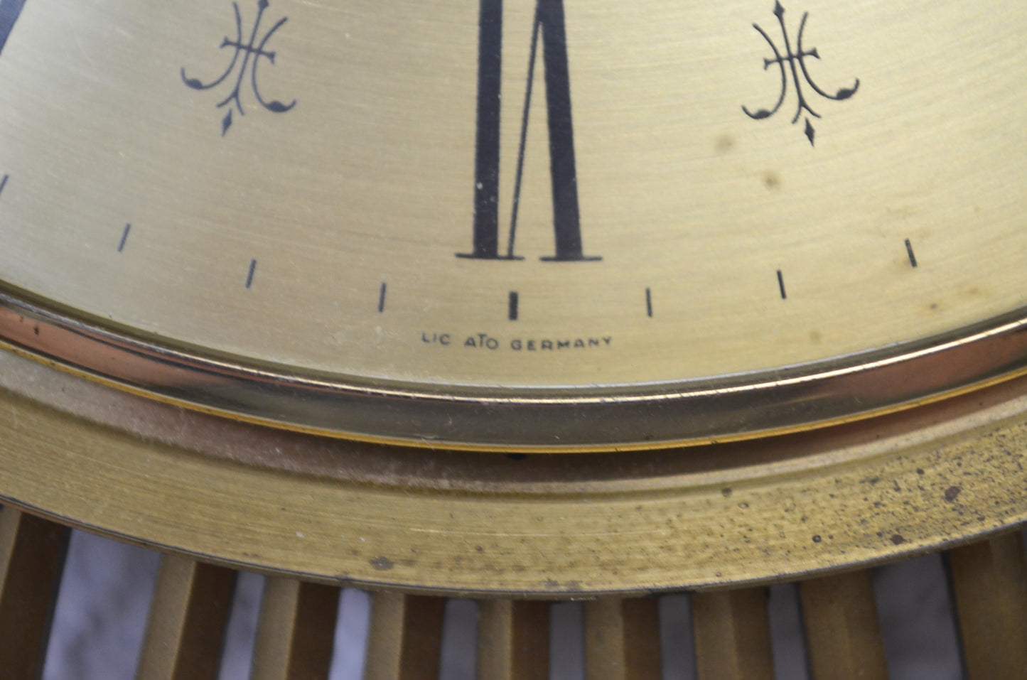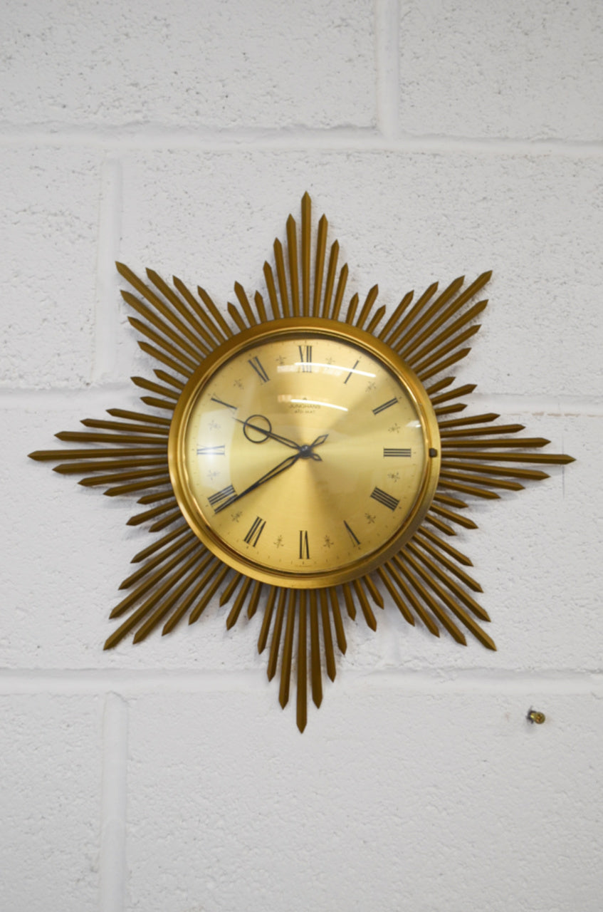 A vintage German made Junghans ATO mat wall timepiece in sunburst case. A vibrant gold colour which has been made to a high standard.