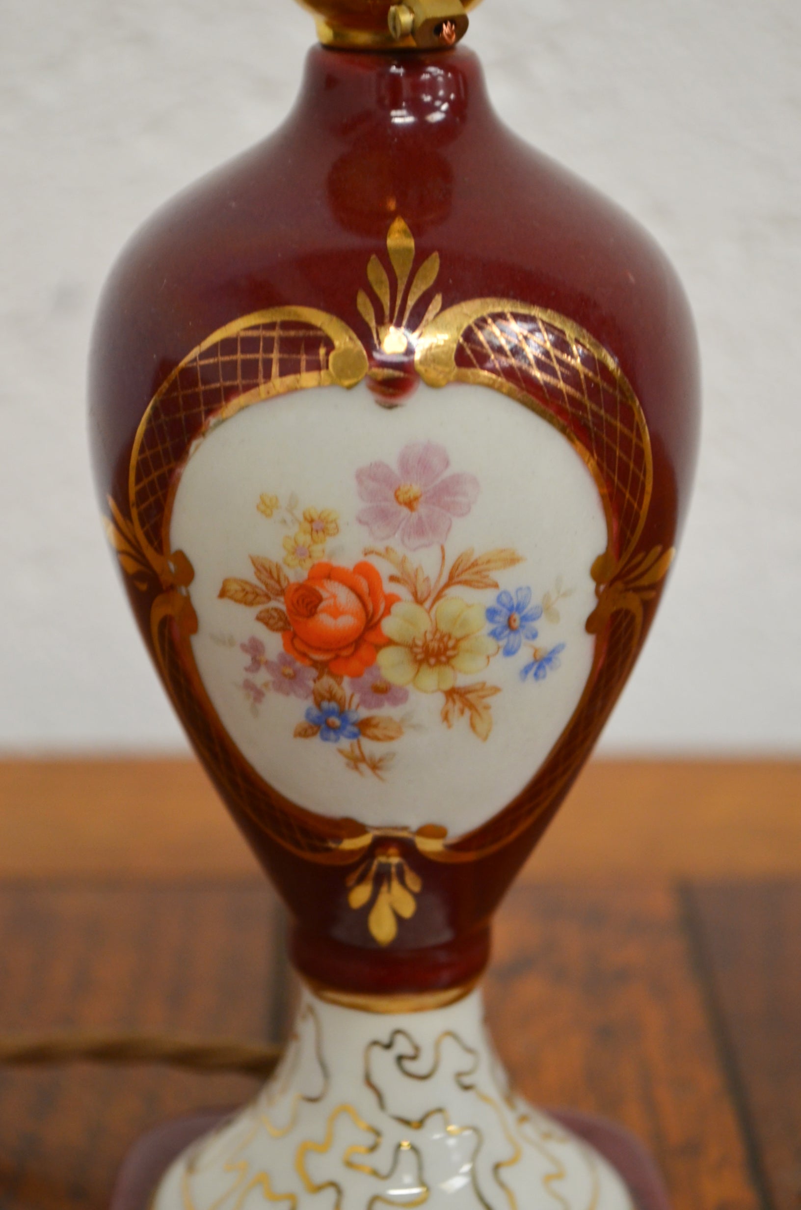A vintage ceramic table lamp made in Italy with floral decoration to the front and around the base.