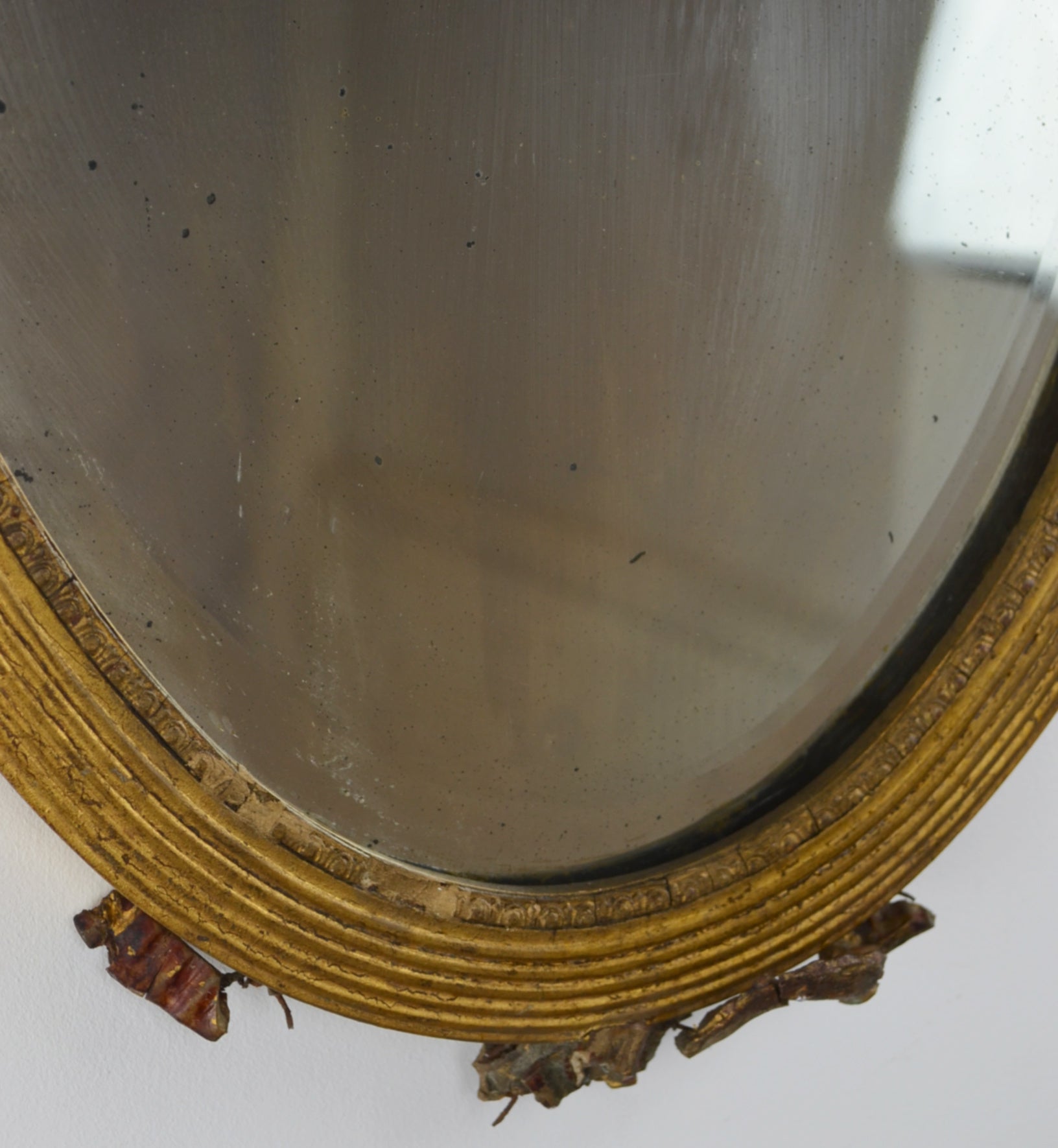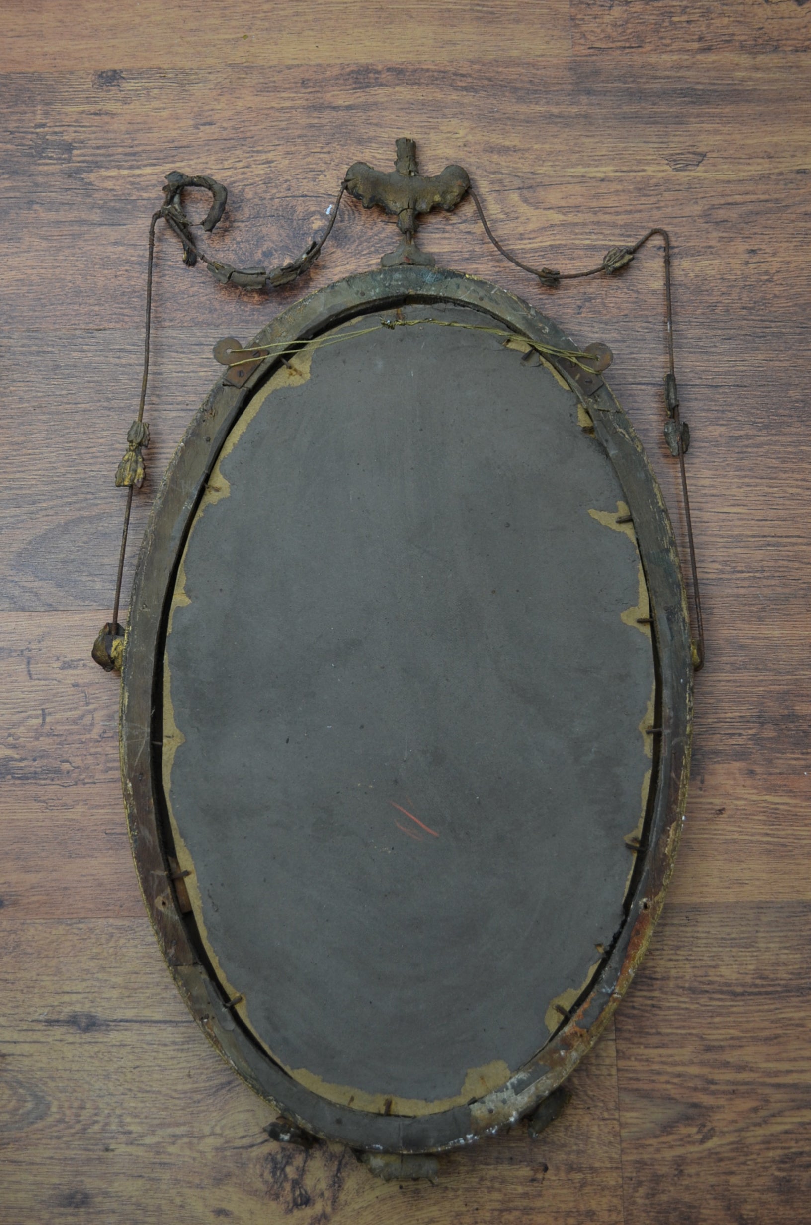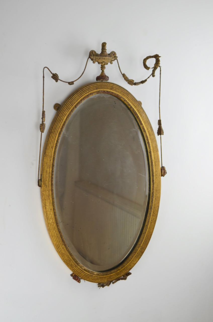 Oval early 20th century Adams revival mirror with good detailed frame, ornate urn capital decoration and some foxing to the bevelled mirror plate.