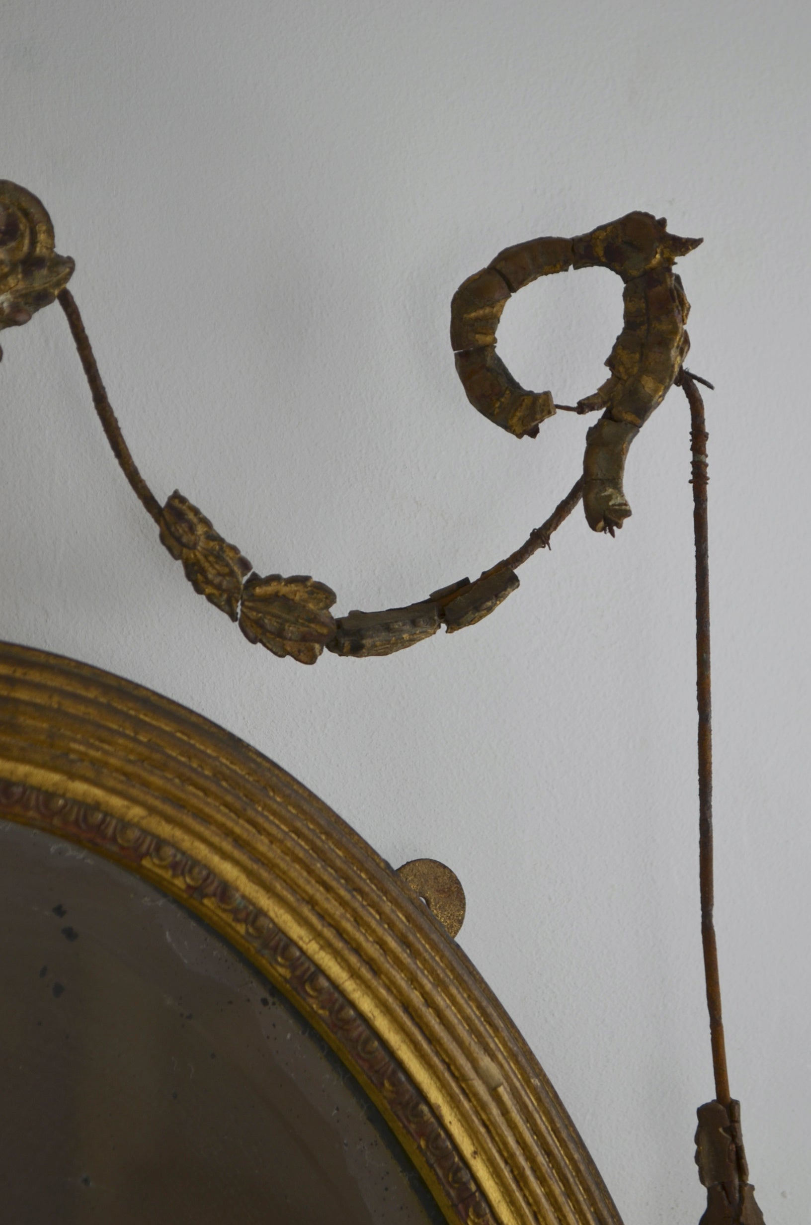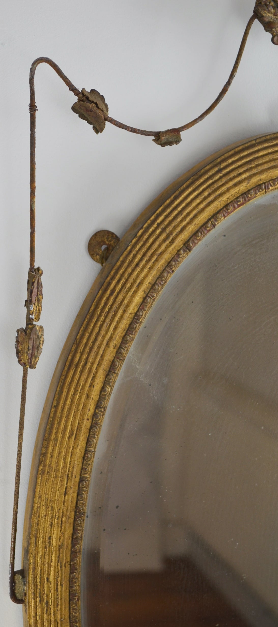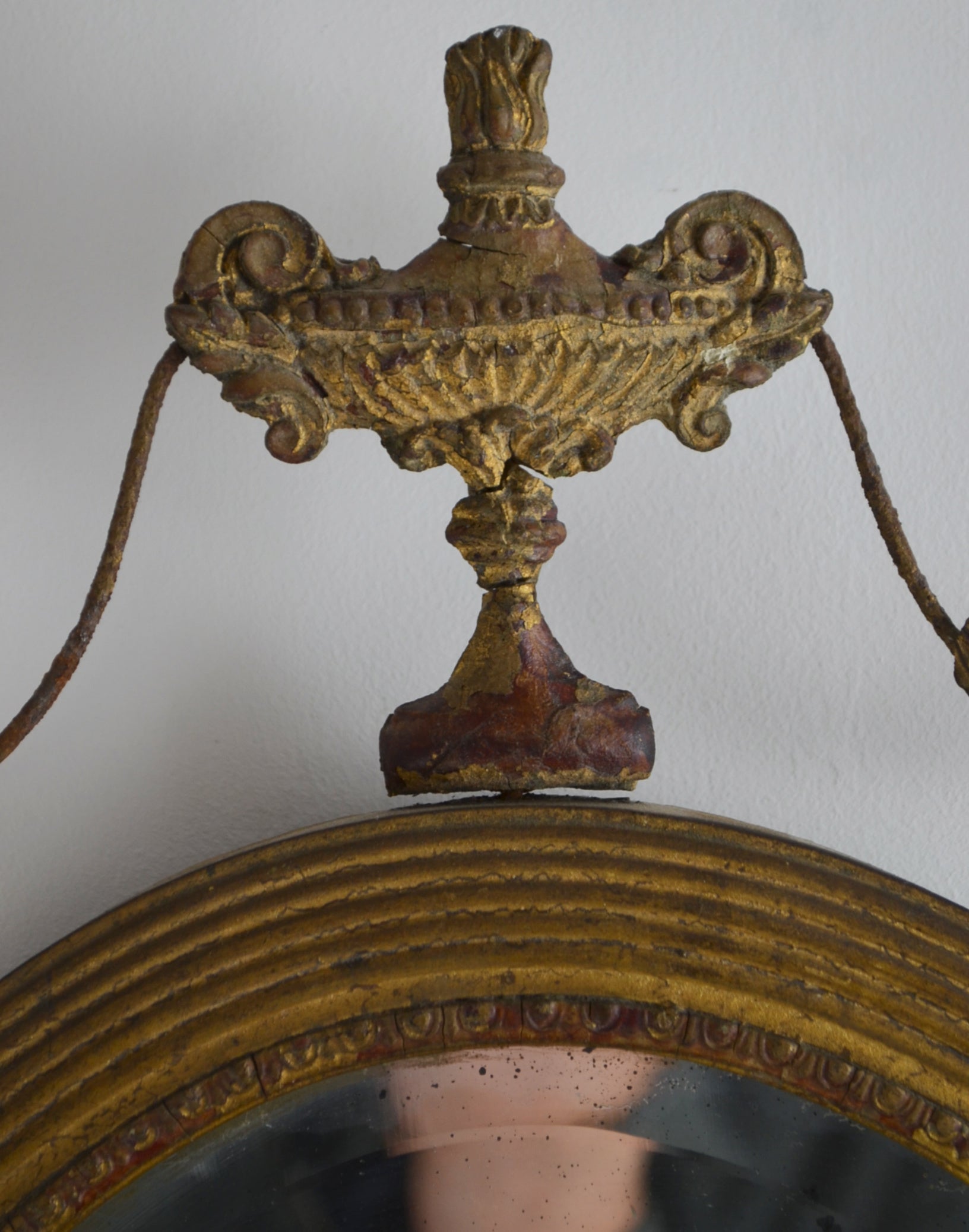 Oval early 20th century Adams revival mirror with good detailed frame, ornate urn capital decoration and some foxing to the bevelled mirror plate.