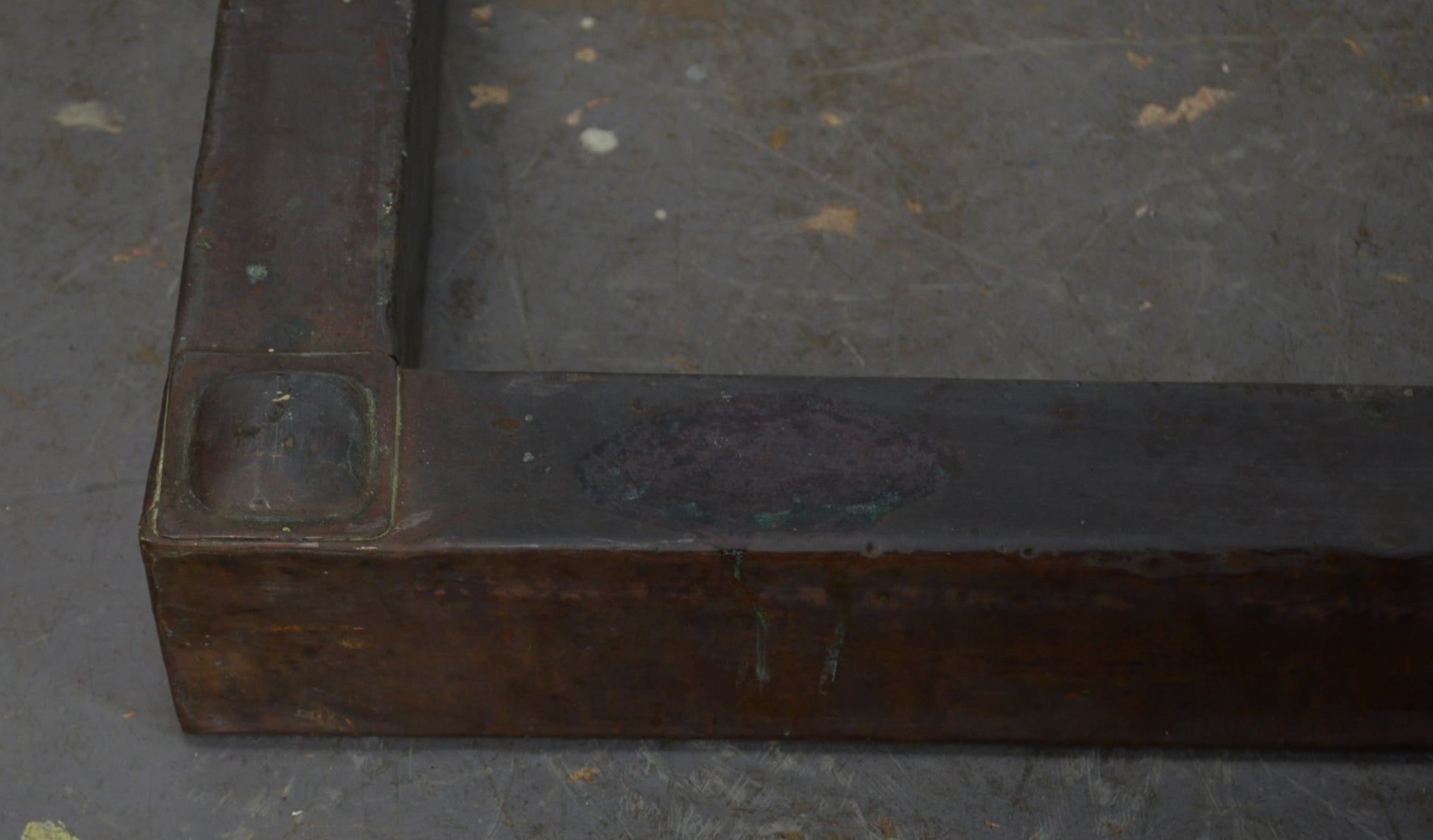 An likely early 20th century Arts & Crafts copper curb/fire fender. Large early 20th Century fire curb, clad in hammered copper with embossed motif to the corner and strapped..