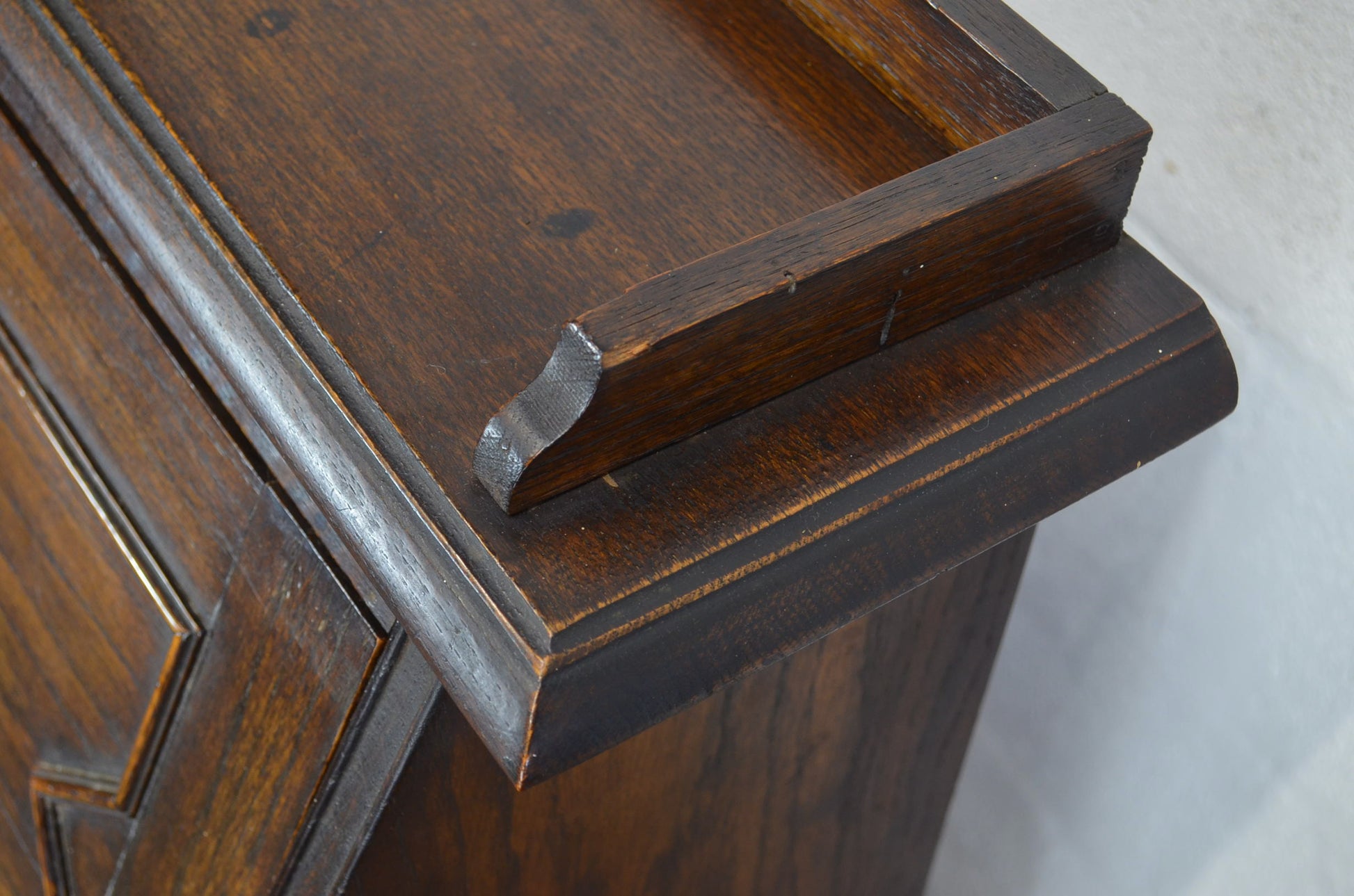 An early 20th century oak student's bureau writing table. Sloped face with gallery surround, with book shelves to lower, raised on trestle legs. Provenance: A sticker on the back states this bureau was originally sold to a Miss S Hulke of the historically prestigious Argyll Mansions Kings Road Chelsea.