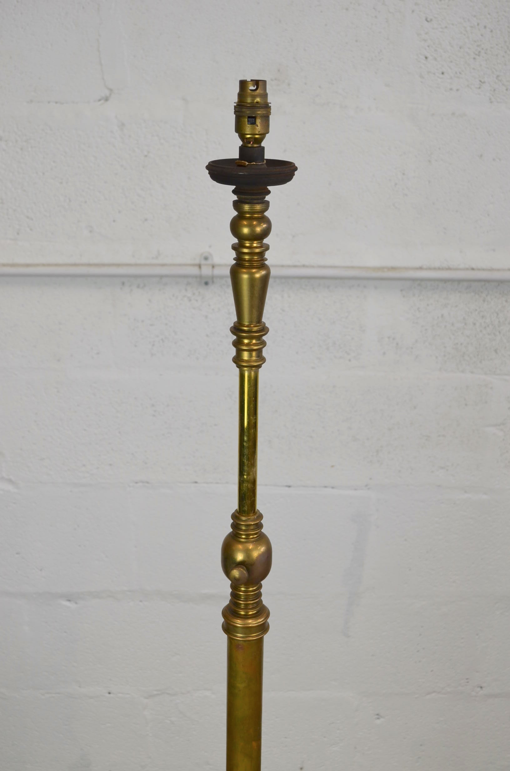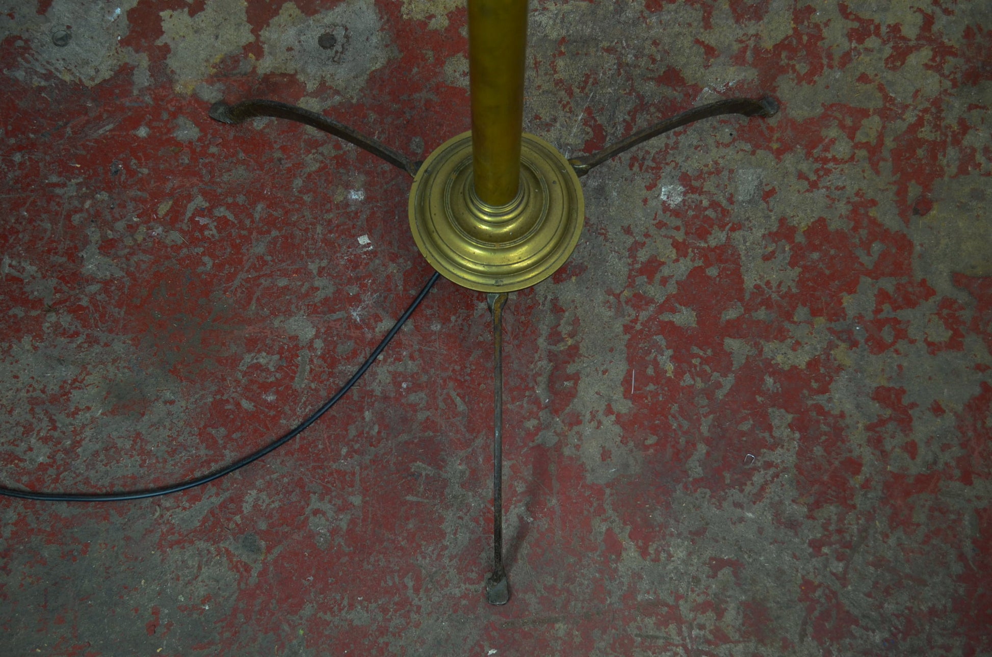 An Edwardian brass and wrought iron telescopic standard lamp light. The lamp having a single extending brass column raised on a circular foot upon a splayed wrought iron tripod base.