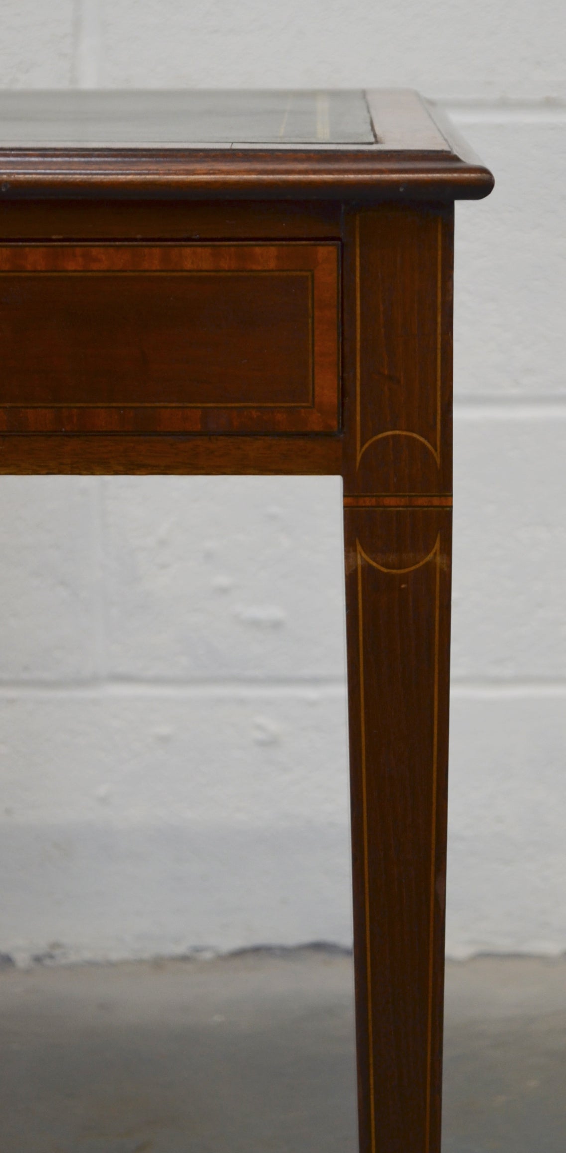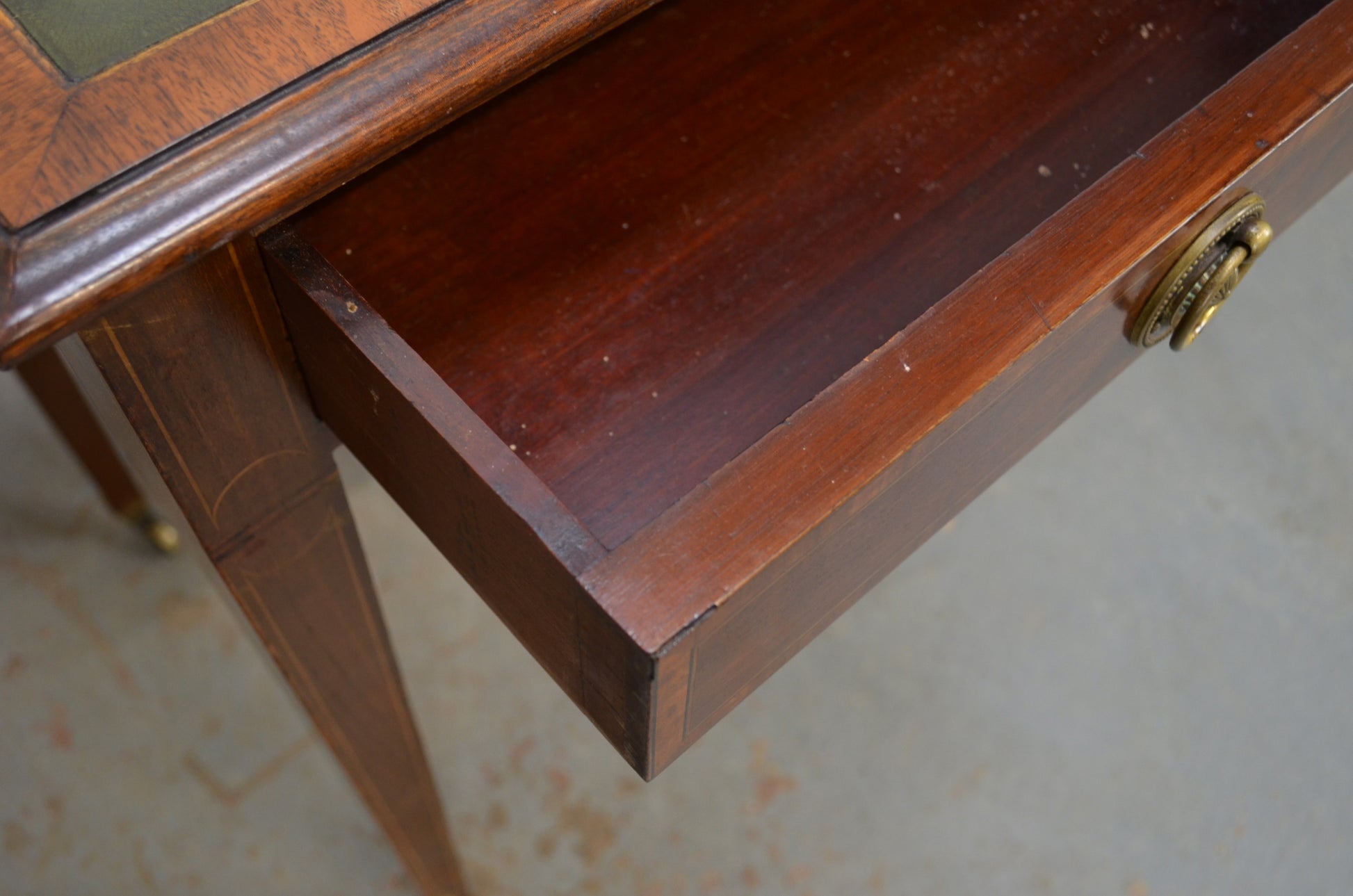 An Edwardian mahogany writing table / side table with lovely inlaid detail. Two drawers, on square legs with a good leather top and original casters.