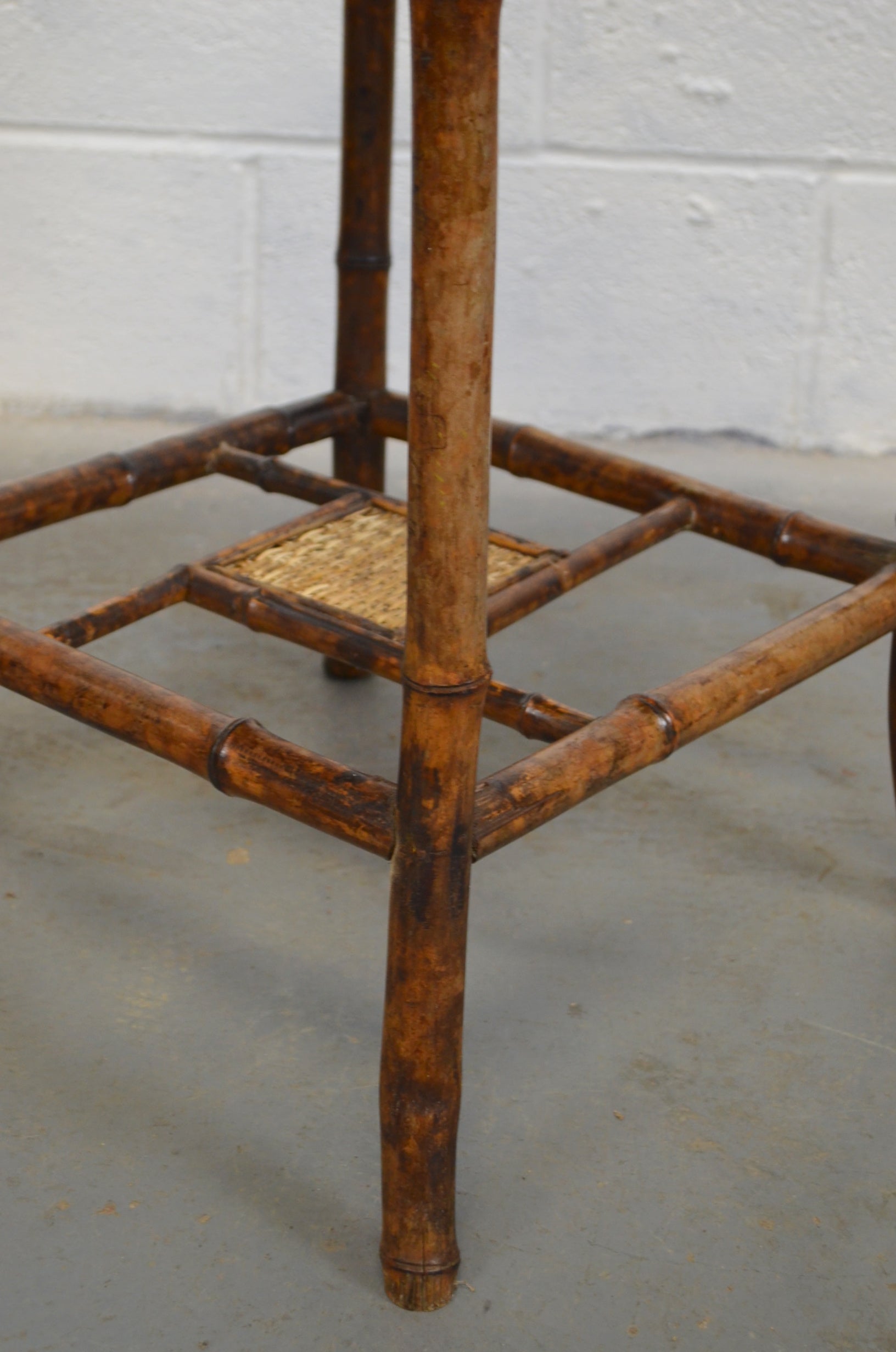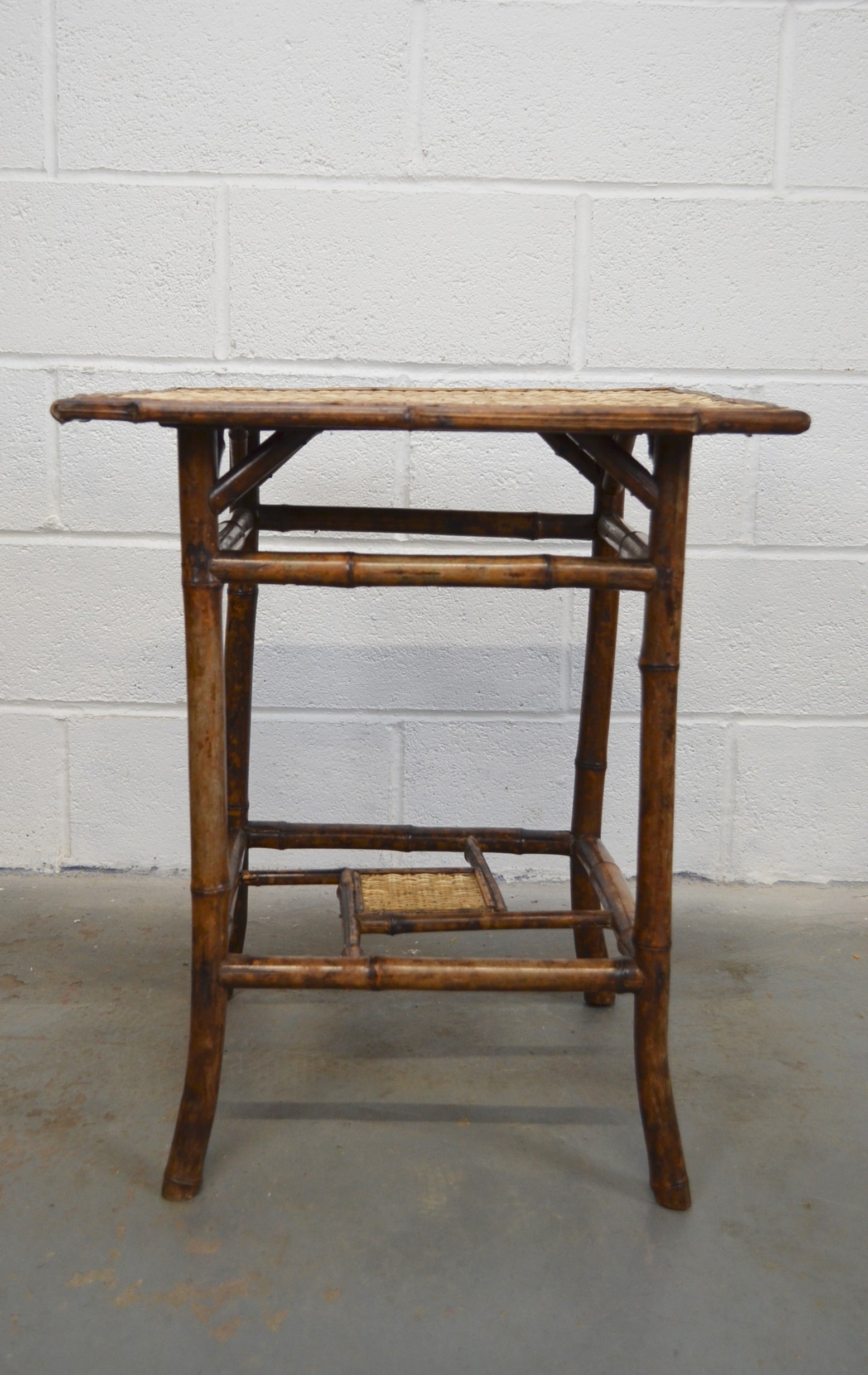 A Victorian Aesthetic Movement late 19th century bamboo side occasional low table. The table having a squared top over a geometrically arranged undertier and peripheral stretchers. Splayed bamboo legs. These tables were usually made in London with materials imported from Japan.