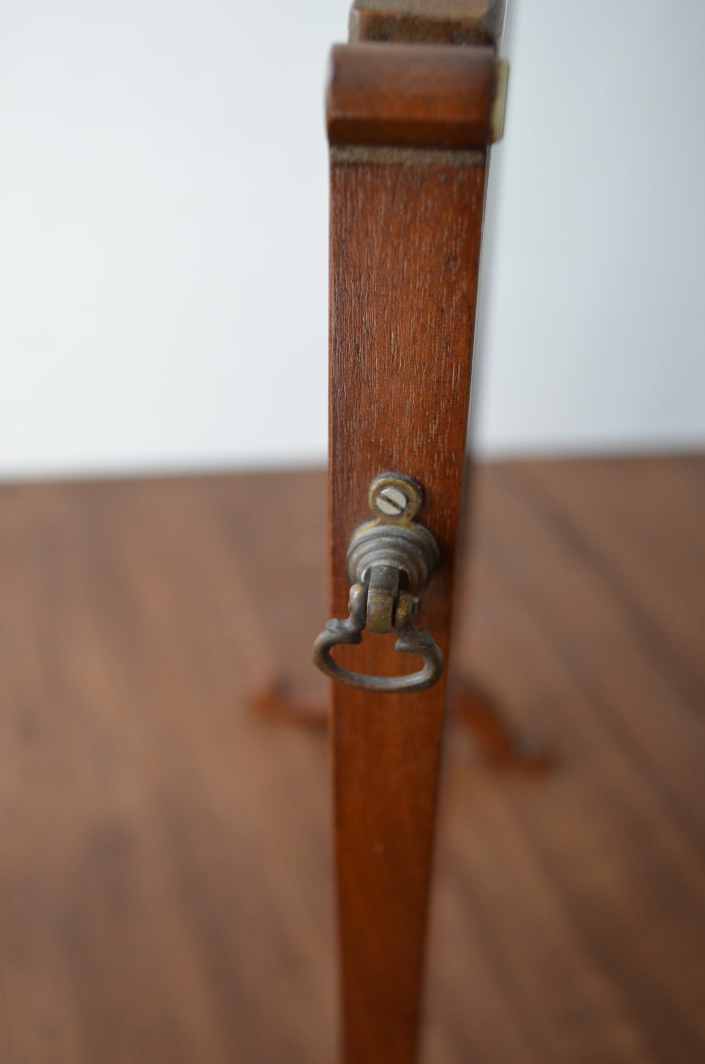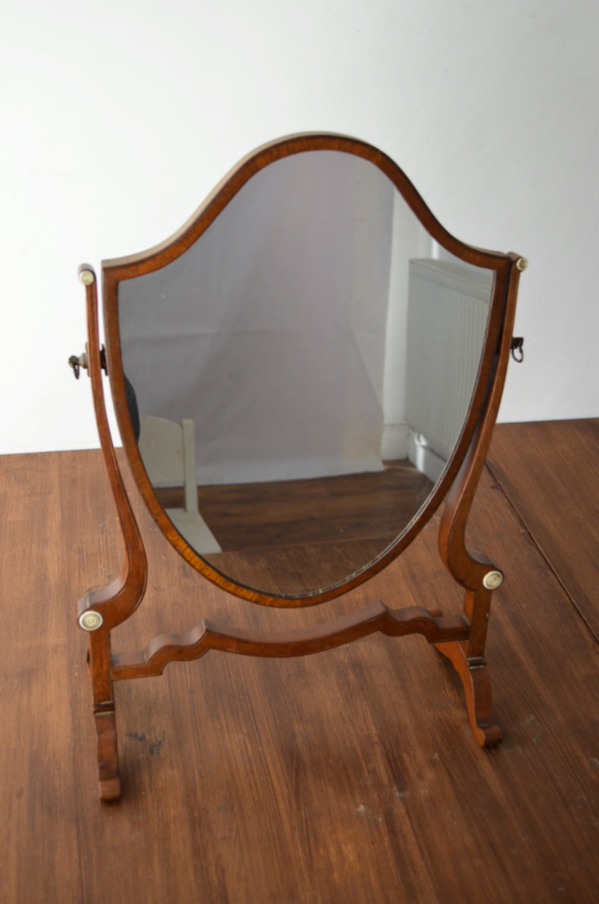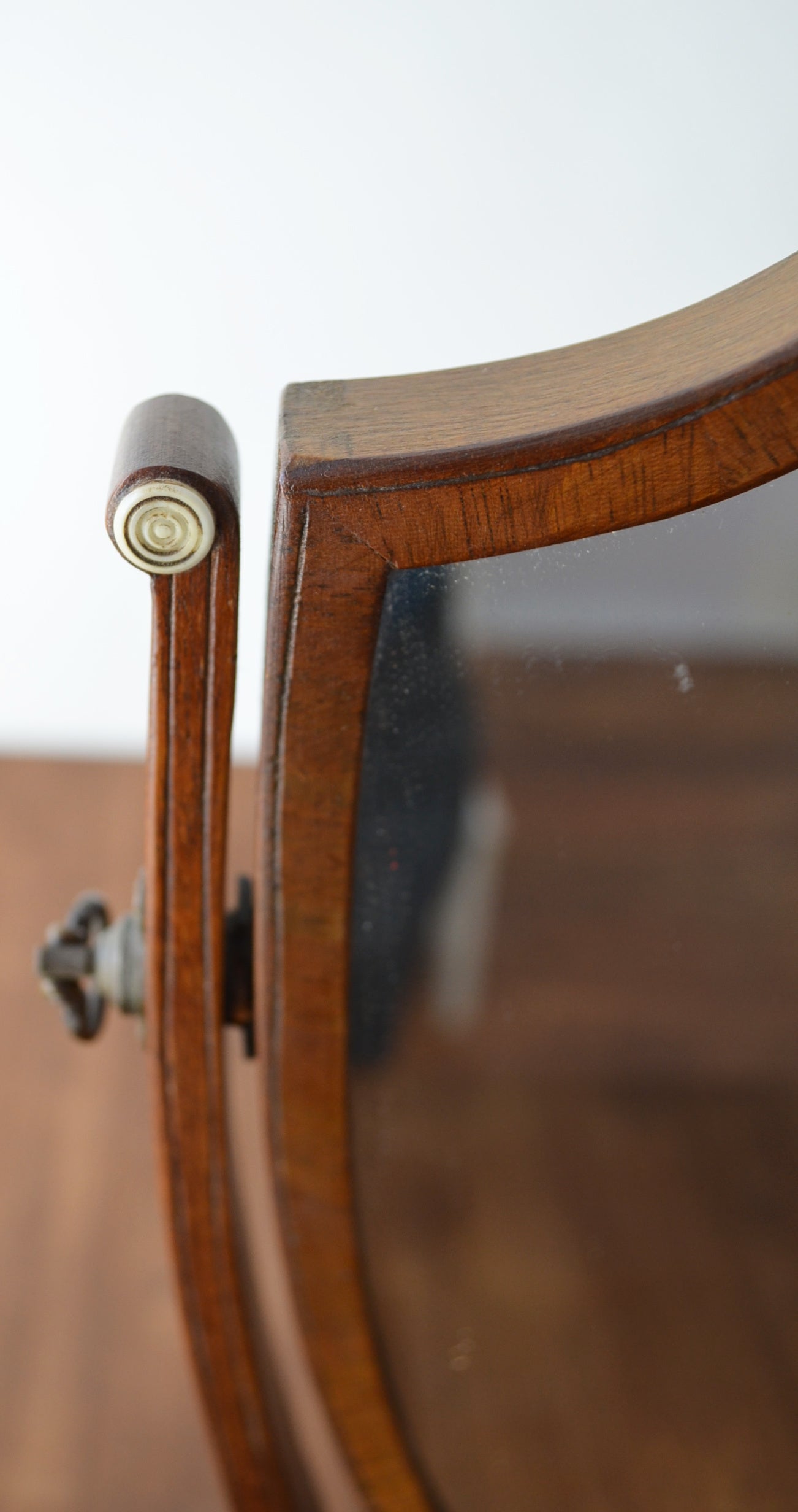 A Georgian mahogany frame shield-shape swing dressing table/toilet glass, inset ivory roundels, on scroll-shaped end supports.