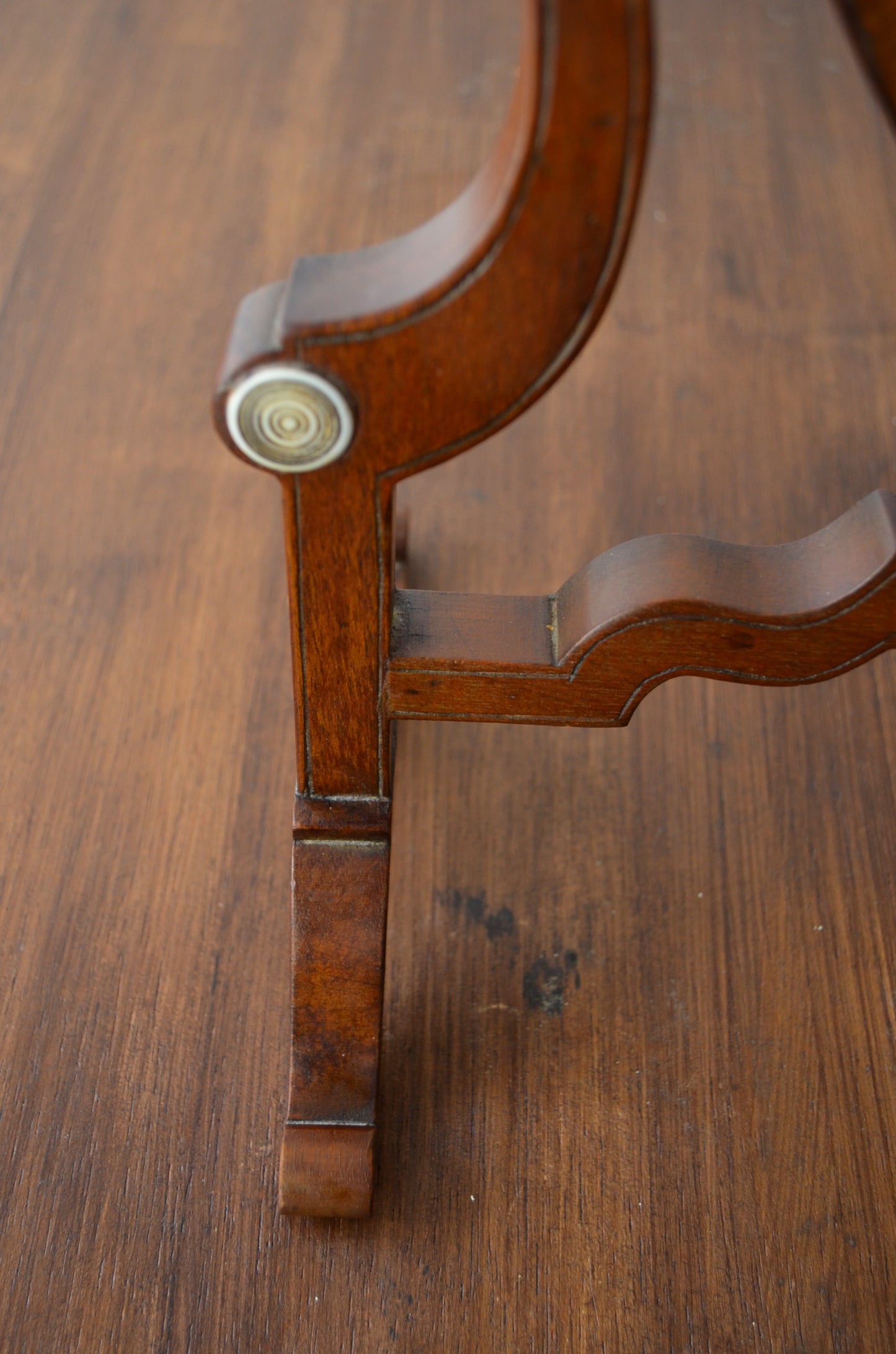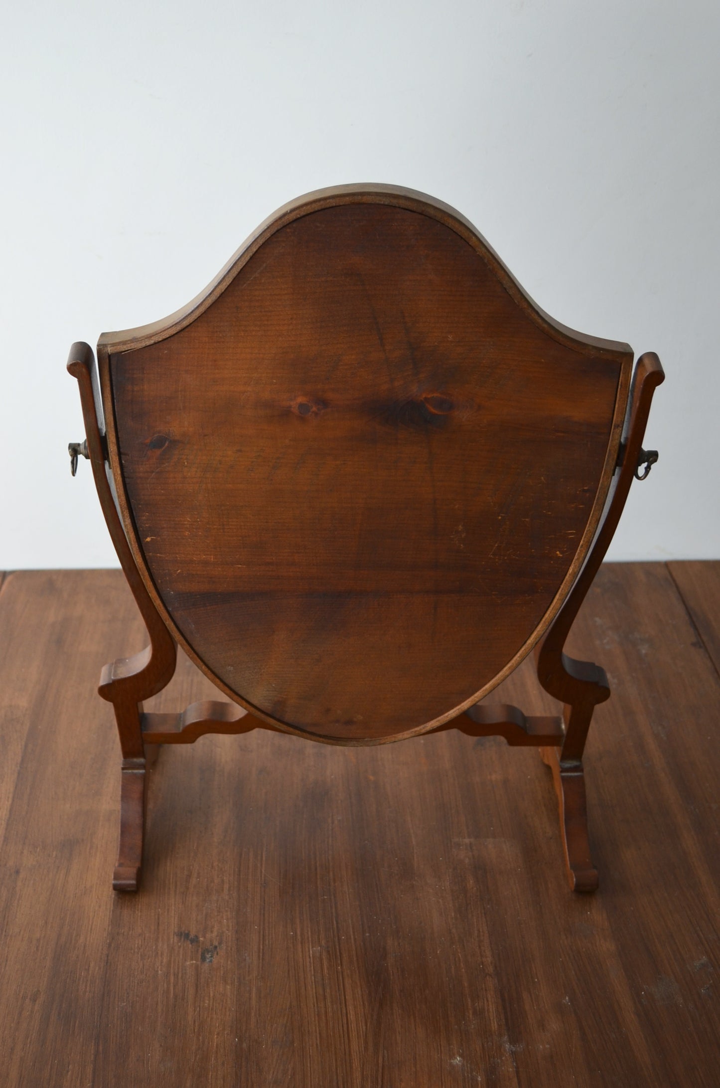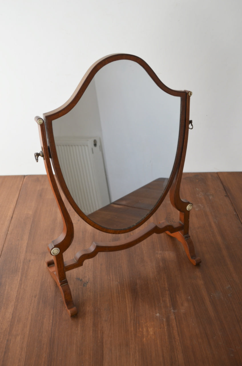 A Georgian mahogany frame shield-shape swing dressing table/toilet glass, inset ivory roundels, on scroll-shaped end supports.