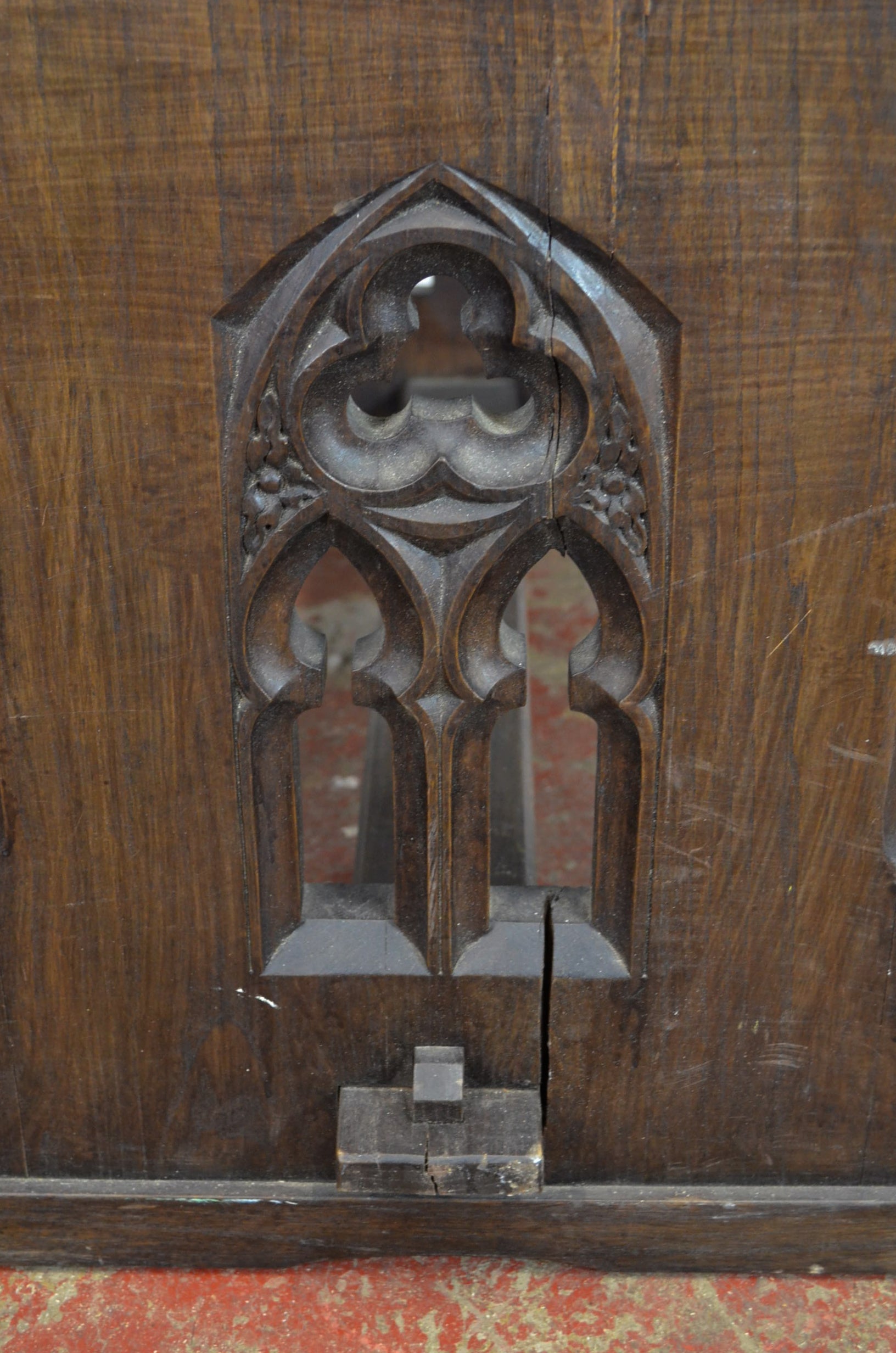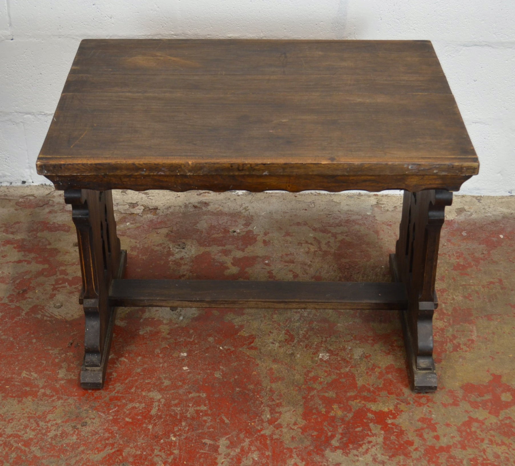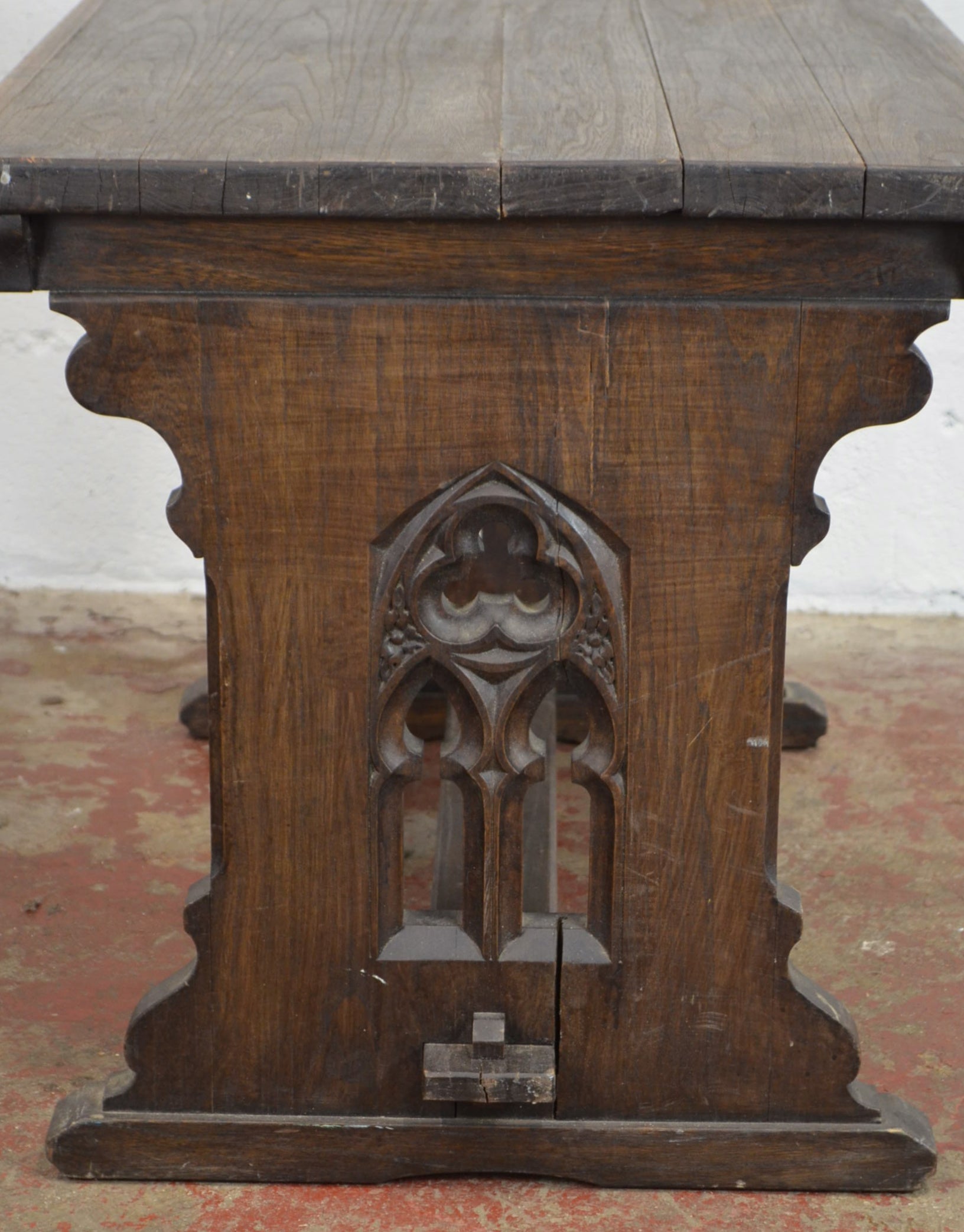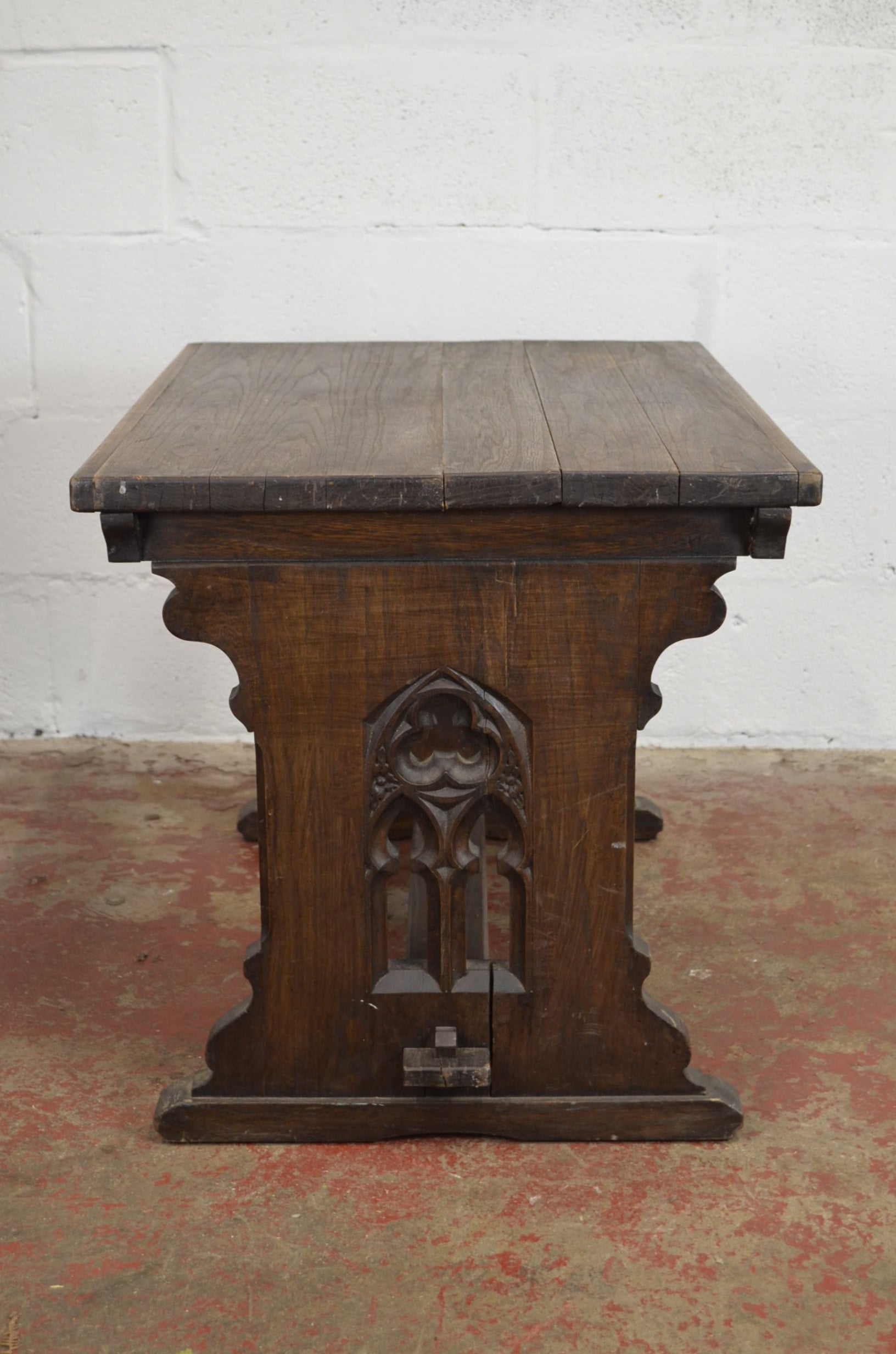 An antique carved refectory occasional/side table in a gothic revival. Possibly an ecclesiastical salvage it came to me via a prop house so will have been used in stager and screen performances.