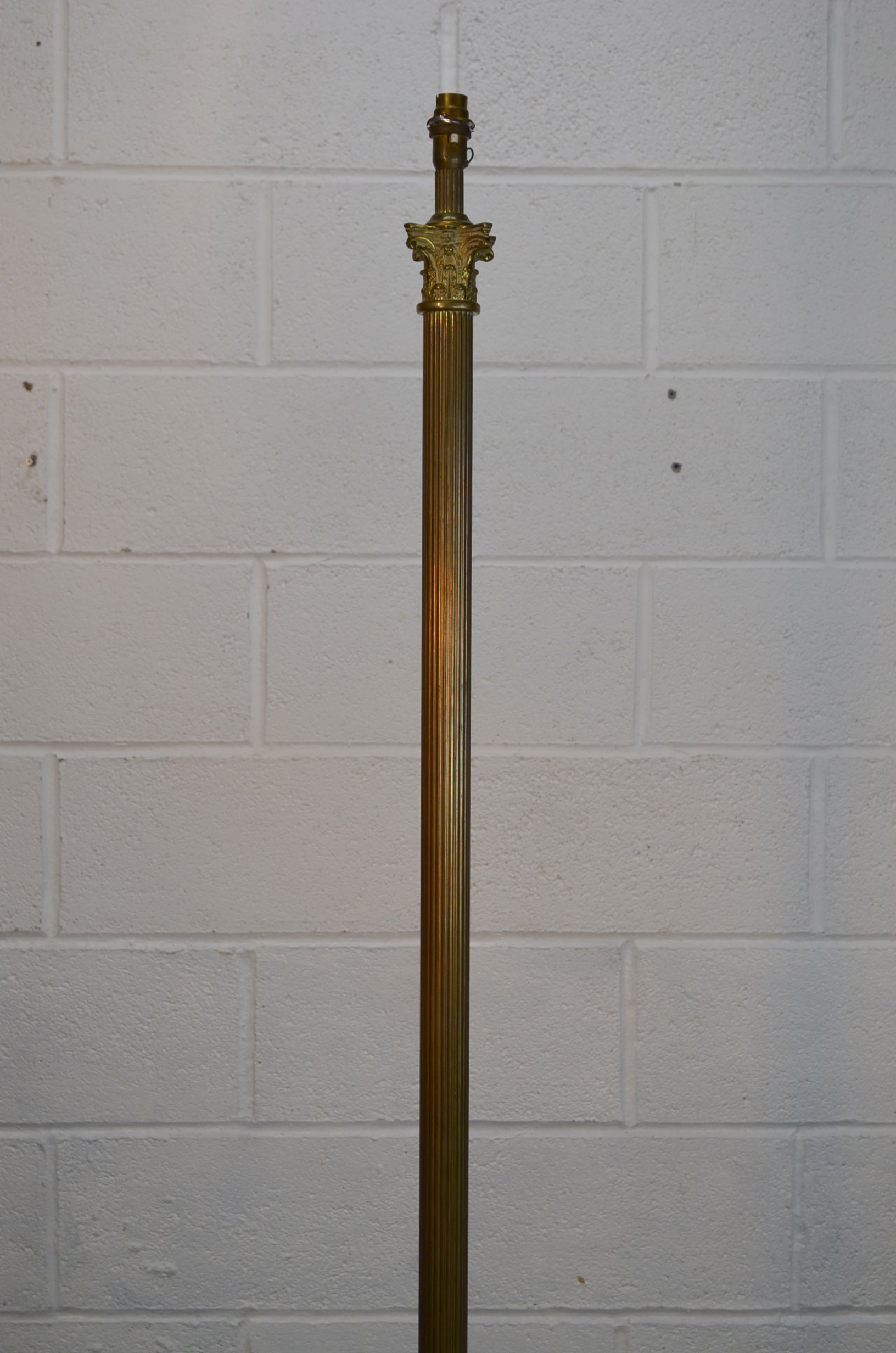 A late 19th century style vintage 20th century brass standard lamp having Corinthian capital to the top, fluted central column raised on a stepped marble/composite stone base with paw feet.