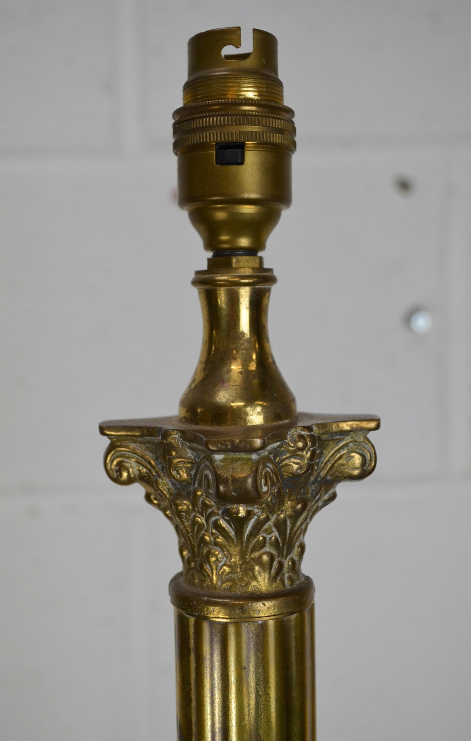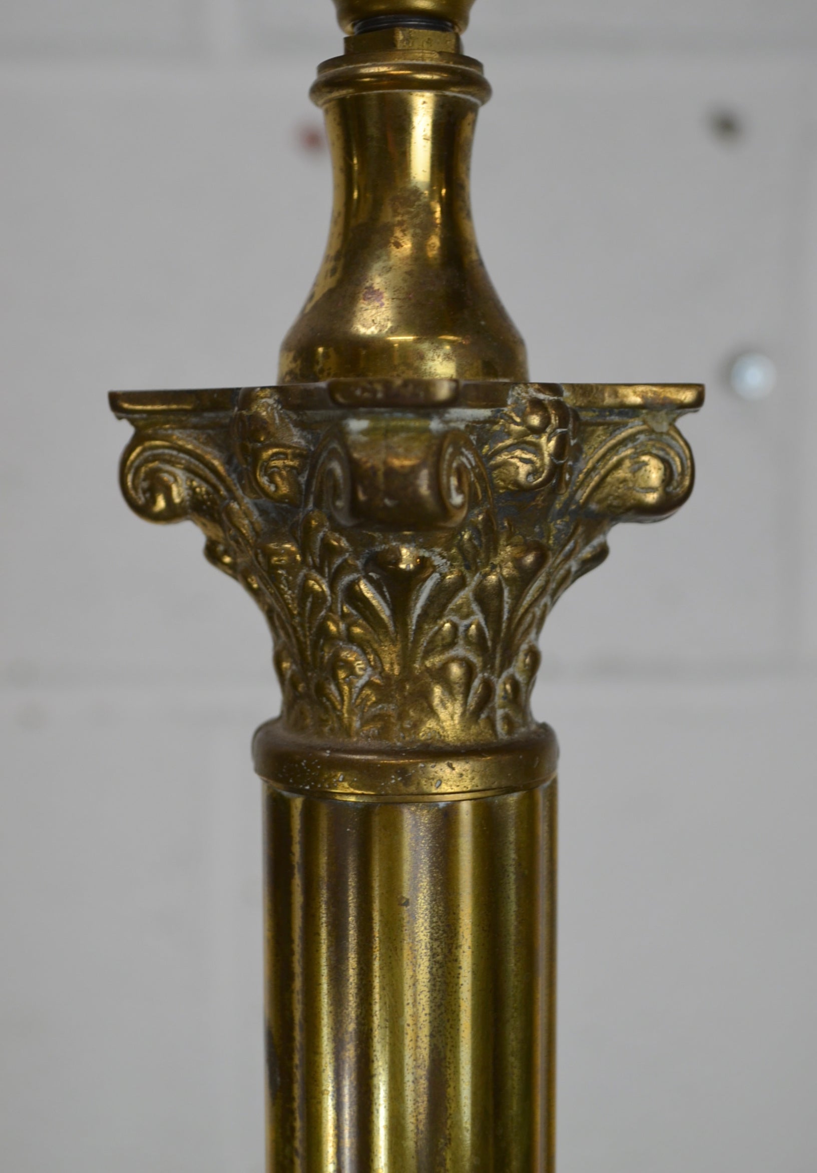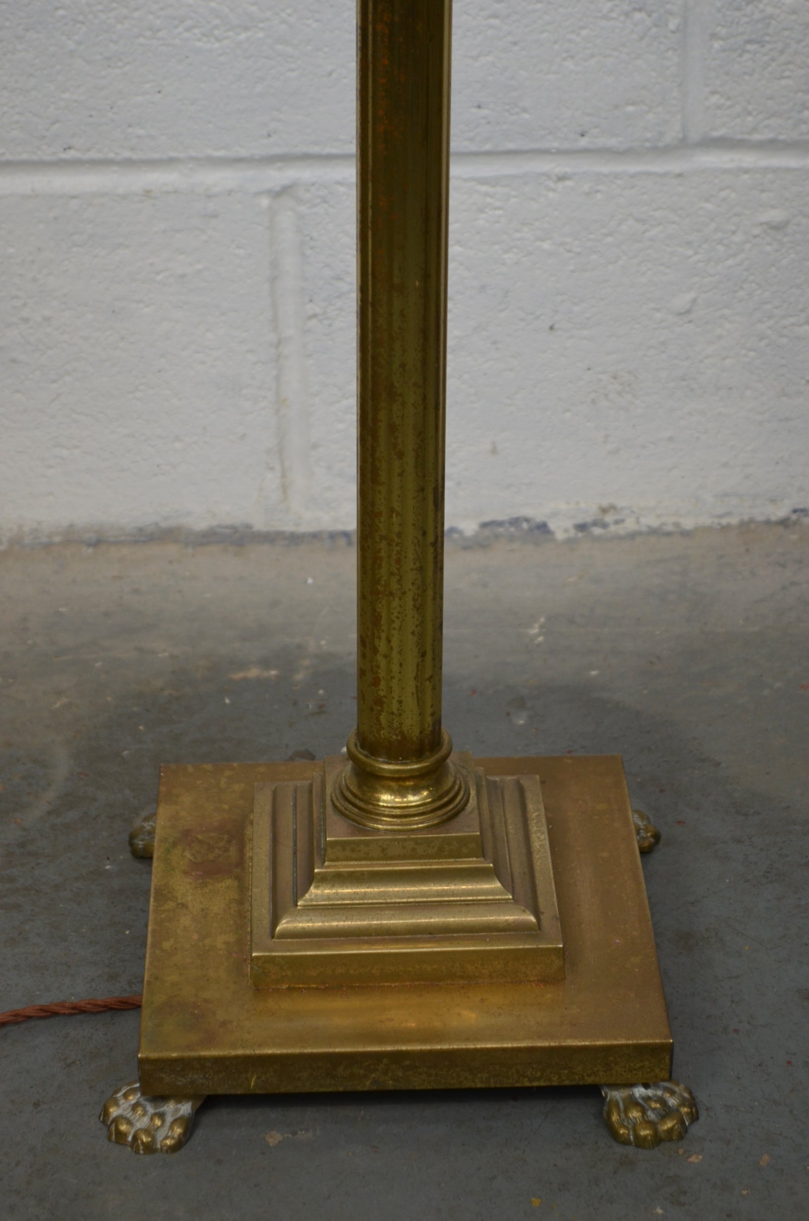A late 19th century style vintage 20th century brass standard lamp having Corinthian capital to the top, fluted central column raised on a stepped base with paw feet.