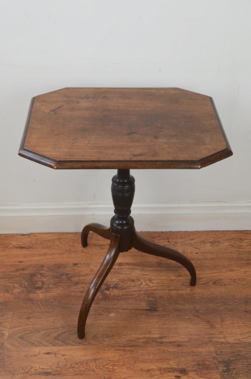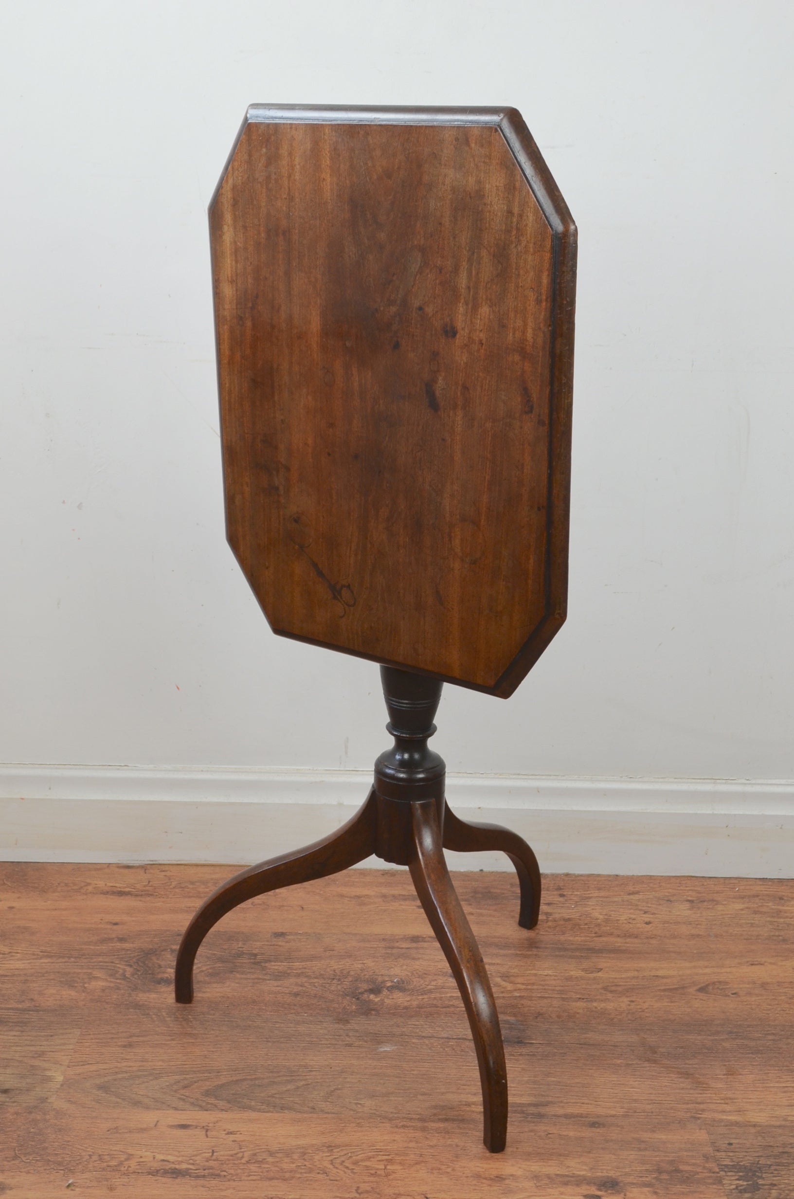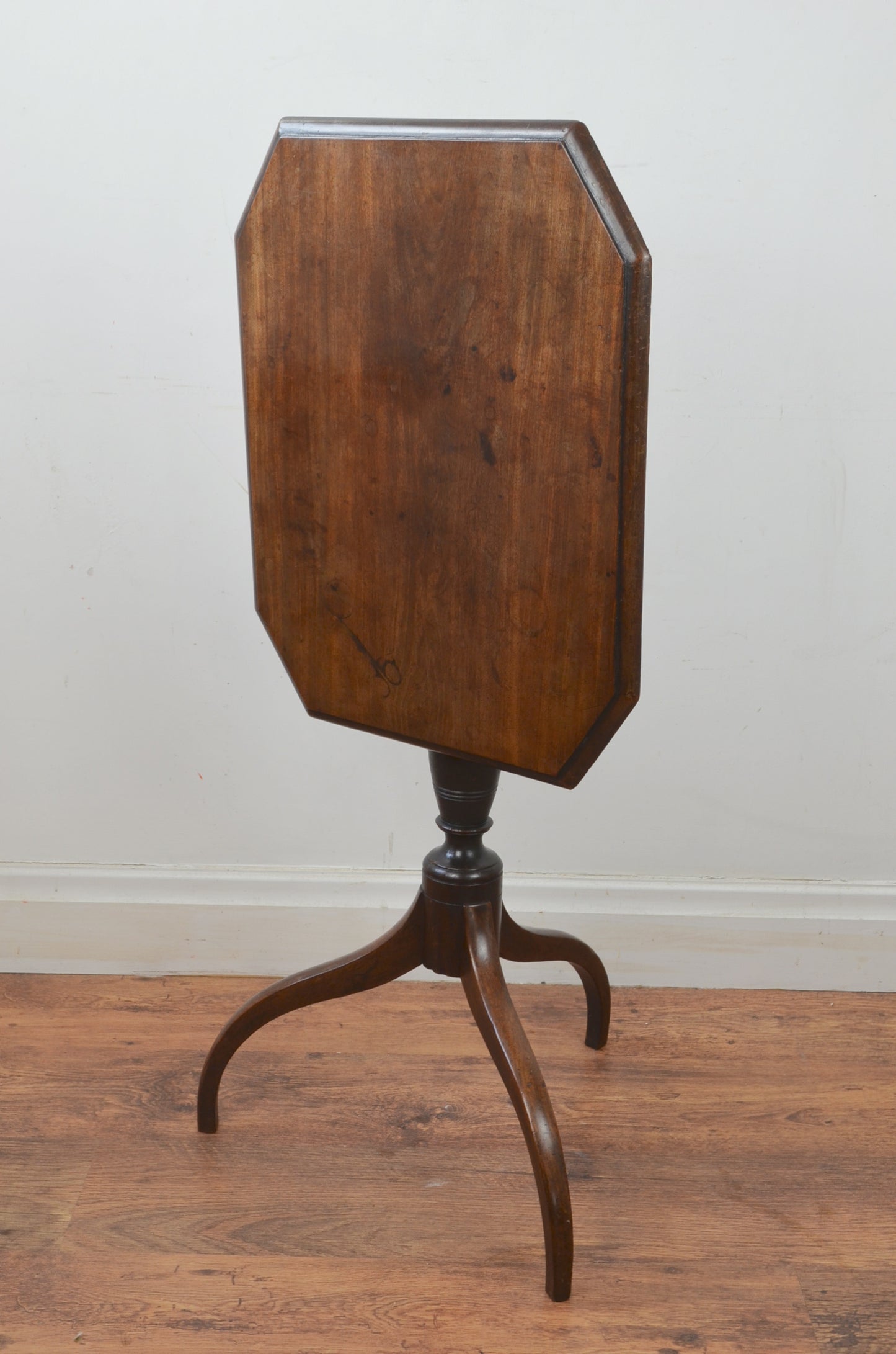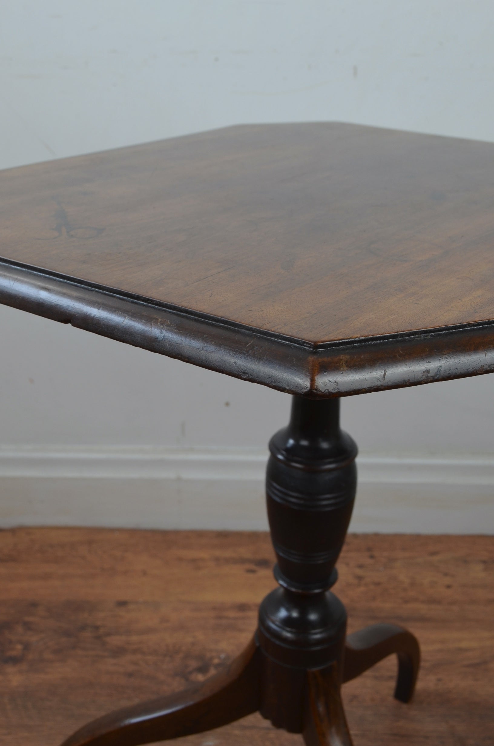 An 18th century George III mahogany tilt top tripod table. Raised on slender shaped legs with turned column having bulbous centre. The rectangular table top with canted corners and chamfered edge detailing.