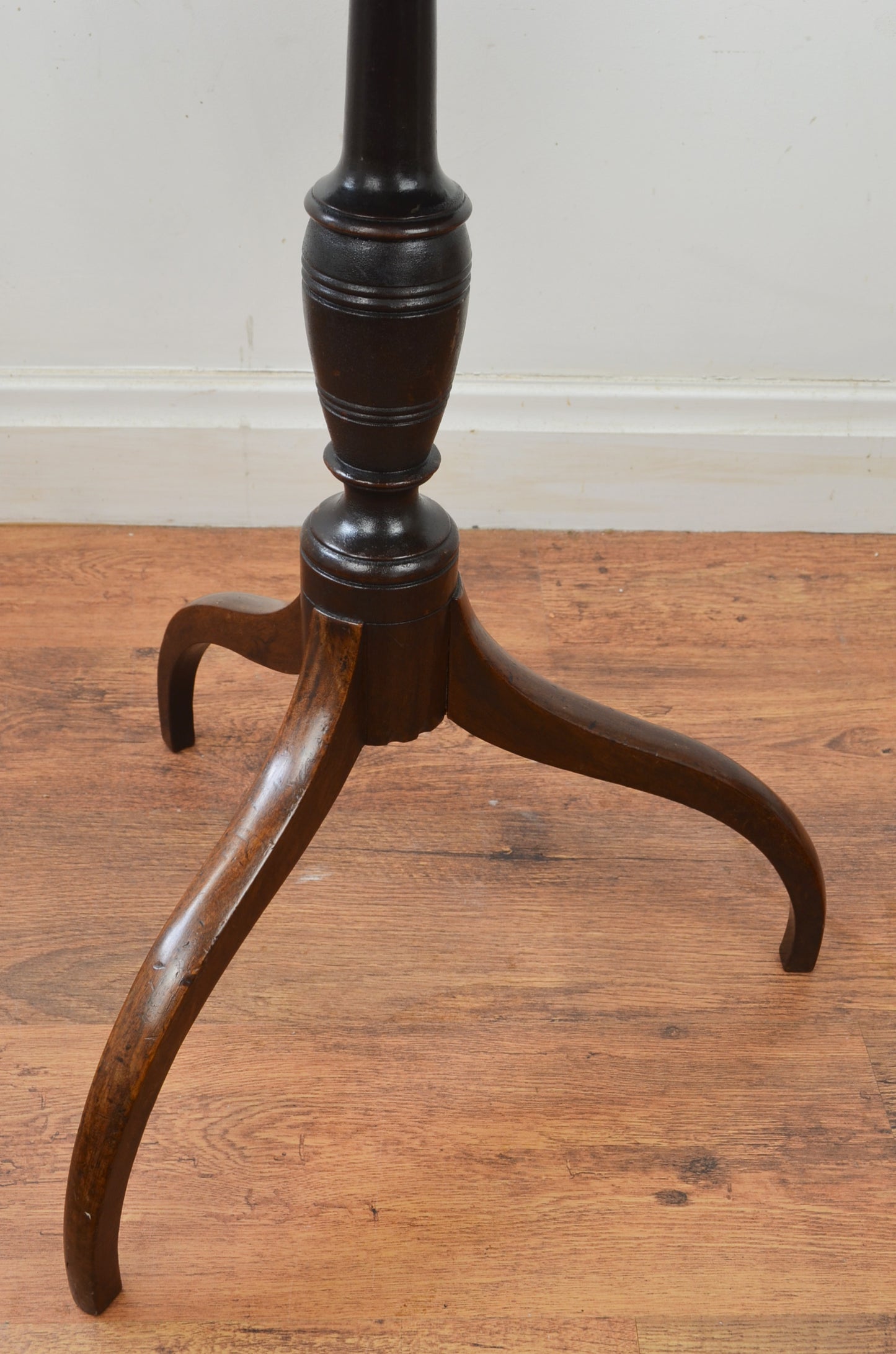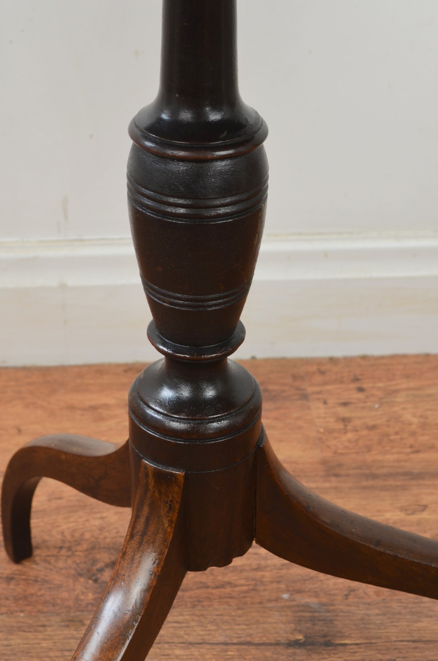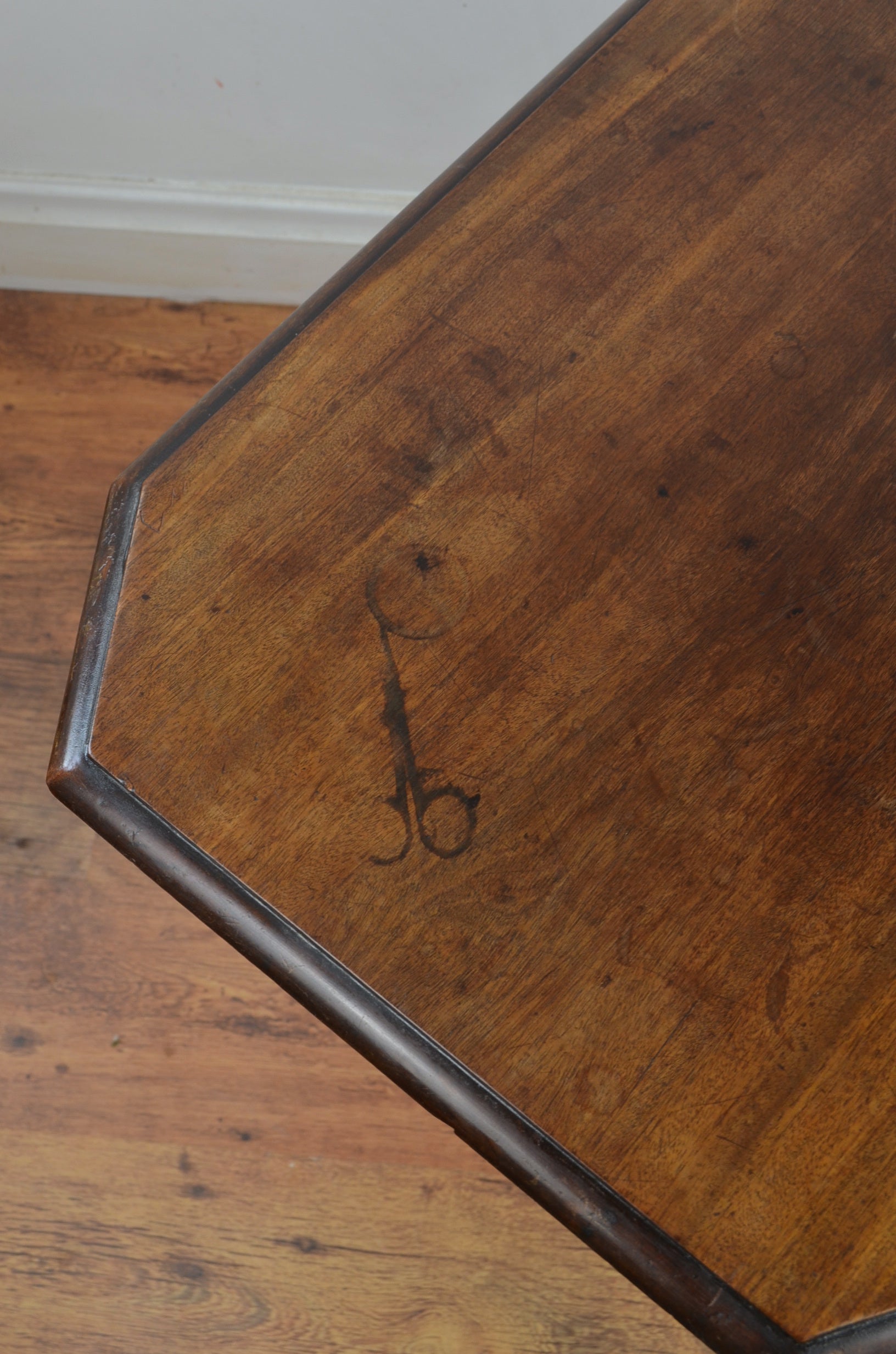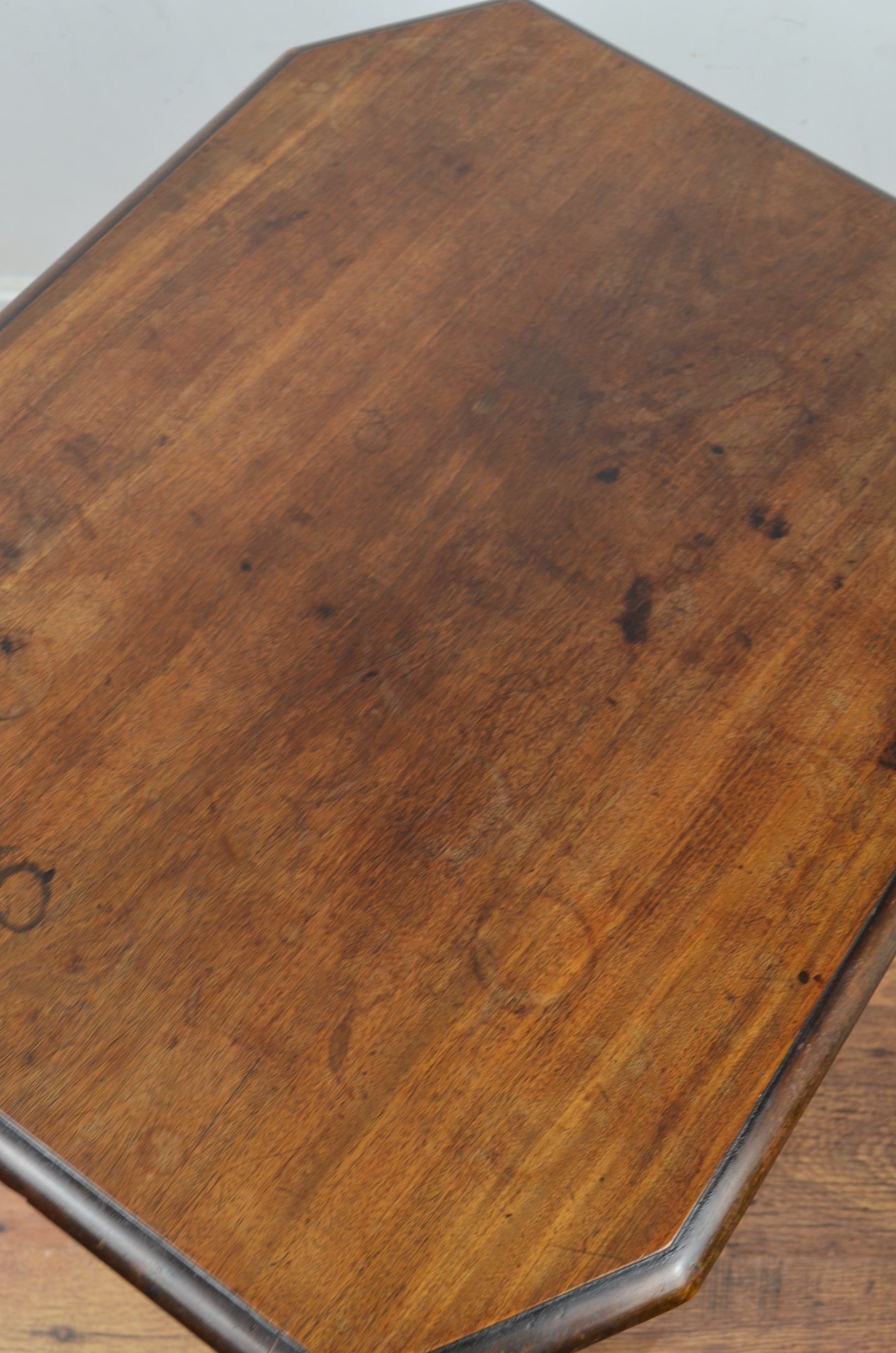 An 18th century George III mahogany tilt top tripod table. Raised on slender shaped legs with turned column having bulbous centre. The rectangular table top with canted corners and chamfered edge detailing.
