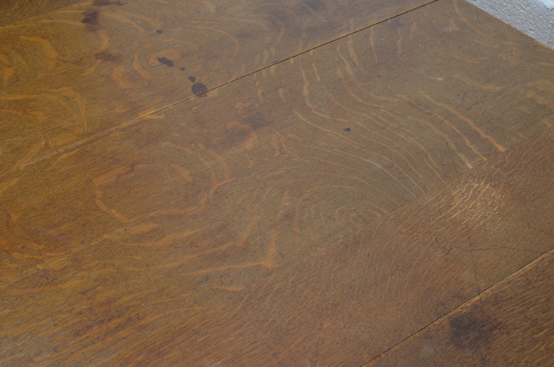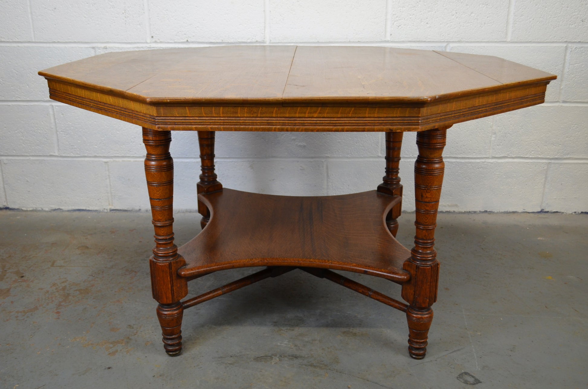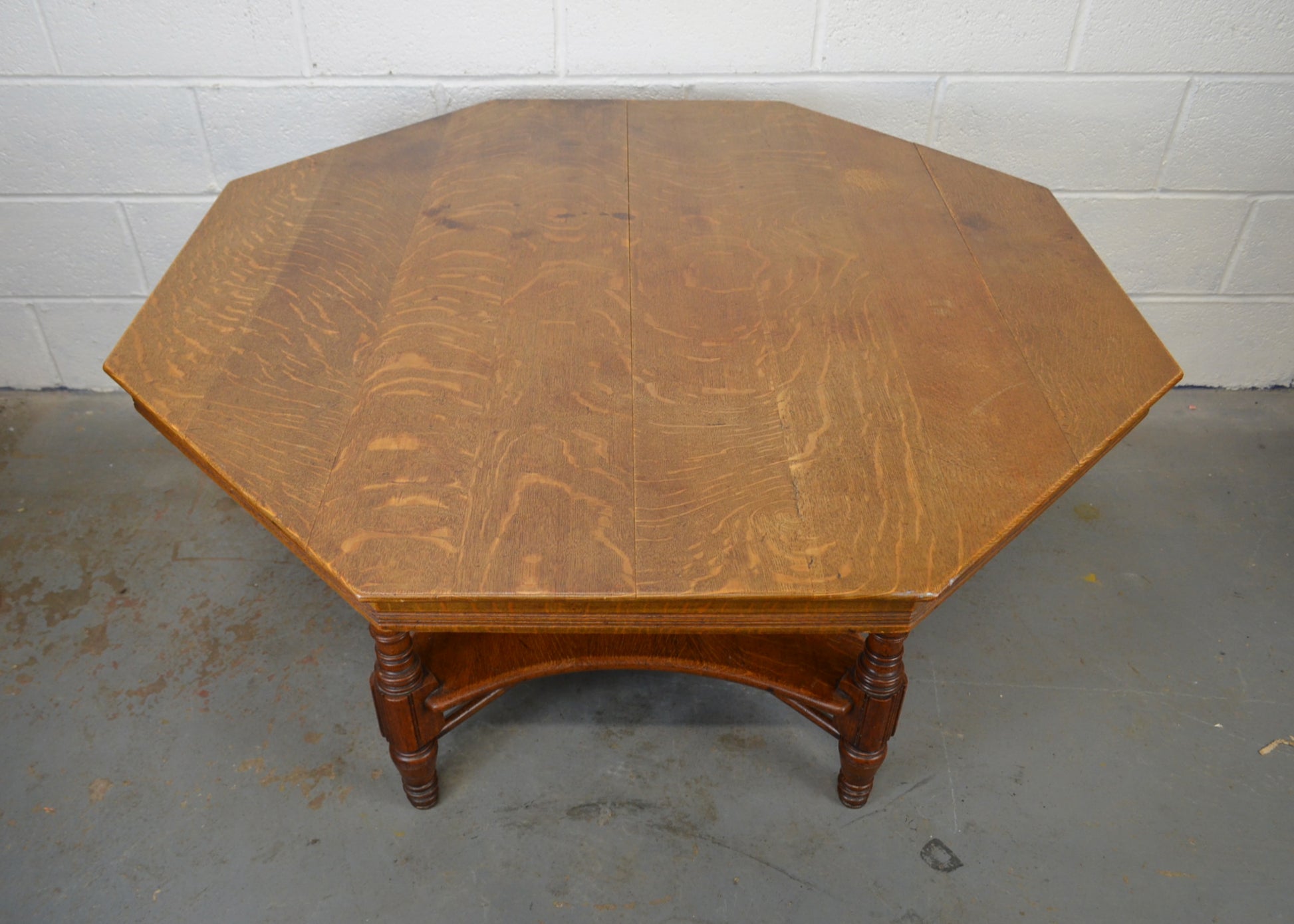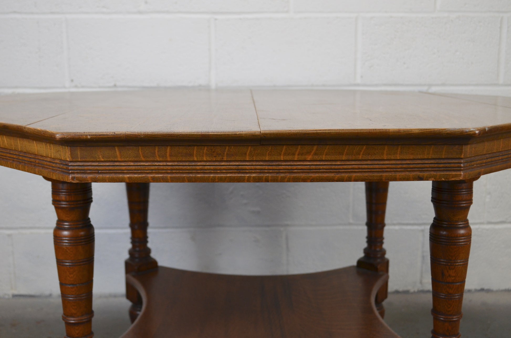 Antique oak octagonal arts and crafts dining table. The intricate turned legs and sturdy platform stretcher showcase quality craftsmanship.