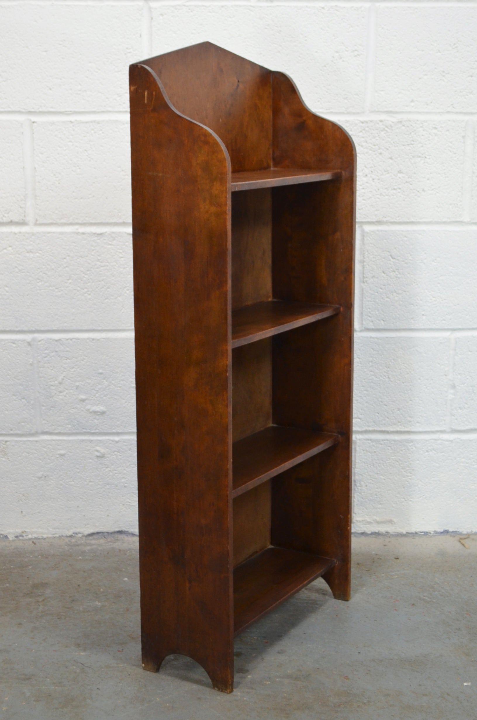 An early 20th century Arts and Crafts style open window bookcases. With oak construction raised on stile legs, having a series of shelves to front and peaked back.
