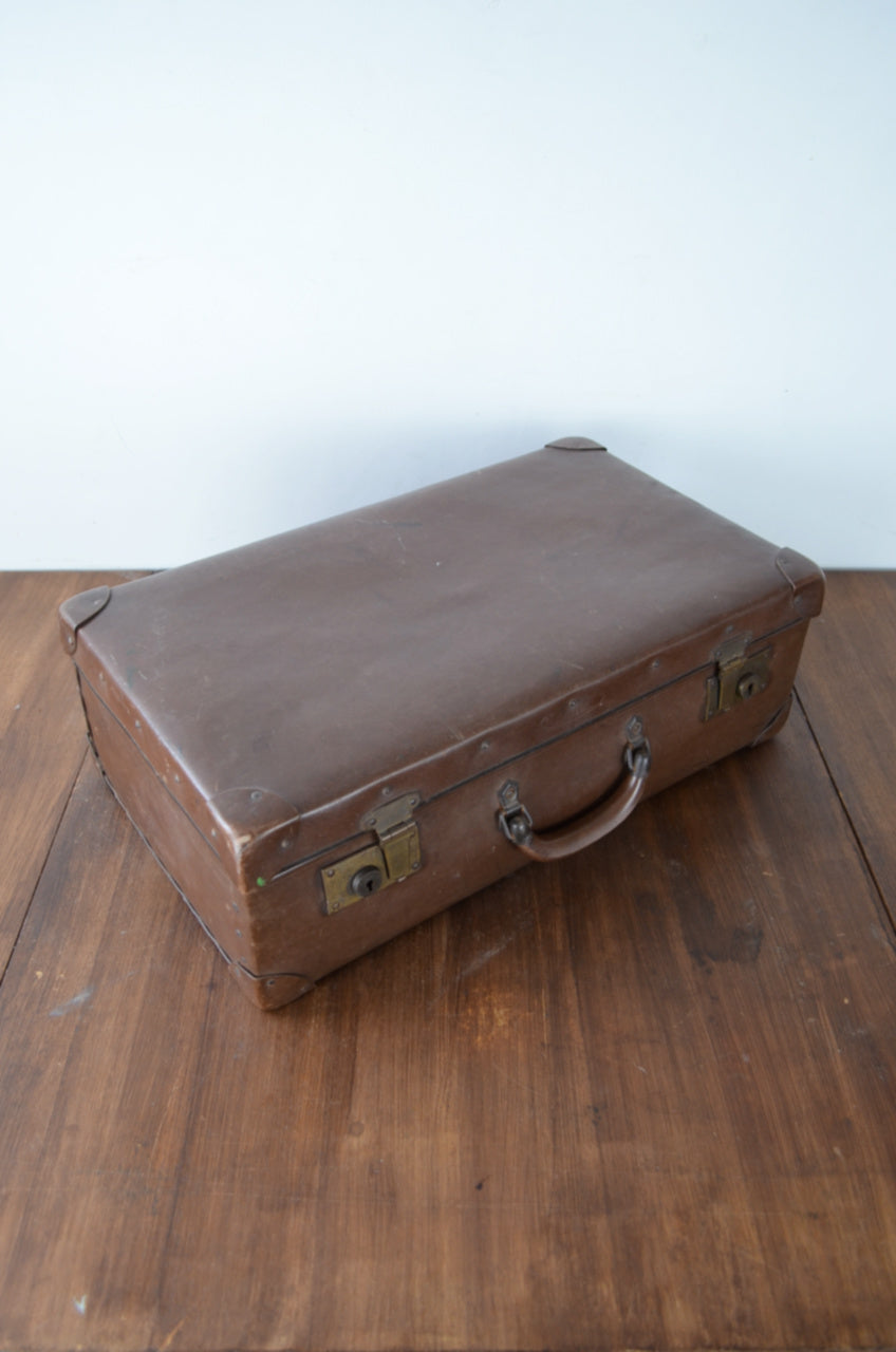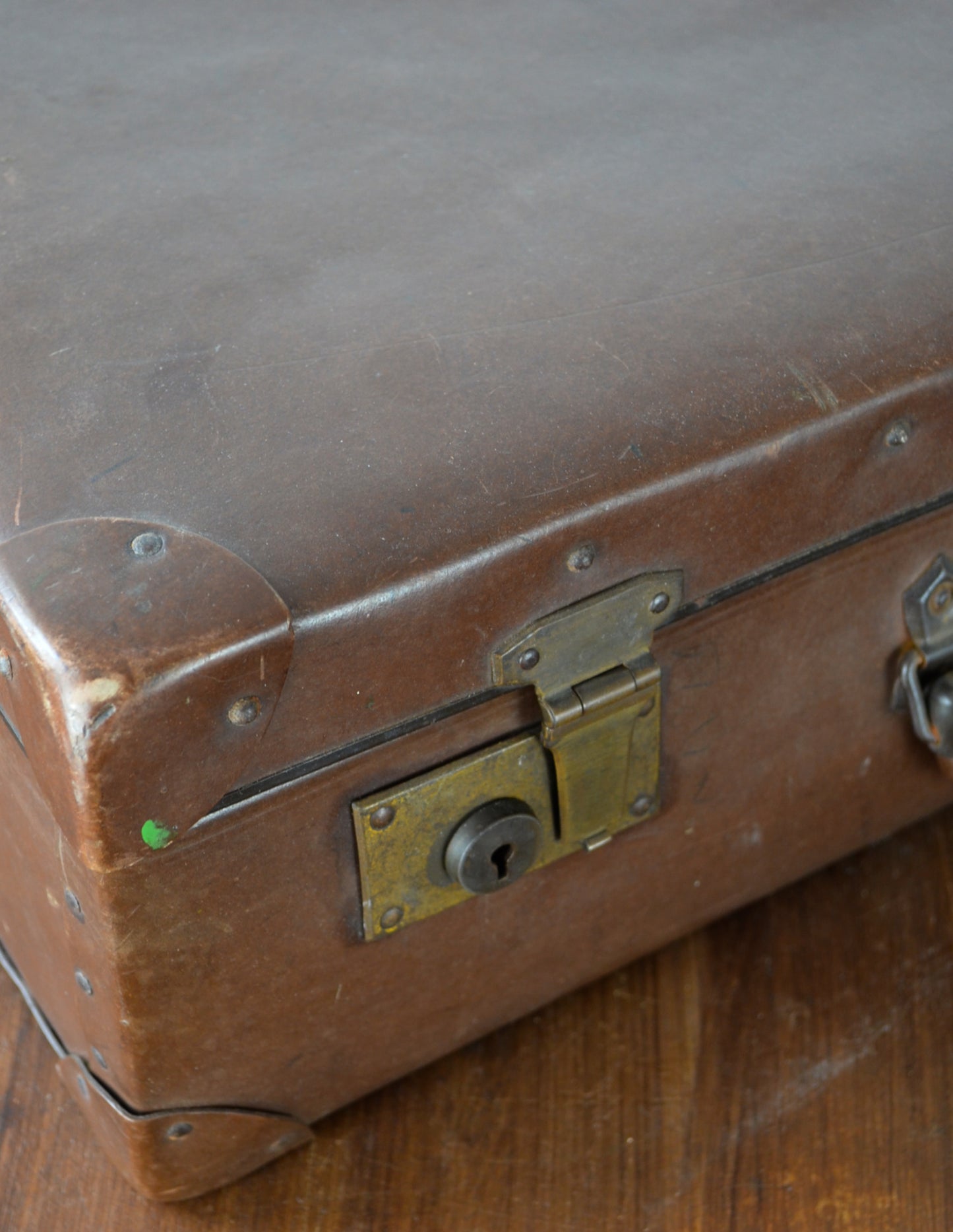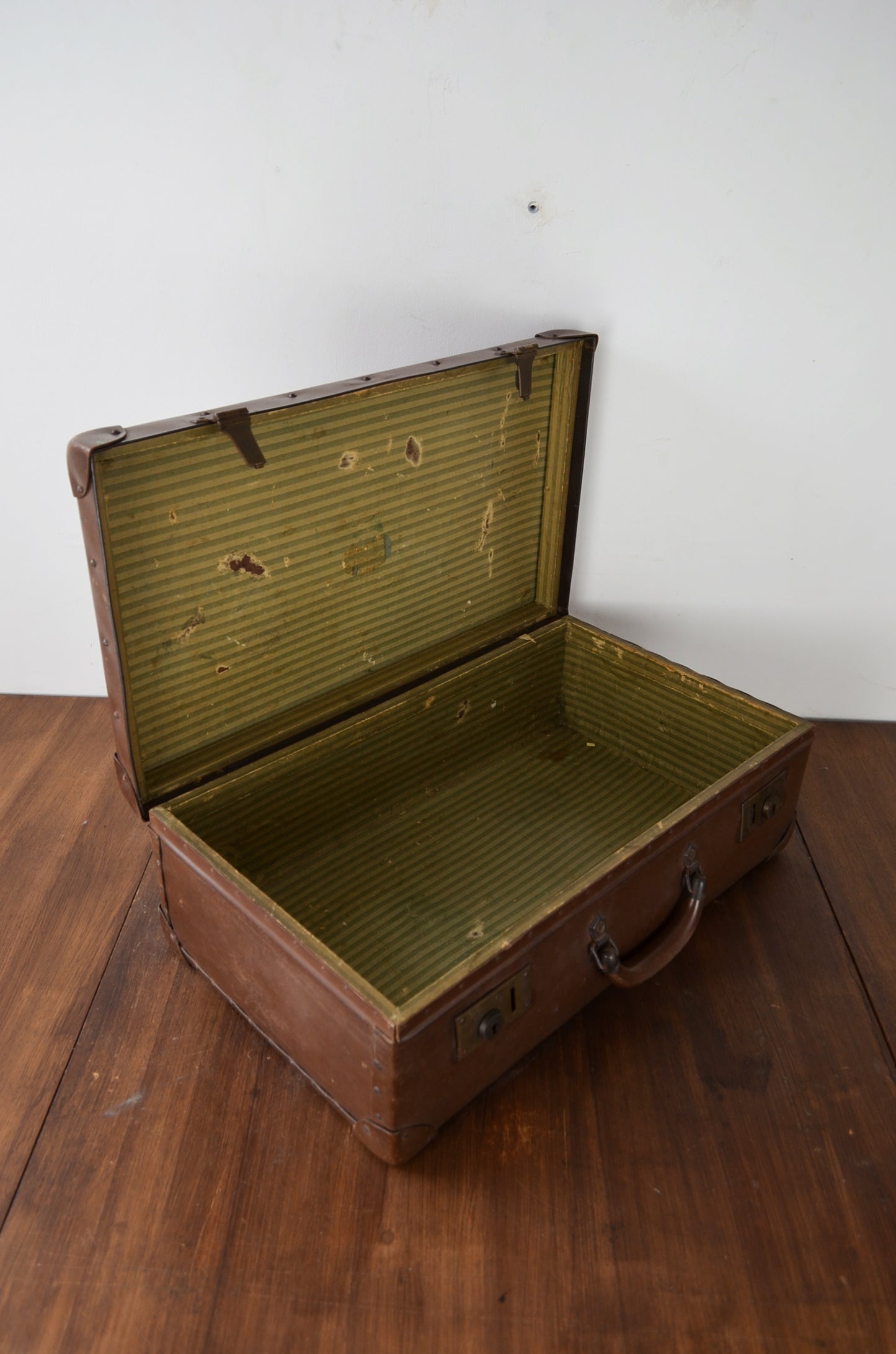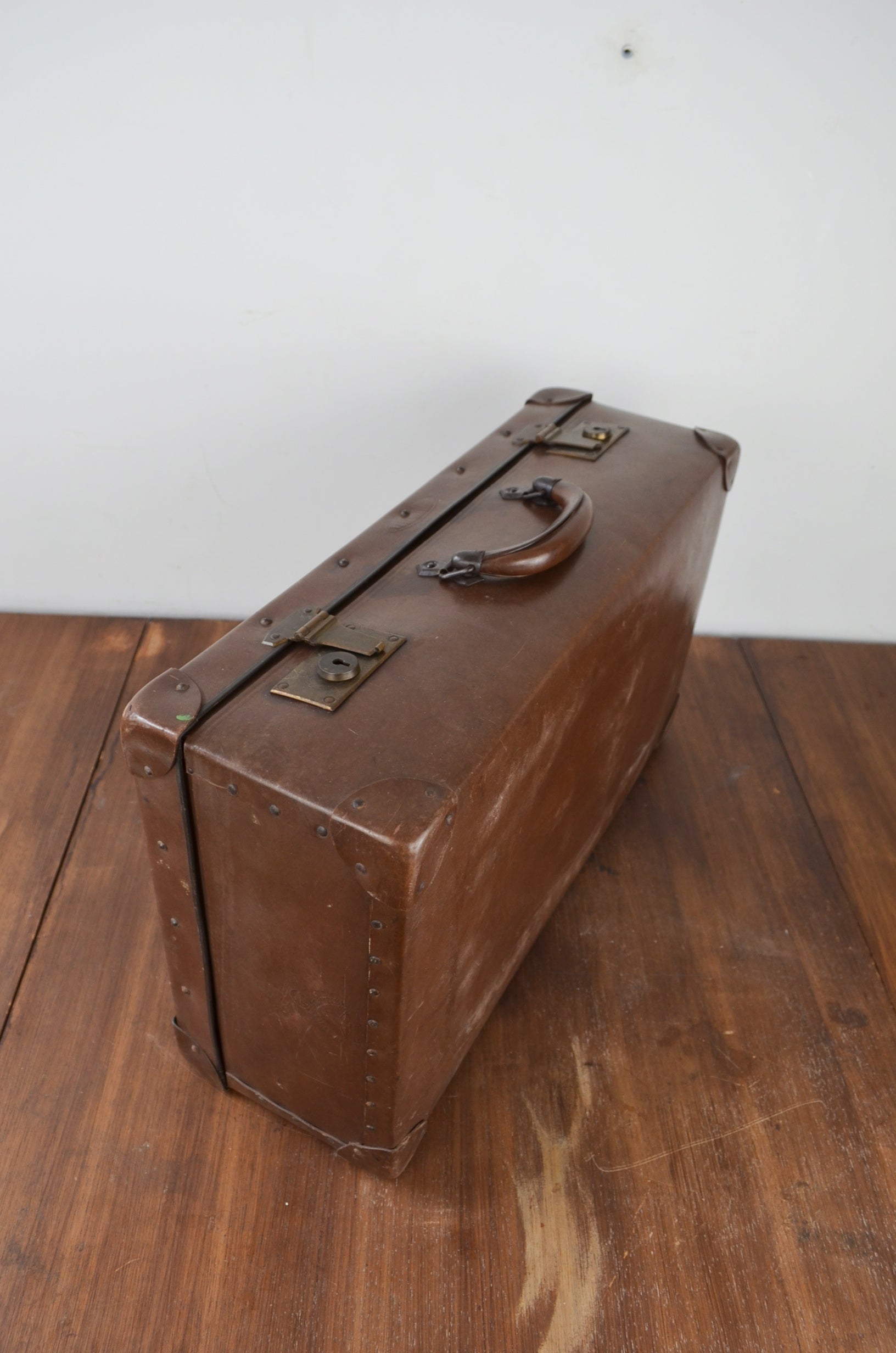 A German Globe Trotter mid 20th century hardened canvas/hard fibre suitcase with brass catches and paper covered interior. A good decorative piece, great for storage.